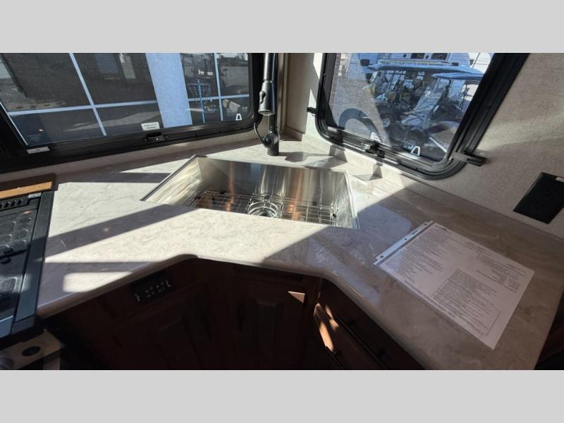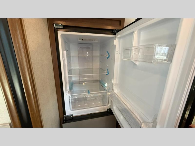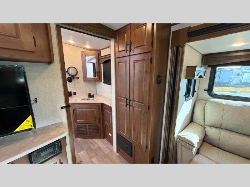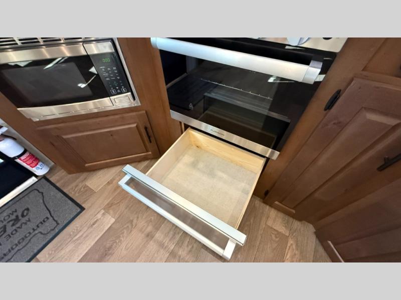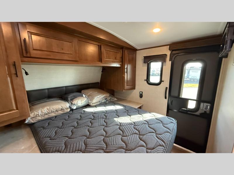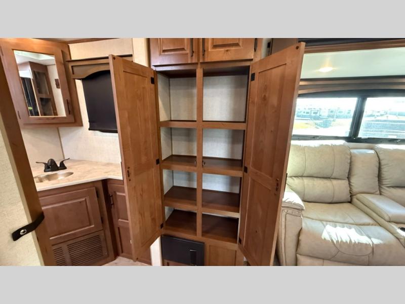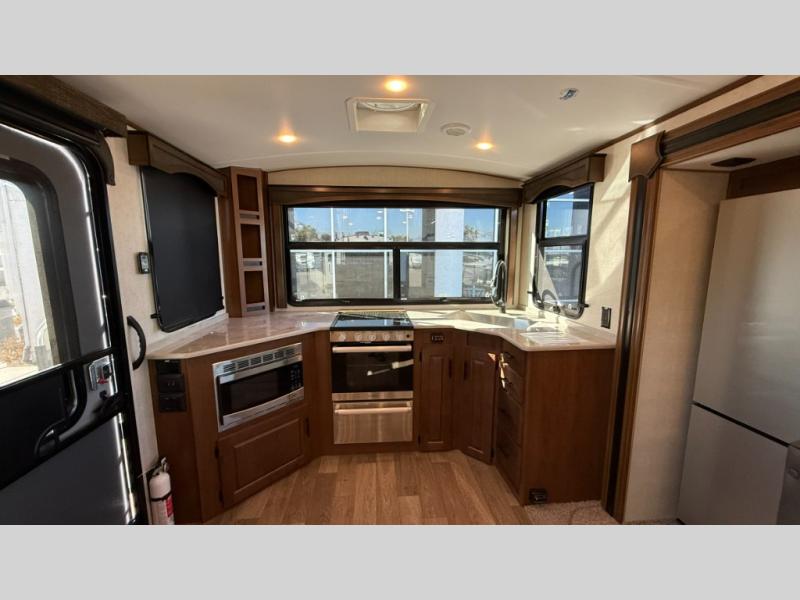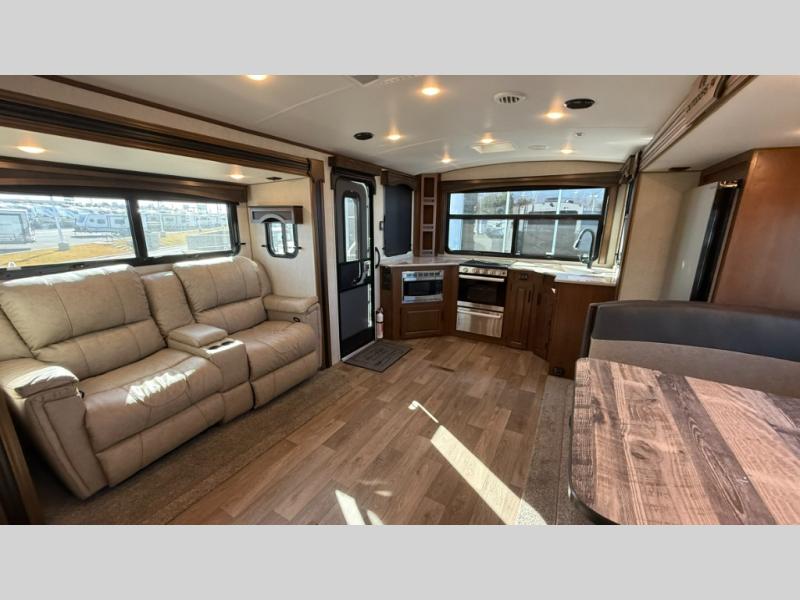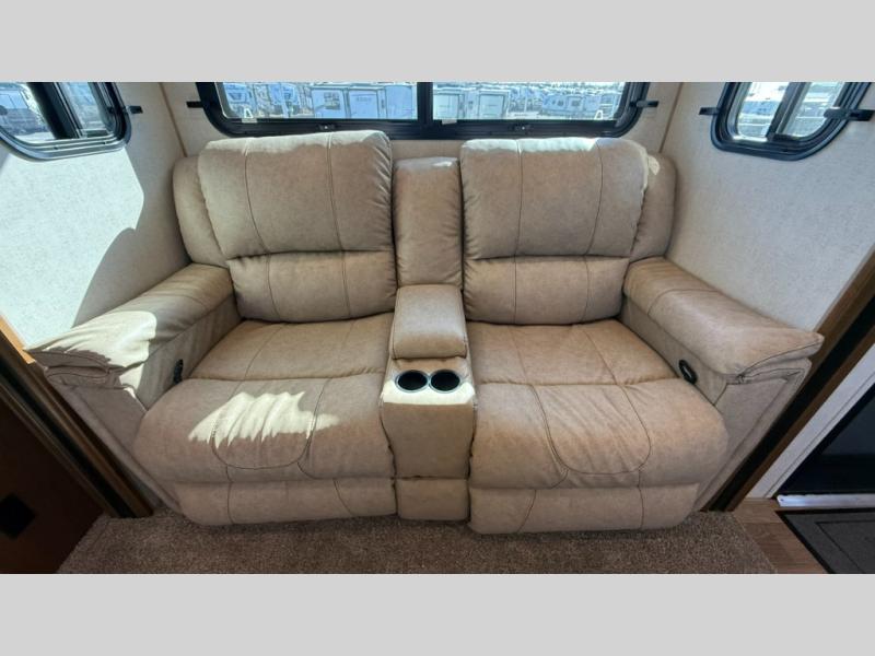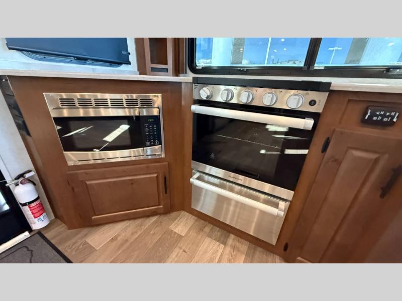 Dual entry doors in this travel trailer will allow you to enter in through the rear kitchen or the front master bedroom. A walk-through bath is easily accessible for everyone, and the main living area is made open thanks to the dual opposing slides. While dinner is being made on the three burner cooktop, you can play a game at the mountain dinette, or relax on the sofa with built-in recliners and watch a movie on the swing-out 40" TV. You'll appreciate plenty of storage space in this model, including a pantry, wardrobes on either side of the bed, plus a wardrobe slide in the bedroom for your favorite outfits!