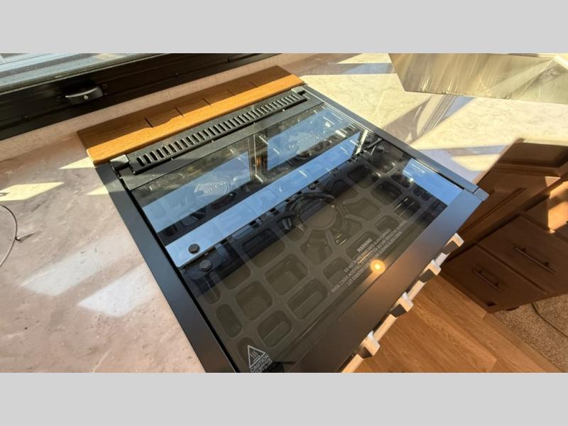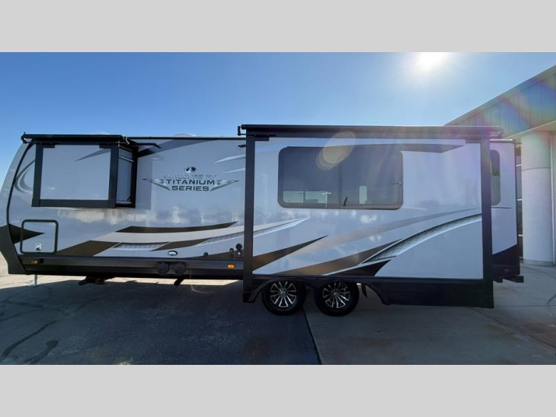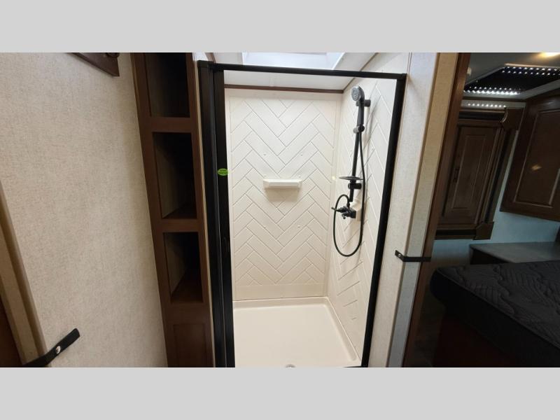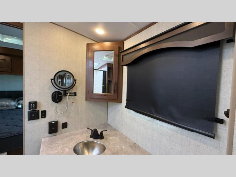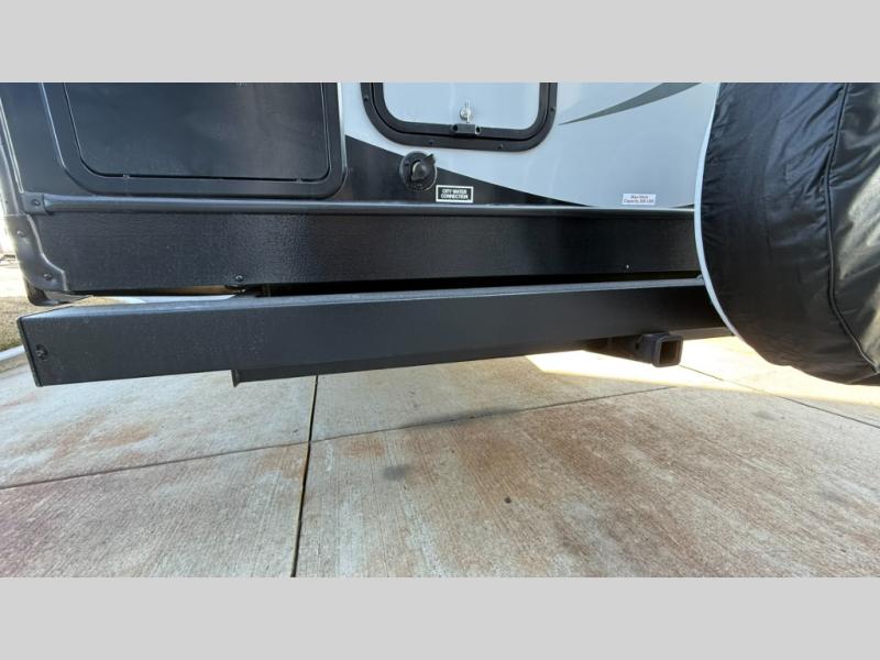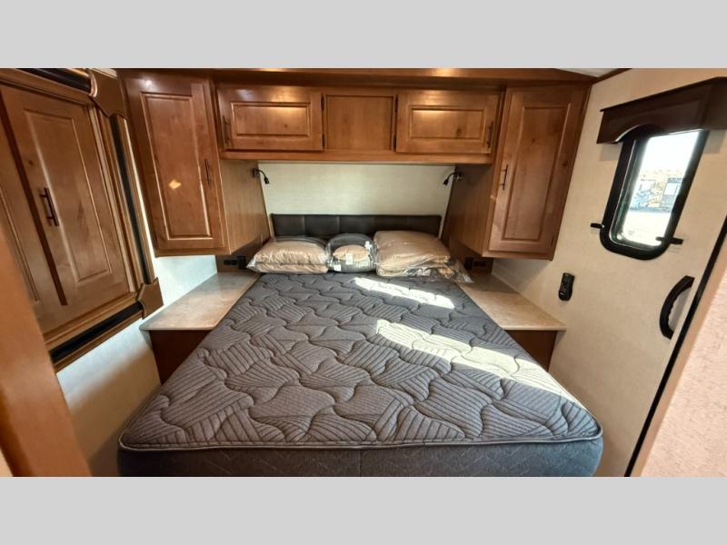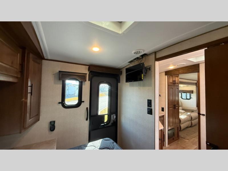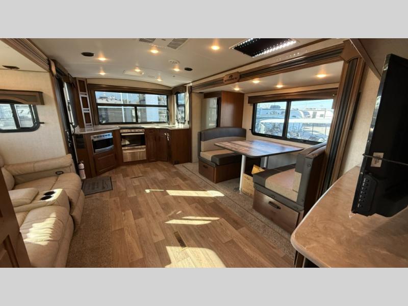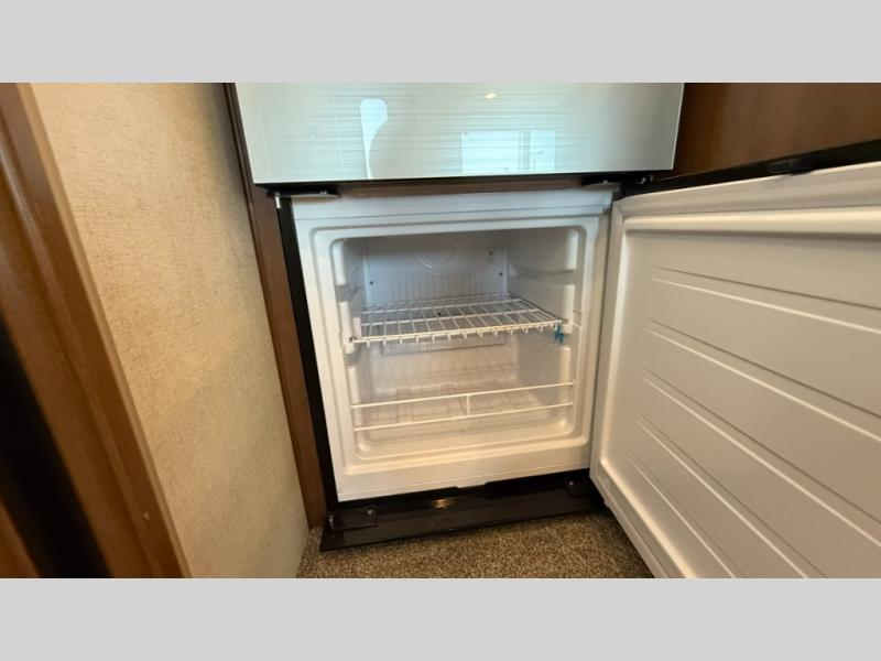 Dual entry doors in this travel trailer will allow you to enter in through the rear kitchen or the front master bedroom. A walk-through bath is easily accessible for everyone, and the main living area is made open thanks to the dual opposing slides. While dinner is being made on the three burner cooktop, you can play a game at the mountain dinette, or relax on the sofa with built-in recliners and watch a movie on the swing-out 40" TV. You'll appreciate plenty of storage space in this model, including a pantry, wardrobes on either side of the bed, plus a wardrobe slide in the bedroom for your favorite outfits!