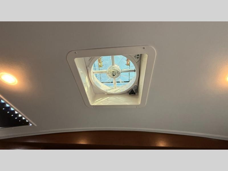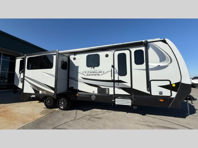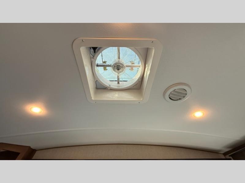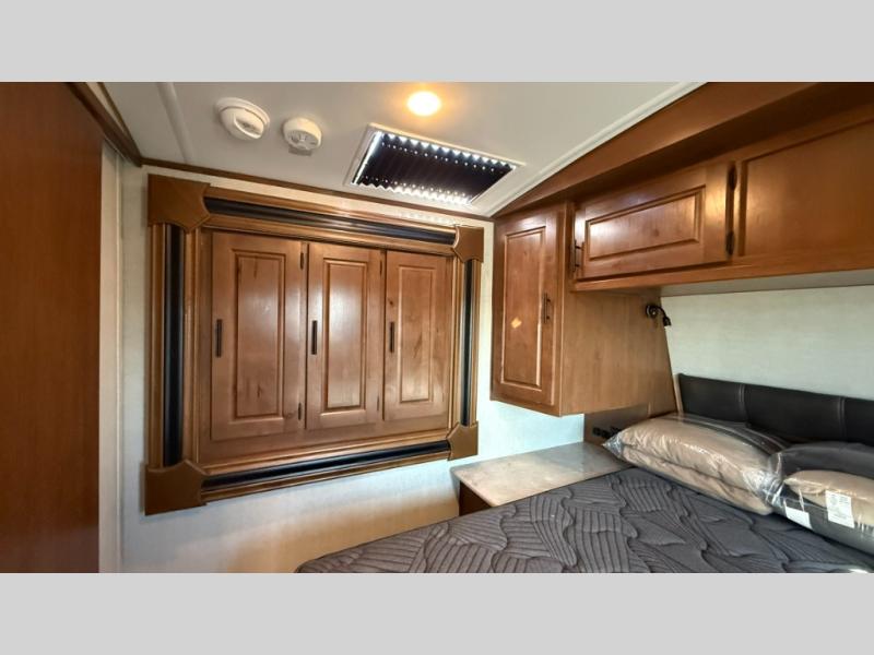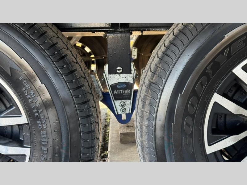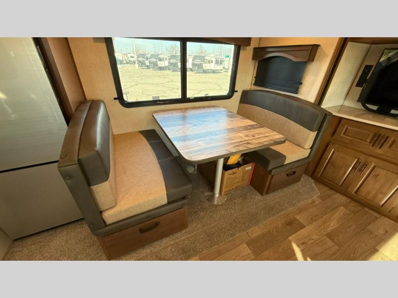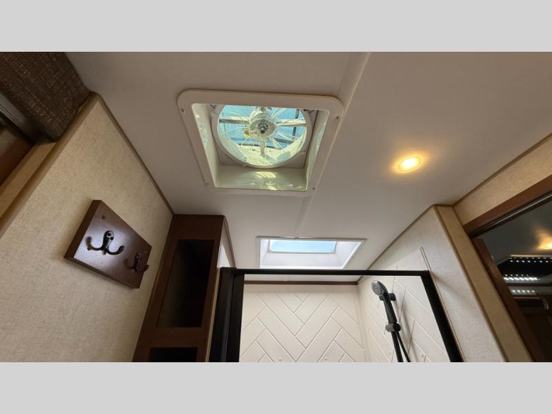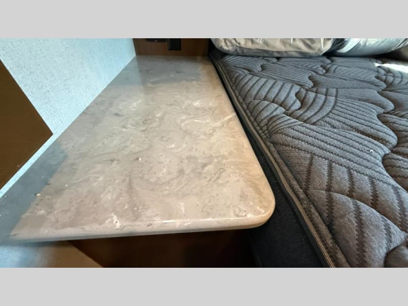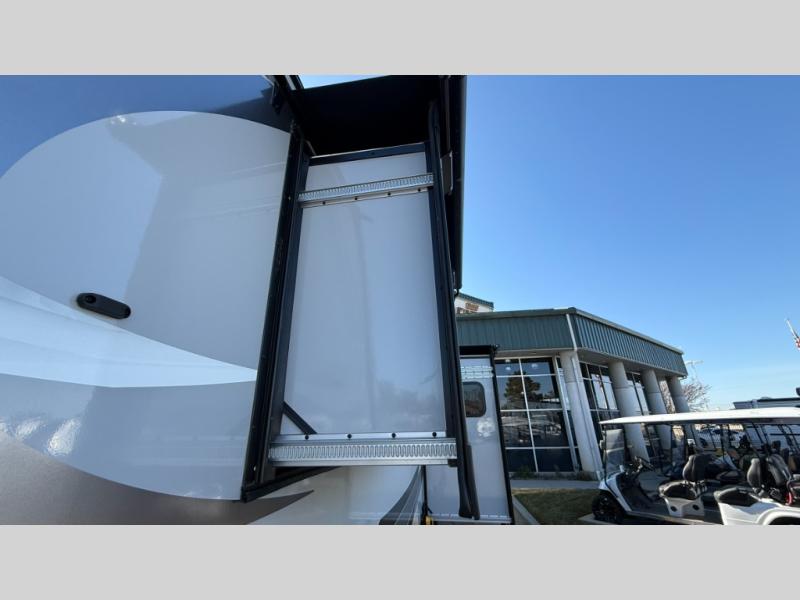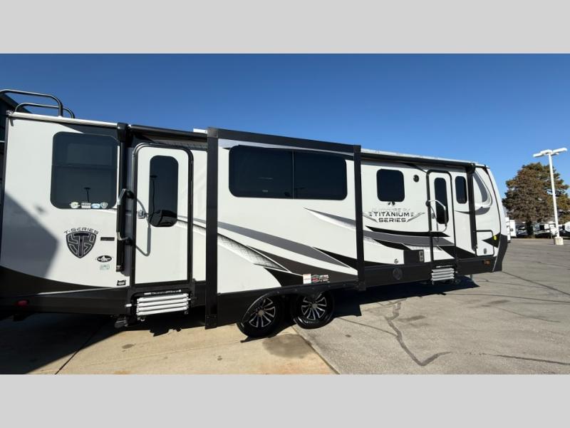 Dual entry doors in this travel trailer will allow you to enter in through the rear kitchen or the front master bedroom. A walk-through bath is easily accessible for everyone, and the main living area is made open thanks to the dual opposing slides. While dinner is being made on the three burner cooktop, you can play a game at the mountain dinette, or relax on the sofa with built-in recliners and watch a movie on the swing-out 40" TV. You'll appreciate plenty of storage space in this model, including a pantry, wardrobes on either side of the bed, plus a wardrobe slide in the bedroom for your favorite outfits!
