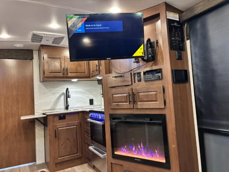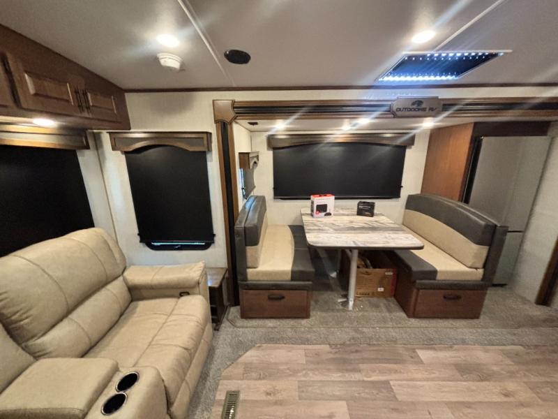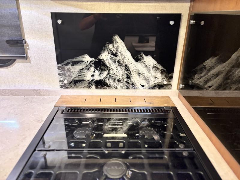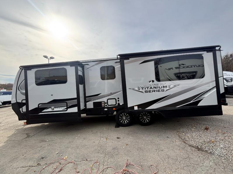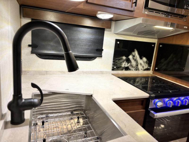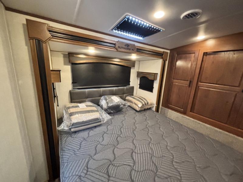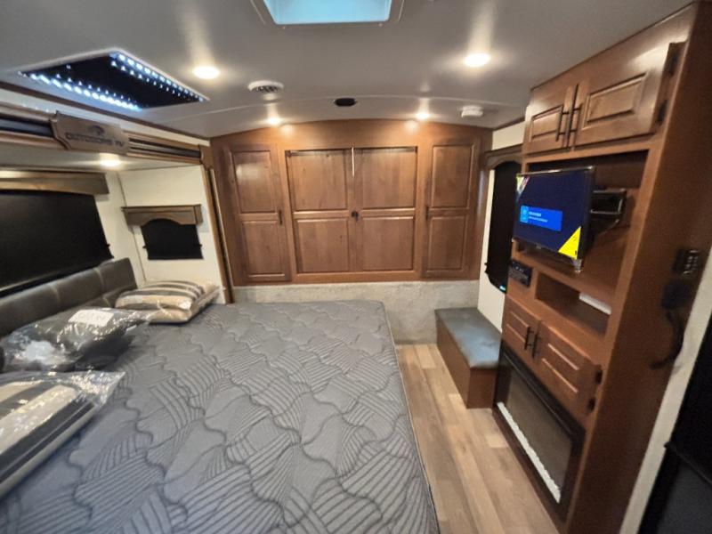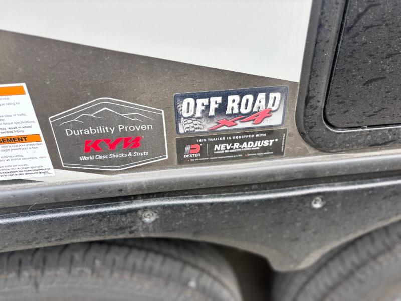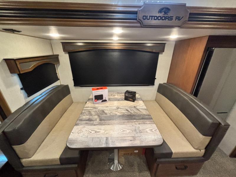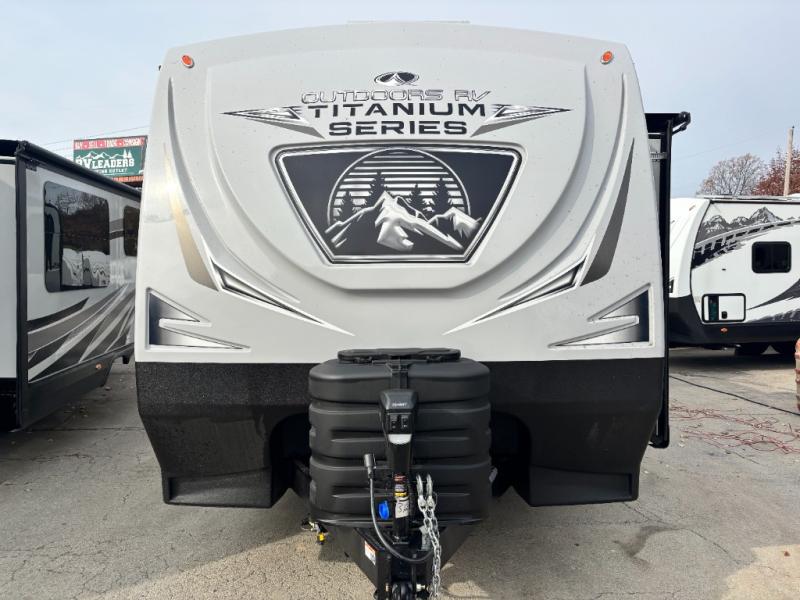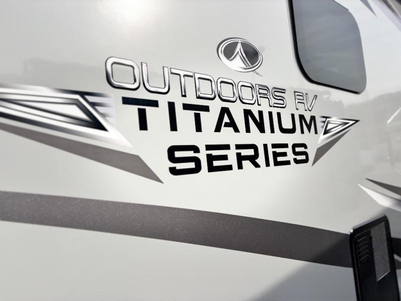 With any Black Stone Titanium Series travel trailer by Outdoors RV you will enjoy the sleek design frameless thermal pane windows, along with the silver fiberglass front cap and Titanium Series graphics package. The rugged 8' chassis with 5,200 lb. axles and XL ground clearance will make maneuvering tougher terrain easier than ever, and there is a ground control TT auto leveling system for hassle-free set-up. Each model includes LG solid surface countertops, mountain lodge interiors, hardwood slide out fascia(s), and many more comforts!