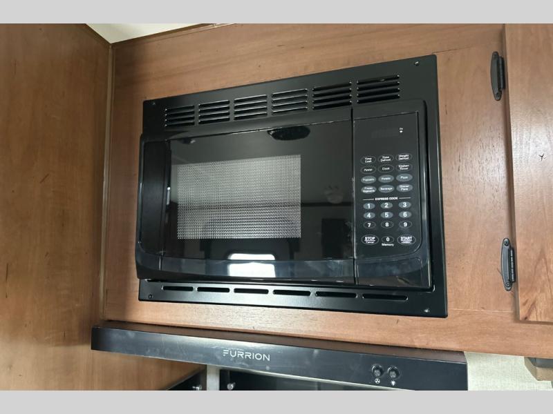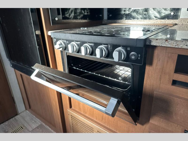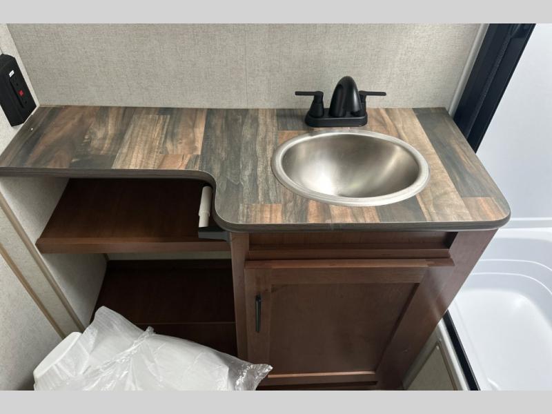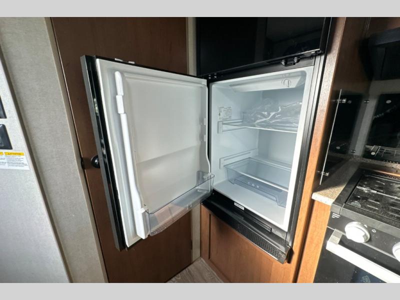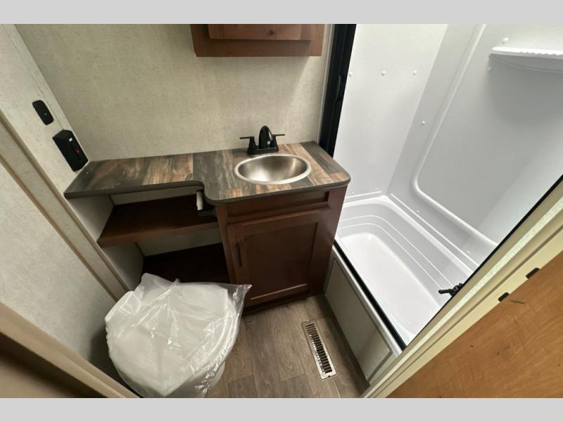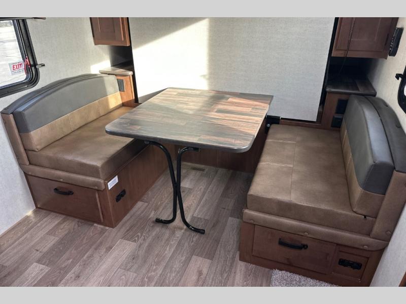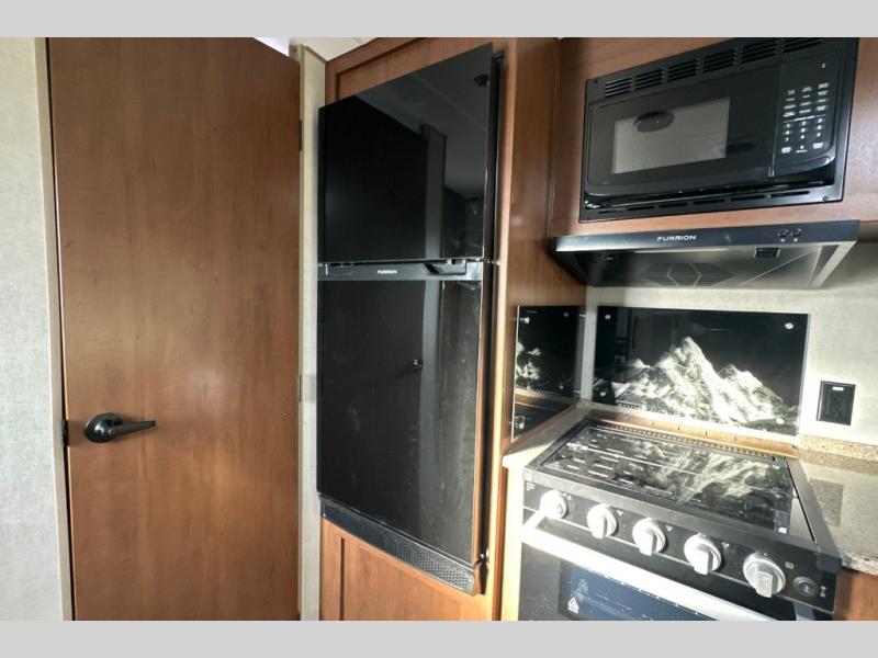 This travel trailer will be perfect for weekend trips in the woods! Once you enter the unit, you'll find a pantry where you can grab a snack from, plus a spacious full bath to freshen up after hiking. The slide out not only gives you more space, but it also houses the residential sofa with built-in recliners, or you can choose the optional sleeper sofa here if you need more sleeping space. A full kitchen lets you make meals for your crew, and a fold-down dinette table will be the perfect spot to dine together. There is also a queen wall/Murphy bed that fold down over the dinette when you're ready for bed!