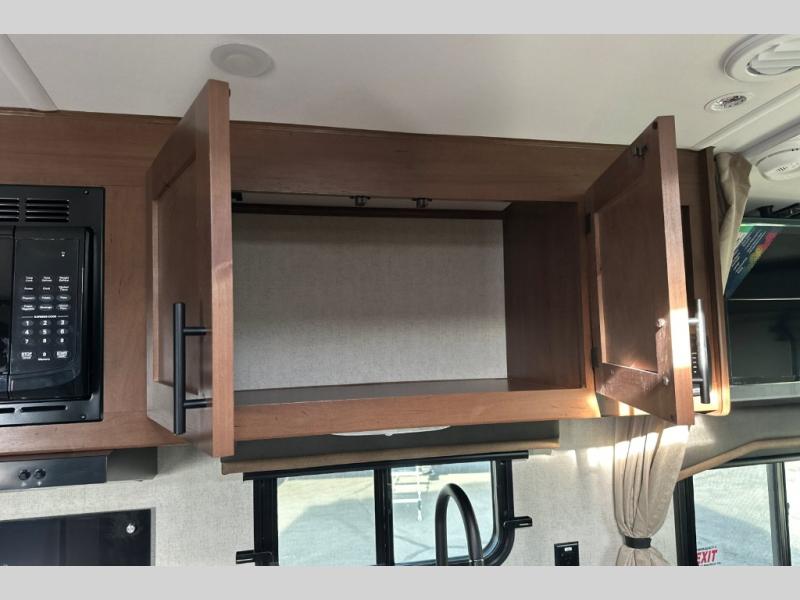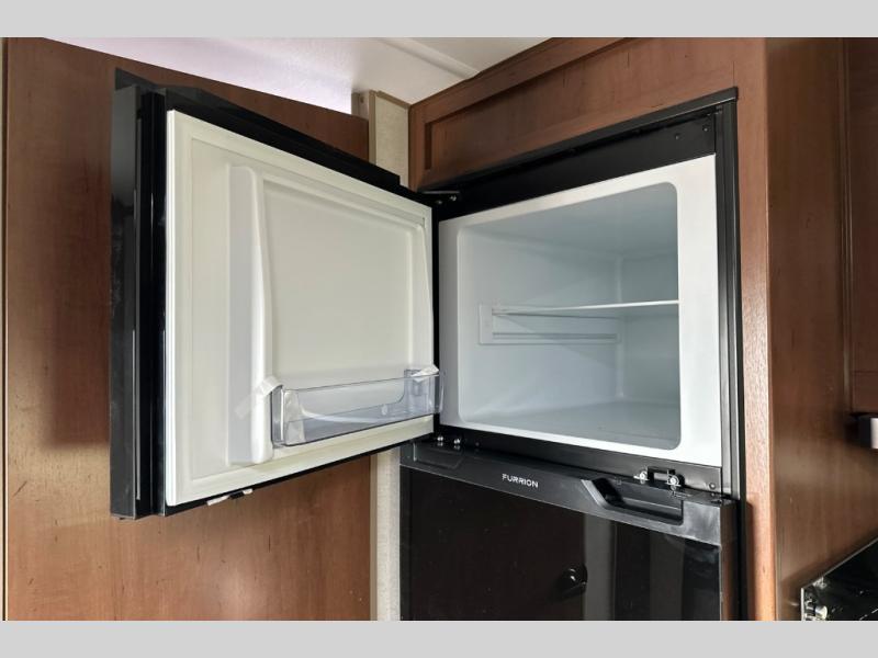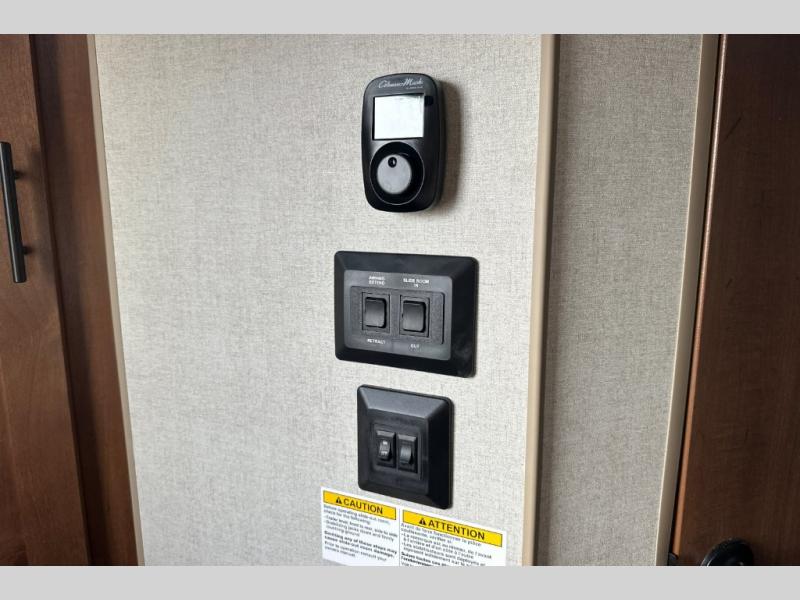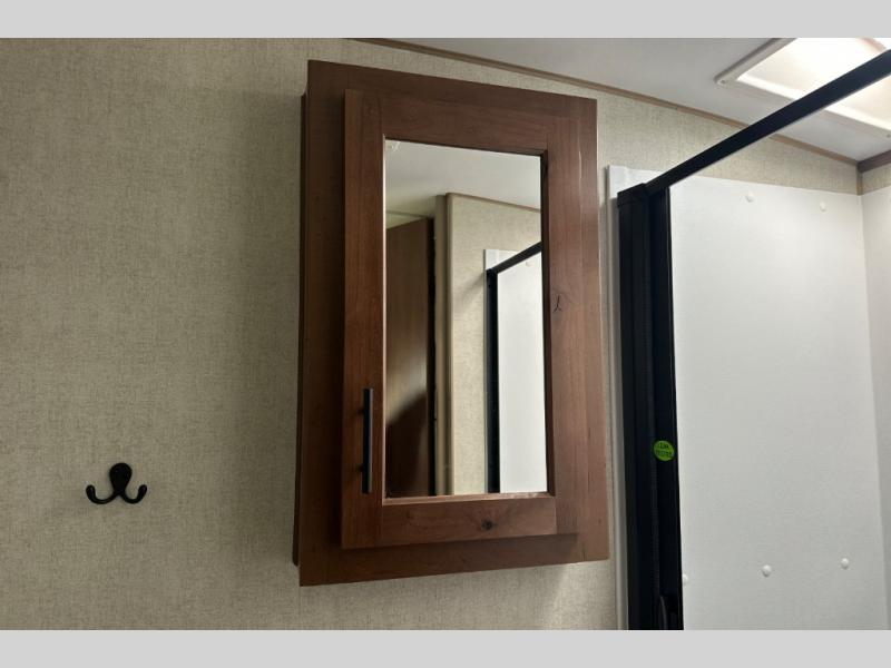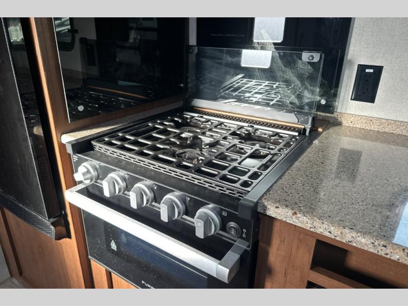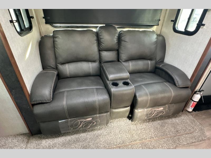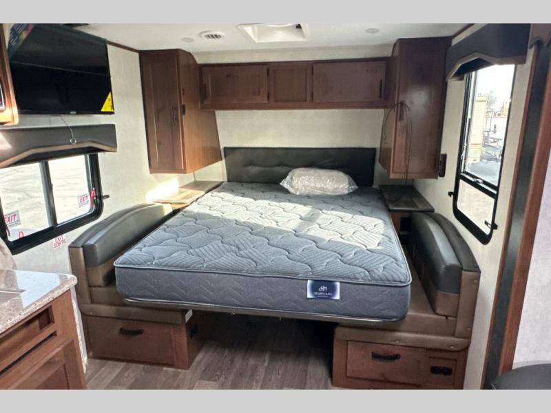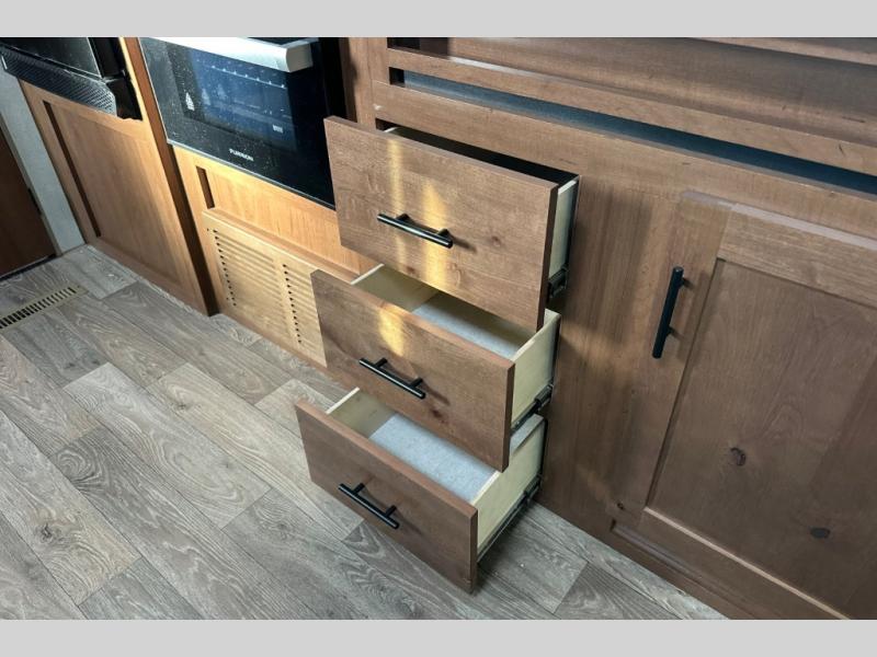 This travel trailer will be perfect for weekend trips in the woods! Once you enter the unit, you'll find a pantry where you can grab a snack from, plus a spacious full bath to freshen up after hiking. The slide out not only gives you more space, but it also houses the residential sofa with built-in recliners, or you can choose the optional sleeper sofa here if you need more sleeping space. A full kitchen lets you make meals for your crew, and a fold-down dinette table will be the perfect spot to dine together. There is also a queen wall/Murphy bed that fold down over the dinette when you're ready for bed!