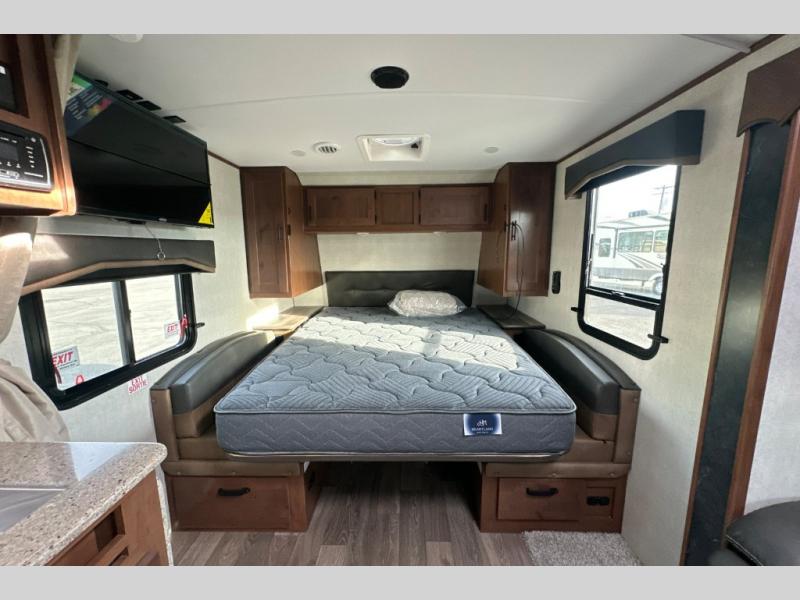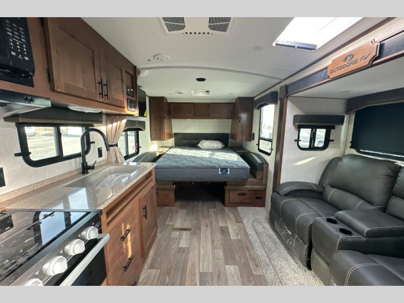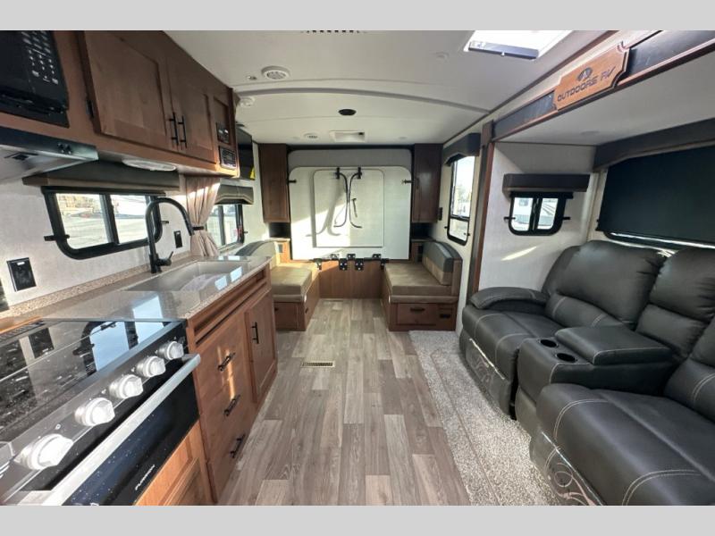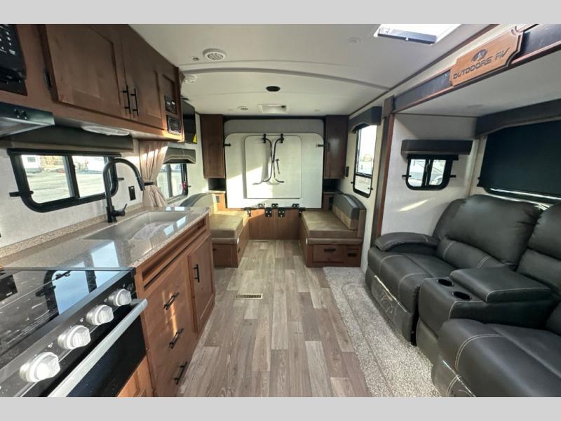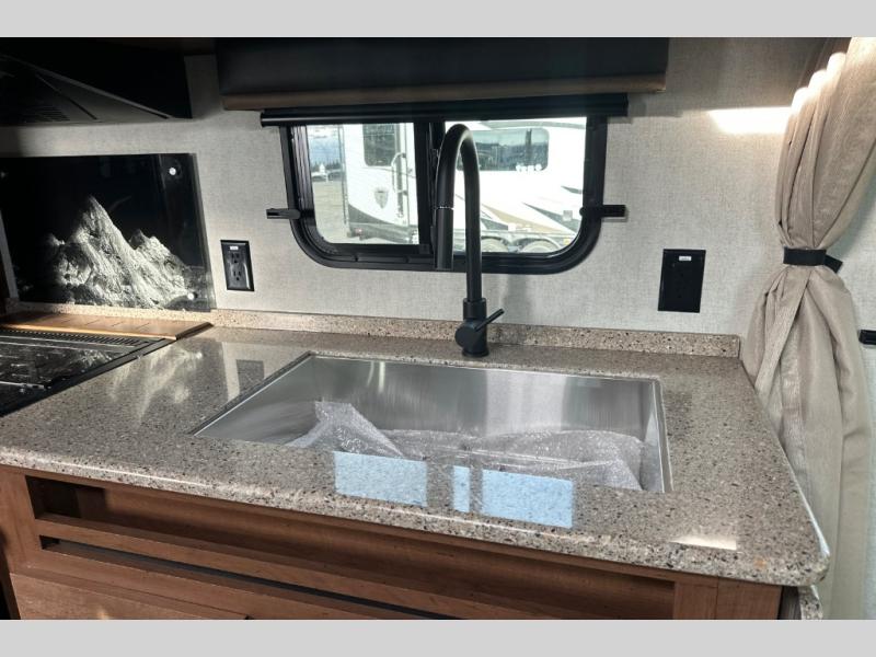 Each Creek Side Mountain Series travel trailer by Outdoors RV is designed for mountain tough four seasons camping for all your adventures. You'll find mountain extreme thermal pane windows, triple layered four seasons roof insulation, and a unique heated, insulated holding tank design. The compact design is compatible for light duty tow vehicles and smaller campsites, so you may not even need to purchase a new vehicle to start camping. Each model includes LG solid surface countertops, ultra leather furniture, and XL panoramic slide out windows for great outdoor views. These travel trailers also feature a mountain comfort premium mattress, 12V USB ports on either side of the bed, and drawers under the bed for convenient storage.
