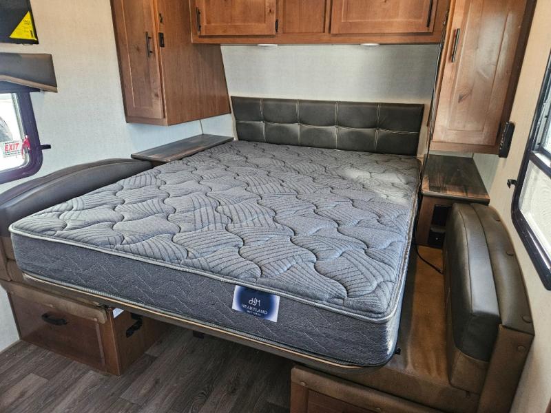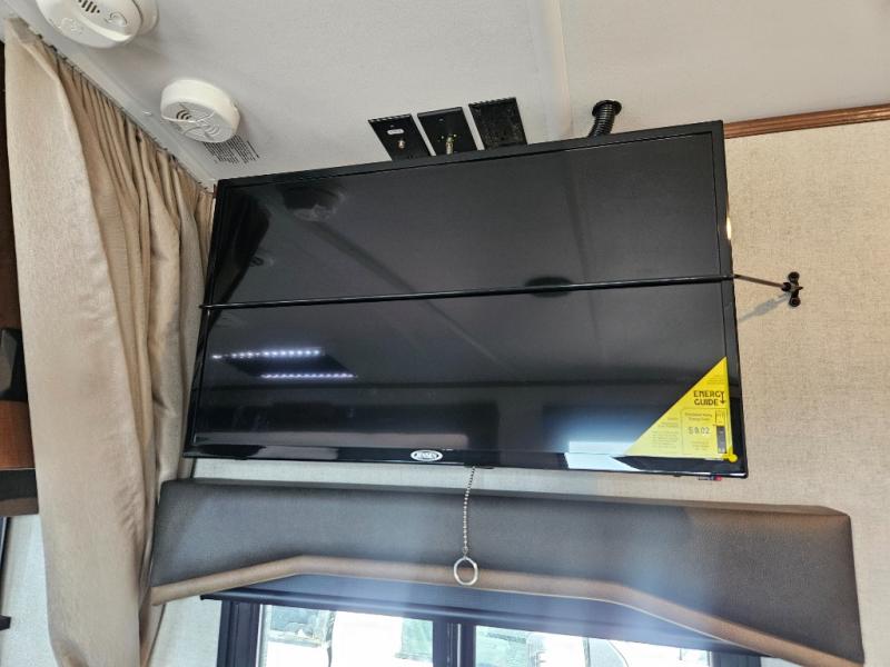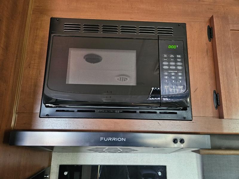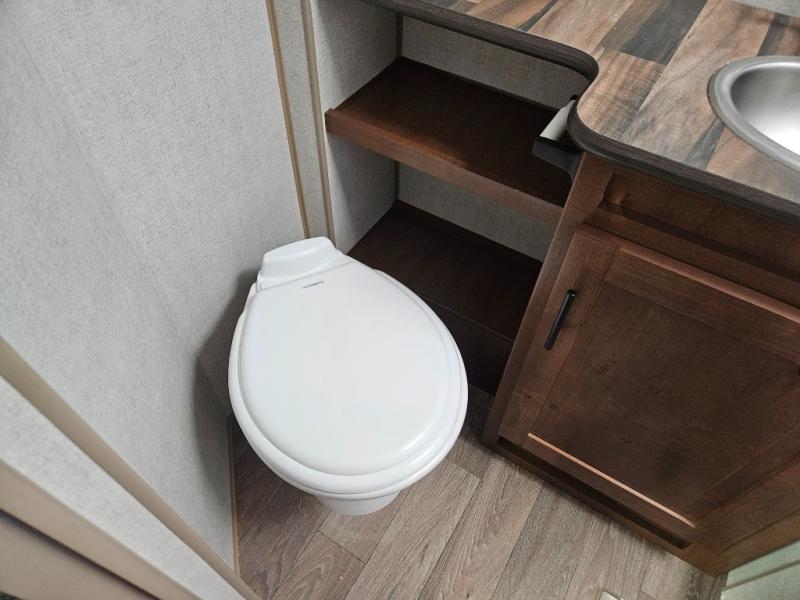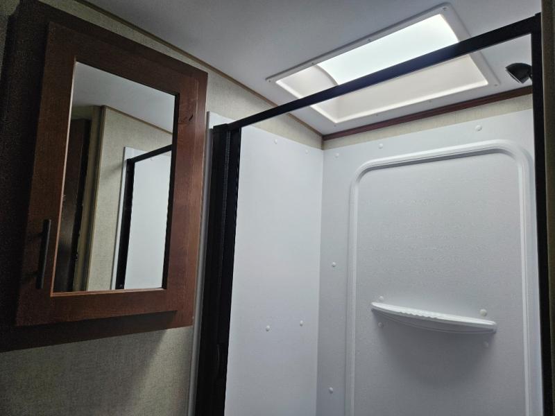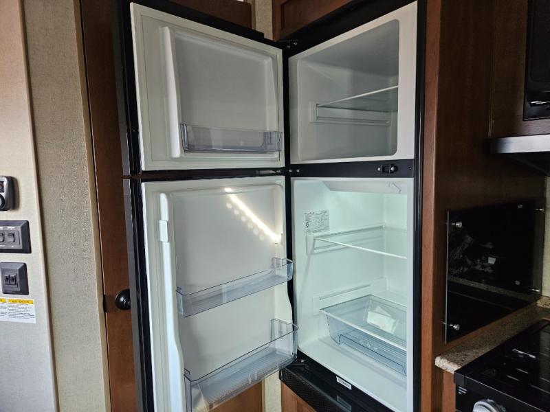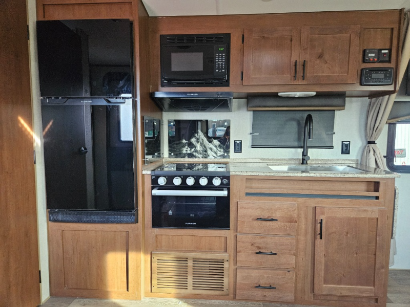 This travel trailer will be perfect for weekend trips in the woods! Once you enter the unit, you'll find a pantry where you can grab a snack from, plus a spacious full bath to freshen up after hiking. The slide out not only gives you more space, but it also houses the residential sofa with built-in recliners, or you can choose the optional sleeper sofa here if you need more sleeping space. A full kitchen lets you make meals for your crew, and a fold-down dinette table will be the perfect spot to dine together. There is also a queen wall/Murphy bed that fold down over the dinette when you're ready for bed!