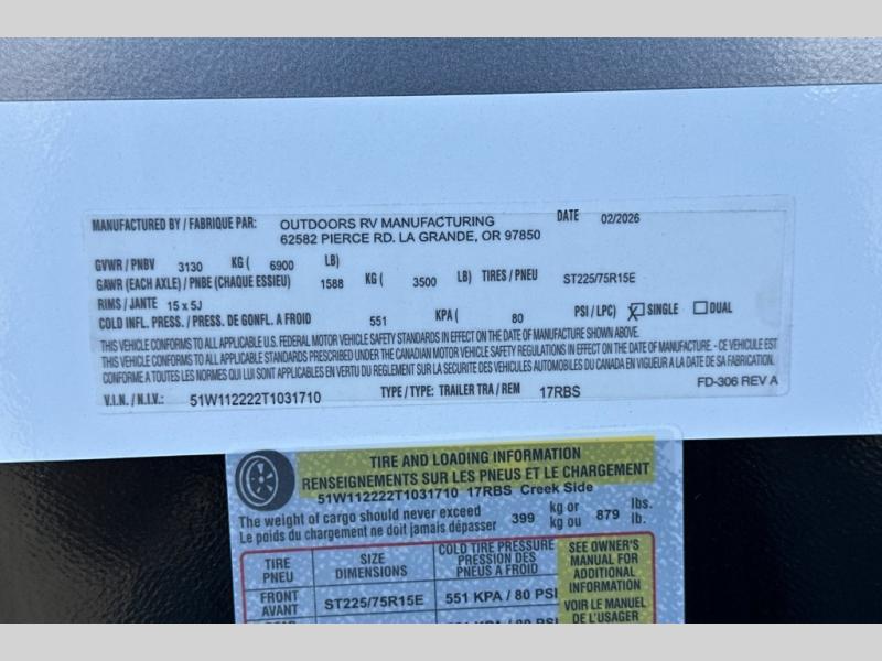 New 2026 Outdoors RV Creek Side Mountain Series 17RBS Travel Trailer