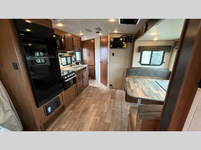 Camping in the mountains has never been more relaxing than in this single slide out travel trailer. You will have a full bath to clean up in each morning, and a three burner cooktop in the kitchen to prepare breakfast. The mountain dinette slide will be perfect for dining together, and if you have any overnight guests, they can sleep here. You will have the queen bed all to yourselves up front with dual bedroom wardrobes to keep your clothes tidy. This model also includes a 17' awning so you can visit outdoors protected from the elements.