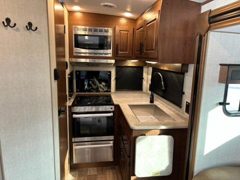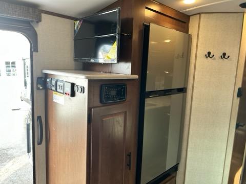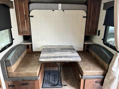 Versatility and comfort is found in this spacious travel trailer. There is a queen Murphy bed up front that can fold away into the wall so you can dine at the fold down booth dinette. The residential sofa with built-in recliners will be the perfect place to relax as you watch a movie on the TV, and the single slide out here will provide more interior space. This model includes a rear corner kitchen with plenty of counter space to prep meals and the full bath is in the other rear corner for privacy. You'll also enjoy the shower skylight for more head room, plus a living area skylight for more natural light.