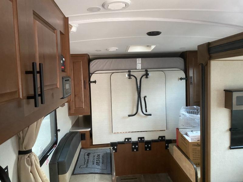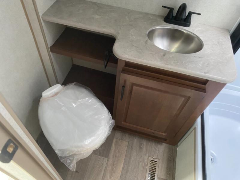 This travel trailer will be perfect for weekend trips in the woods! Once you enter the unit, you'll find a pantry where you can grab a snack from, plus a spacious full bath to freshen up after hiking. The slide out not only gives you more space, but it also houses the residential sofa with built-in recliners, or you can choose the optional sleeper sofa here if you need more sleeping space. A full kitchen lets you make meals for your crew, and a fold-down dinette table will be the perfect spot to dine together. There is also a queen wall/Murphy bed that fold down over the dinette when you're ready for bed!