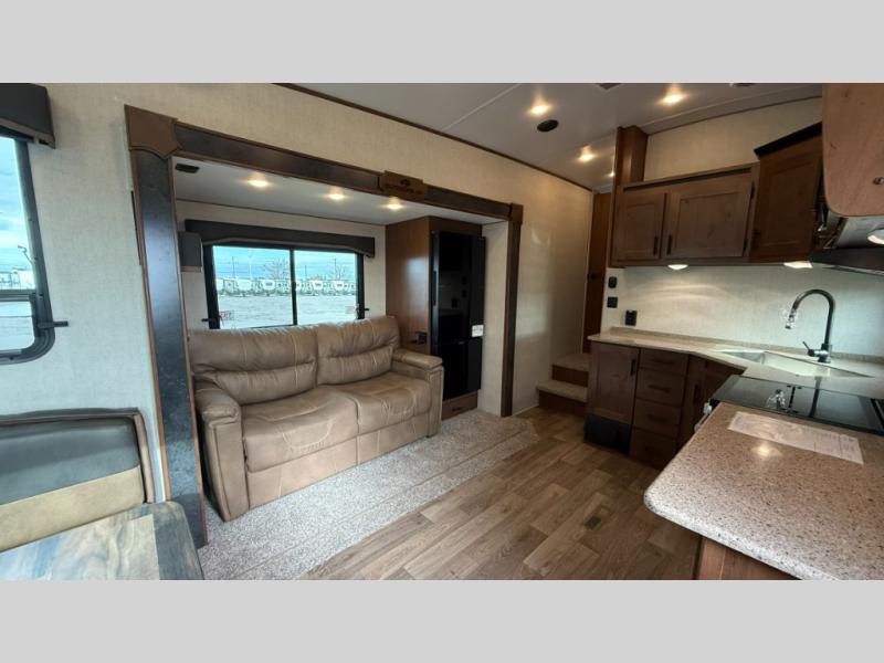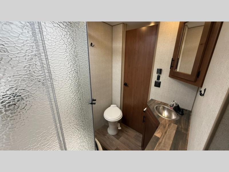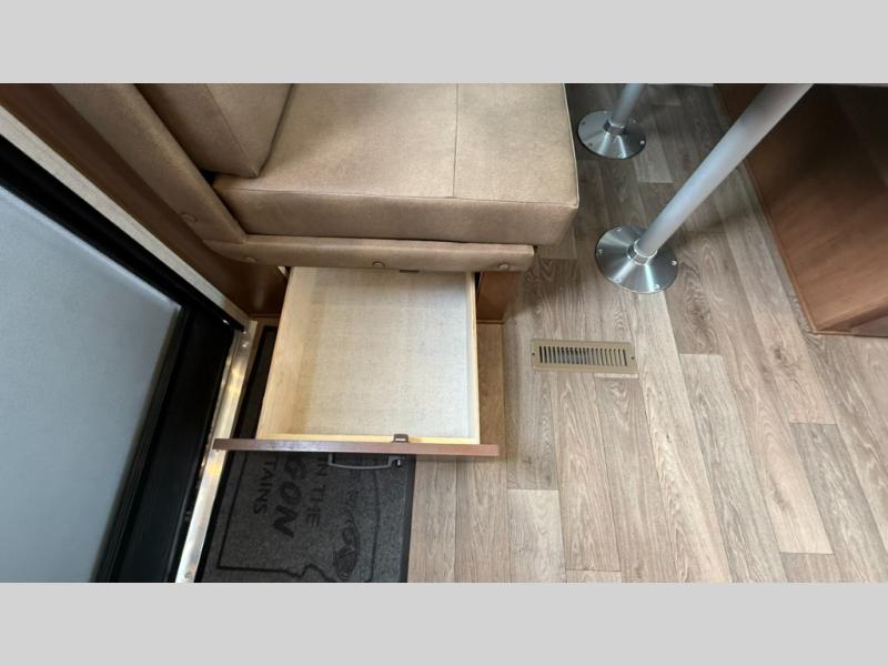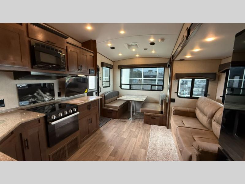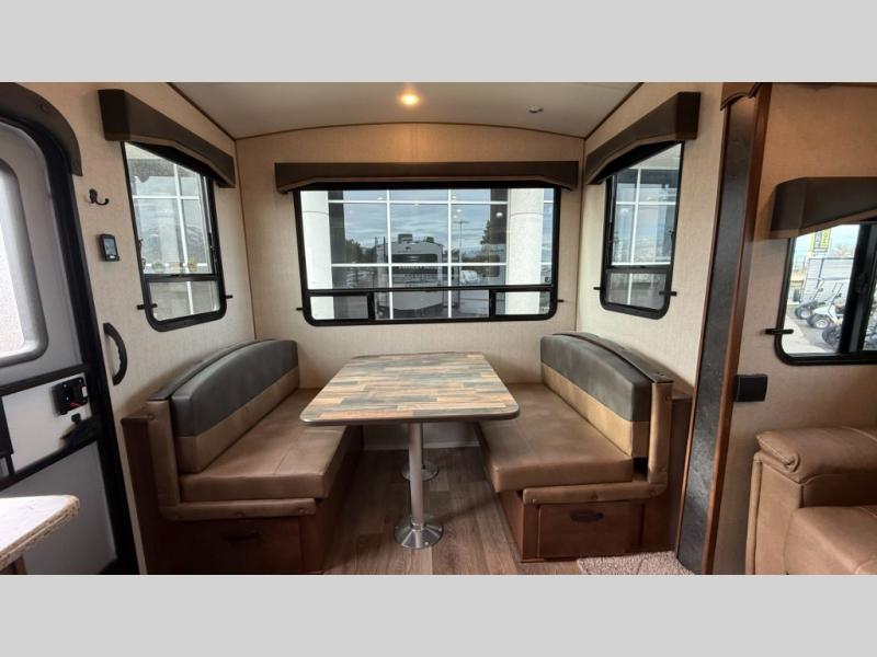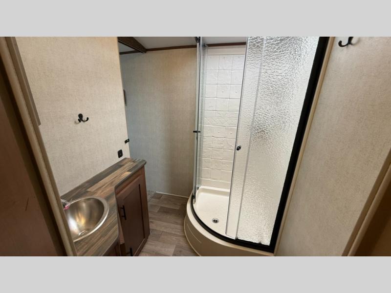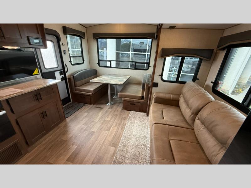 Enjoy time at the campground in this spacious travel trailer. There is a sleeper sofa slide out that will provide more floor space, along with sleeping space for guests! Once the chef makes dinner in the full kitchen, you can dine at the 45" x 84" mountain dinette. A full bath with a radius shower will let you clean up each day, and the front private bedroom will make you feel right at home. There is also a wardrobe slide here to give you additional storage and floor space!