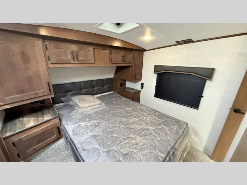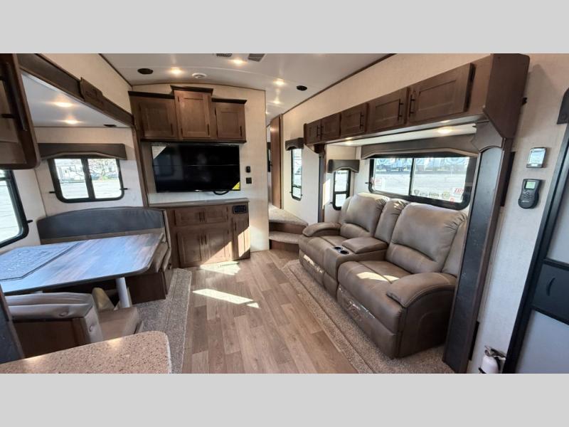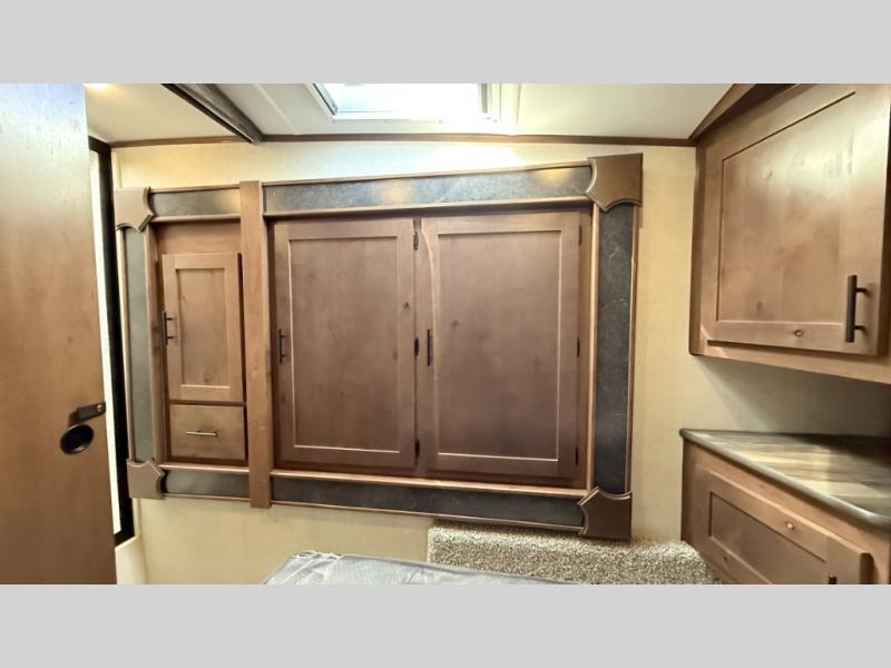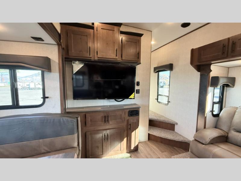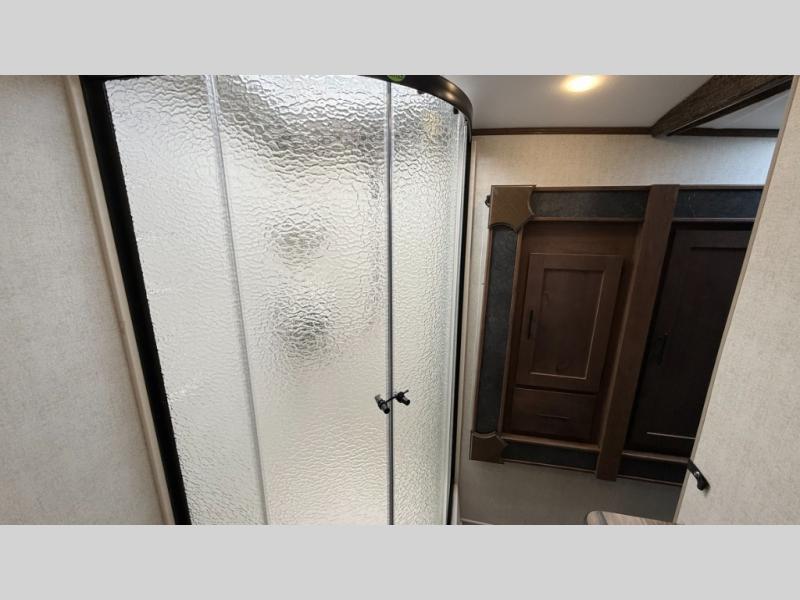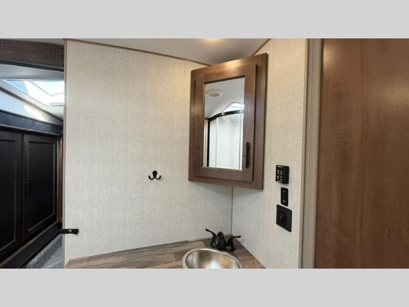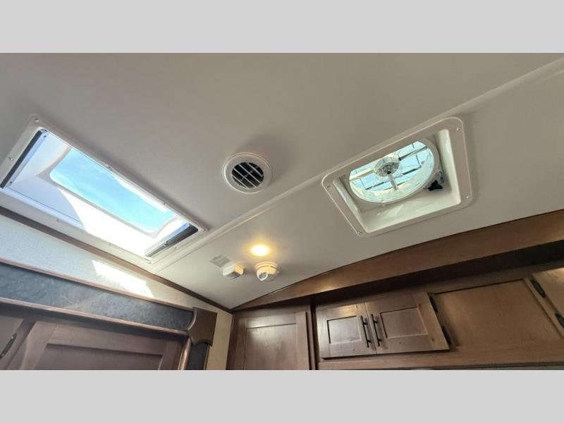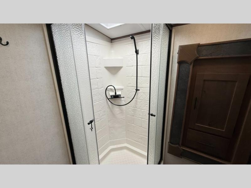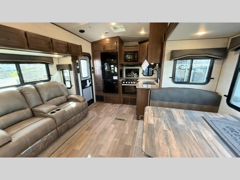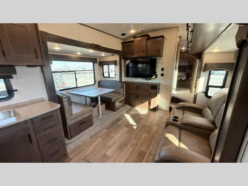 Load up and hit the road with this fifth wheel that offers a spacious interior with dual opposing slides near the rear kitchen. You can relax on the dinette, or the sofa as you use the built-in recliners to stretch out and watch the 50" TV. There is a pantry near the entry for easy access before heading out for a hike. The double entry bathroom is convenient, and includes a radius shower with a skylight for more headroom and natural lighting. There is also easy access from the front bedroom where you will find a queen bed, beside storage as well a slide out wardrobe that stretches into the bathroom with linen storage.
