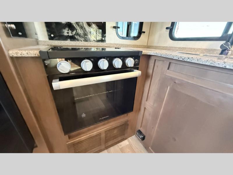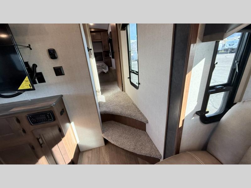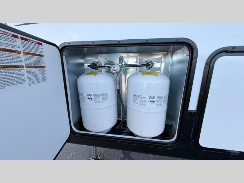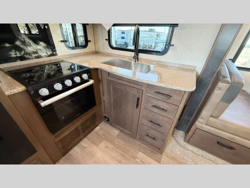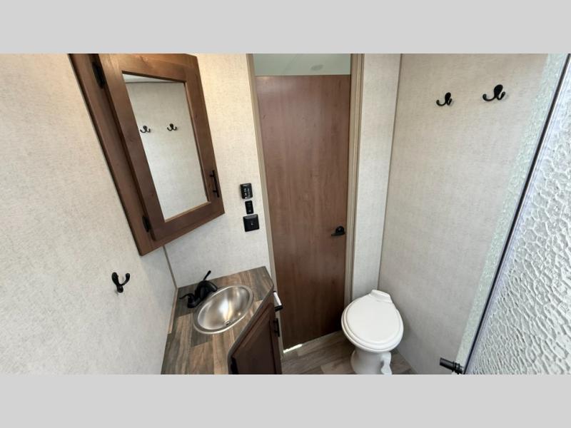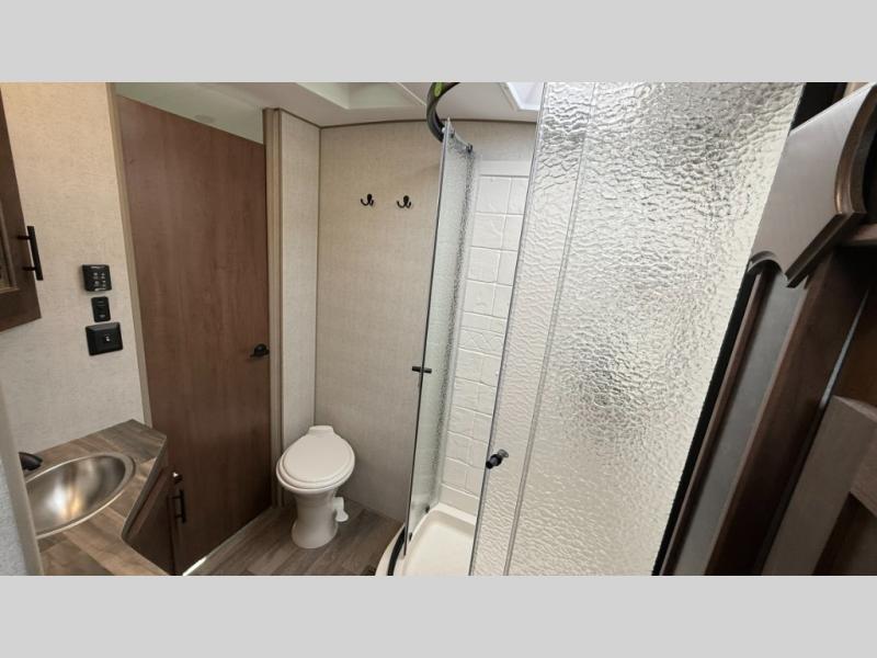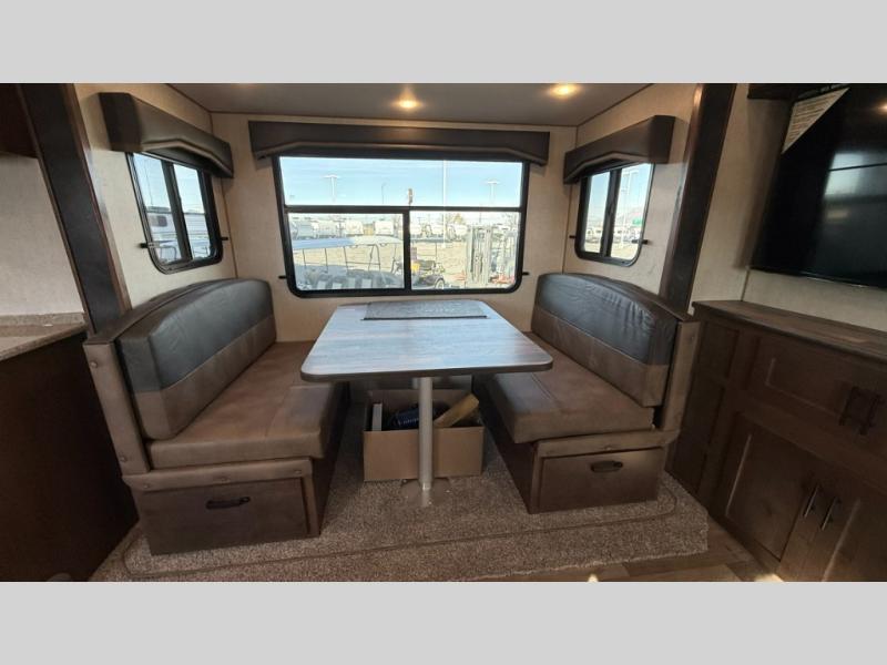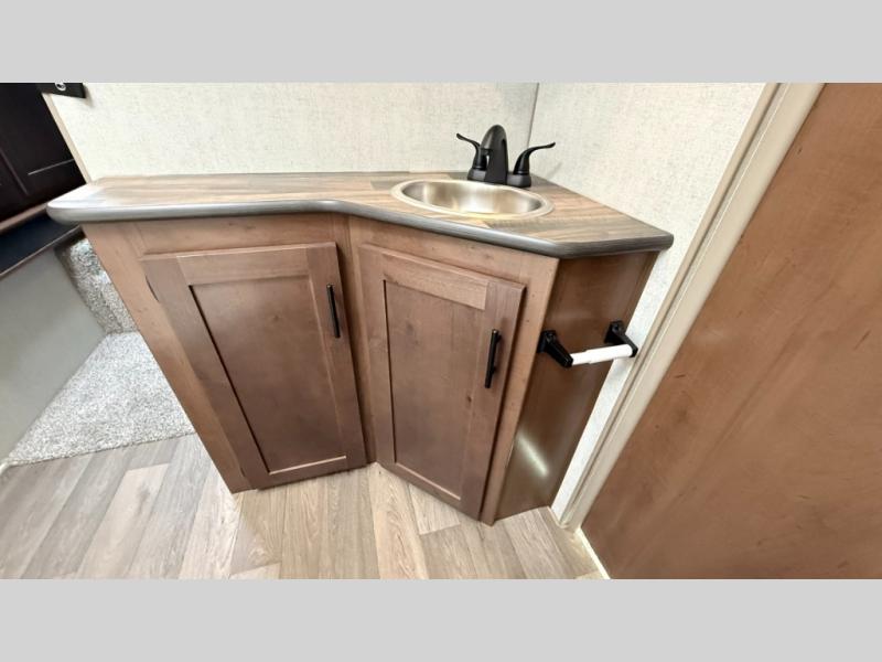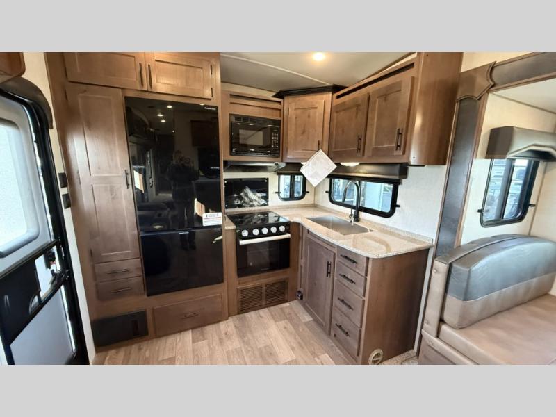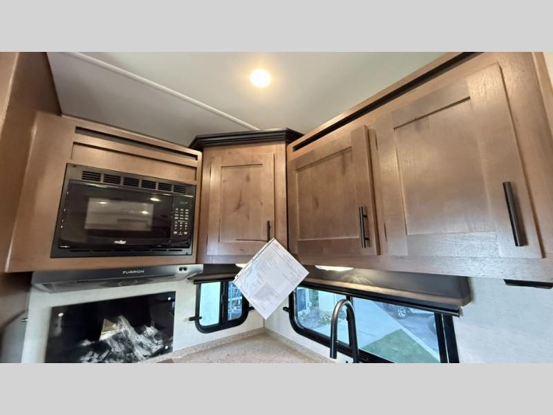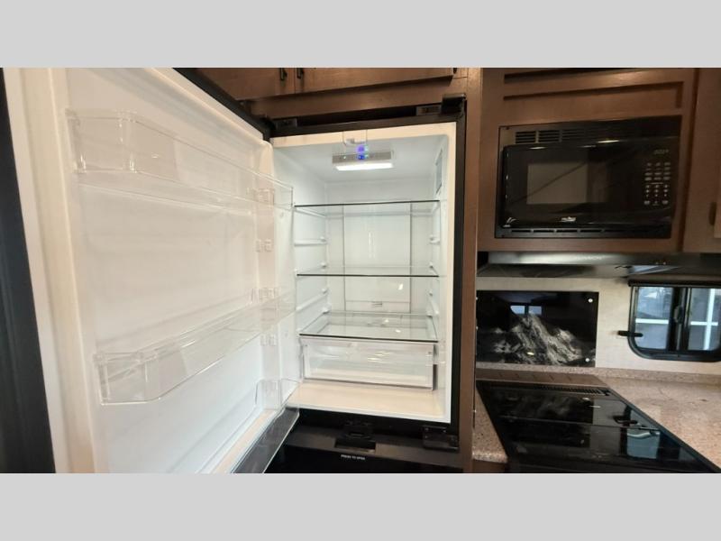 Load up and hit the road with this fifth wheel that offers a spacious interior with dual opposing slides near the rear kitchen. You can relax on the dinette, or the sofa as you use the built-in recliners to stretch out and watch the 50" TV. There is a pantry near the entry for easy access before heading out for a hike. The double entry bathroom is convenient, and includes a radius shower with a skylight for more headroom and natural lighting. There is also easy access from the front bedroom where you will find a queen bed, beside storage as well a slide out wardrobe that stretches into the bathroom with linen storage.
