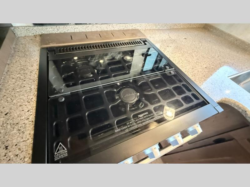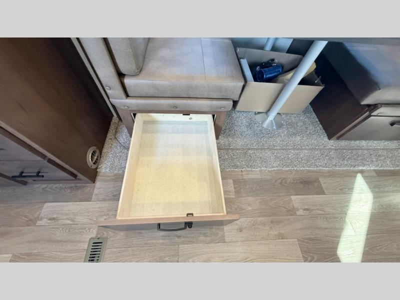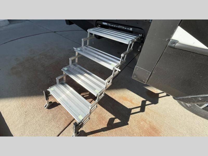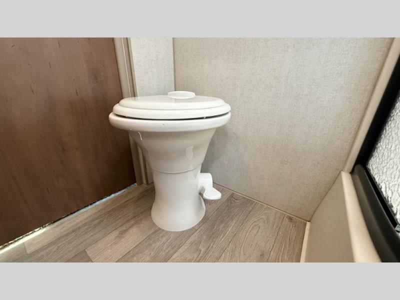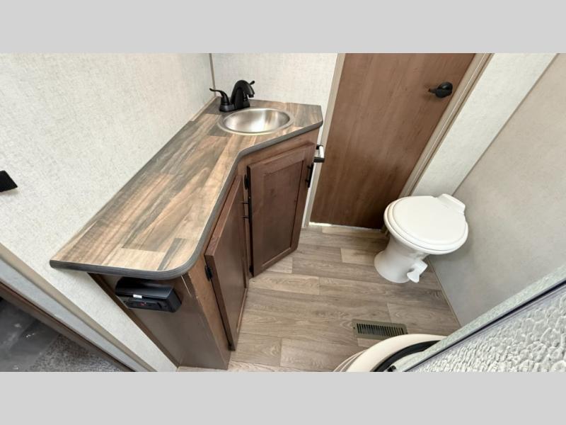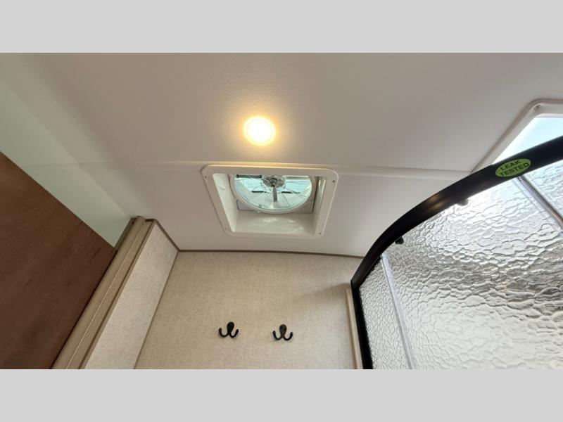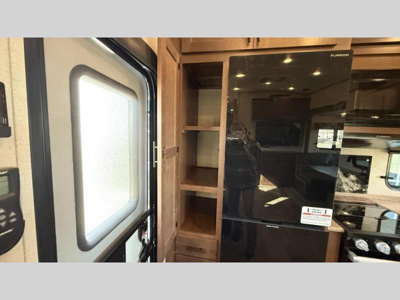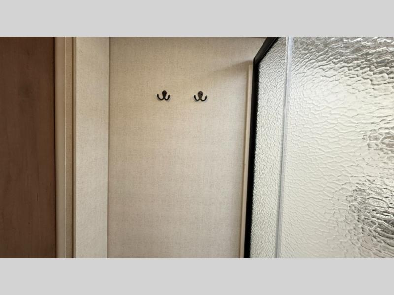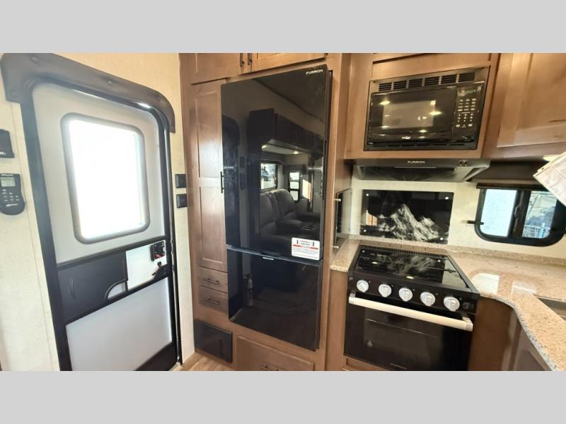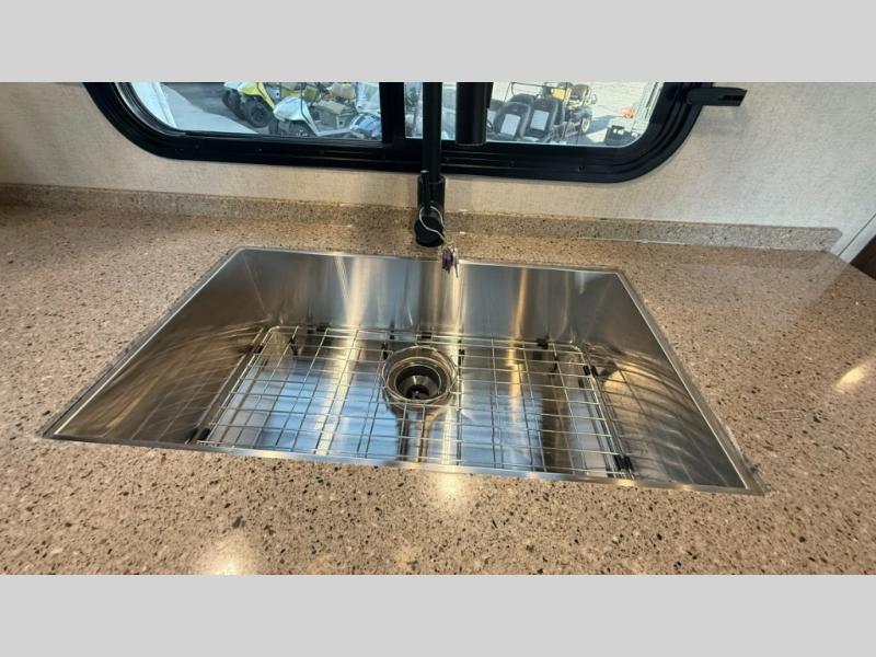 Load up and hit the road with this fifth wheel that offers a spacious interior with dual opposing slides near the rear kitchen. You can relax on the dinette, or the sofa as you use the built-in recliners to stretch out and watch the 50" TV. There is a pantry near the entry for easy access before heading out for a hike. The double entry bathroom is convenient, and includes a radius shower with a skylight for more headroom and natural lighting. There is also easy access from the front bedroom where you will find a queen bed, beside storage as well a slide out wardrobe that stretches into the bathroom with linen storage.
