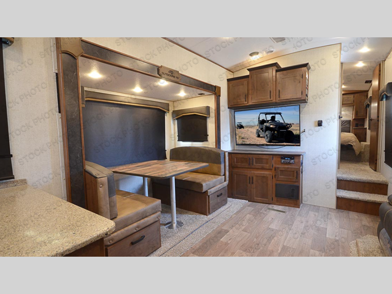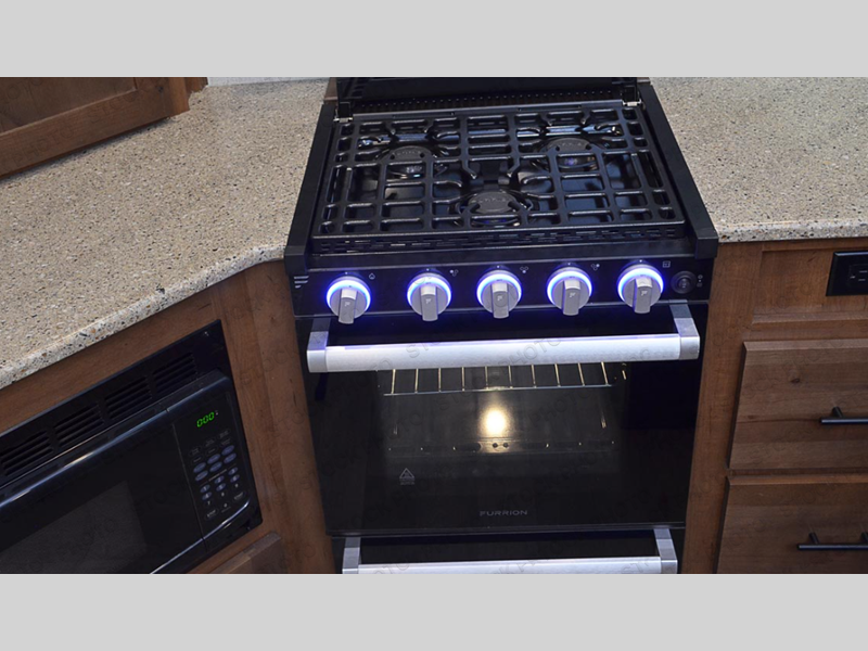 The cook will love this rear kitchen with the views out of the window and the U-shaped counter space to work from, plus having full amenities to make any type of meal. The pantry and refrigerator are next to the residential sofa within a slide out providing more interior floor space and a quick way to grab a snack before using the sofa built-in recliners to relax. There is another slide in this area with a mountain dinette, and both furnishings can provide extra sleeping space when needed. The entertainment center includes a swing-out 50" TV so everyone will have a good view. The front bedroom offers a queen bed to sleep on after a fun day outdoors, plus a wardrobe/linen slide giving both the bedroom and bathroom more space.