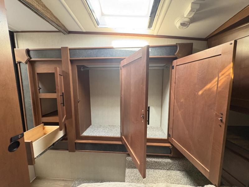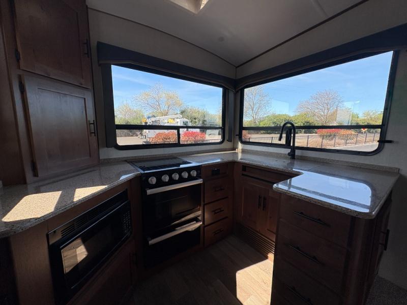 The cook will love this rear kitchen with the views out of the window and the U-shaped counter space to work from, plus having full amenities to make any type of meal. The pantry and refrigerator are next to the residential sofa within a slide out providing more interior floor space and a quick way to grab a snack before using the sofa built-in recliners to relax. There is another slide in this area with a mountain dinette, and both furnishings can provide extra sleeping space when needed. The entertainment center includes a swing-out 50" TV so everyone will have a good view. The front bedroom offers a queen bed to sleep on after a fun day outdoors, plus a wardrobe/linen slide giving both the bedroom and bathroom more space.