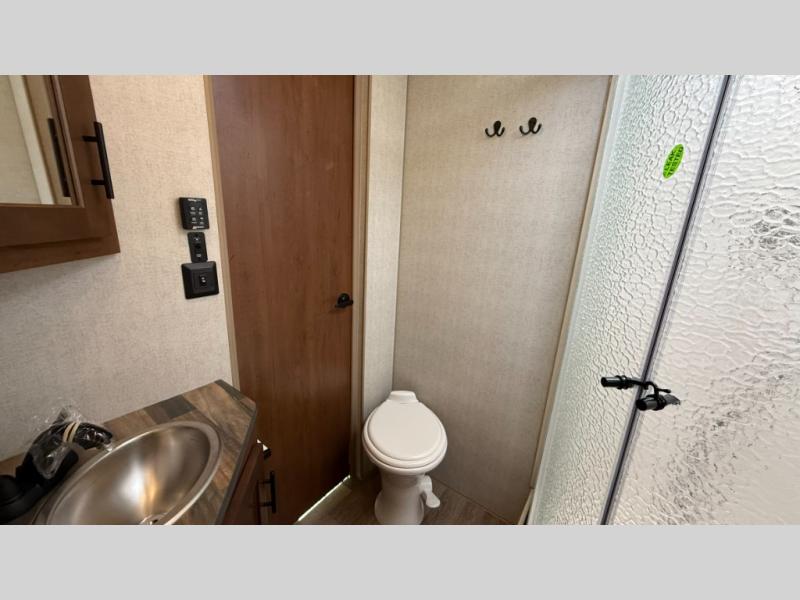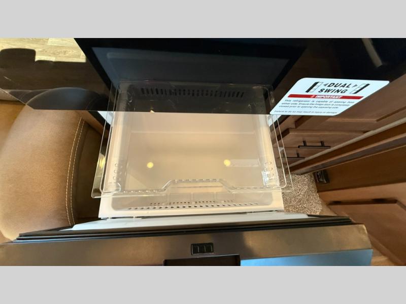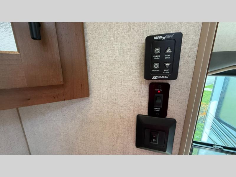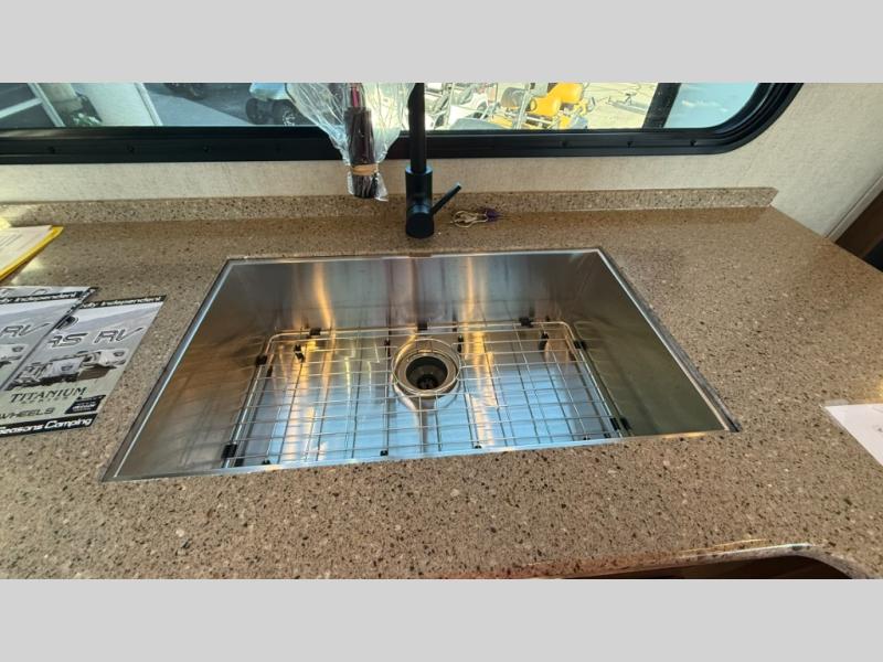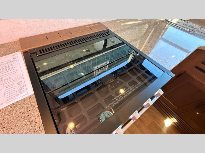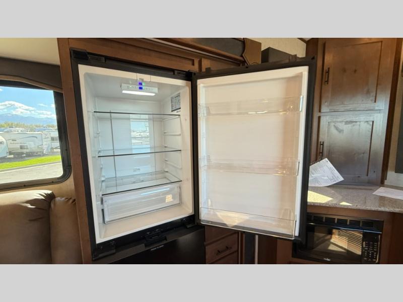 The cook will love this rear kitchen with the views out of the window and the U-shaped counter space to work from, plus having full amenities to make any type of meal. The pantry and refrigerator are next to the residential sofa within a slide out providing more interior floor space and a quick way to grab a snack before using the sofa built-in recliners to relax. There is another slide in this area with a mountain dinette, and both furnishings can provide extra sleeping space when needed. The entertainment center includes a swing-out 50" TV so everyone will have a good view. The front bedroom offers a queen bed to sleep on after a fun day outdoors, plus a wardrobe/linen slide giving both the bedroom and bathroom more space.