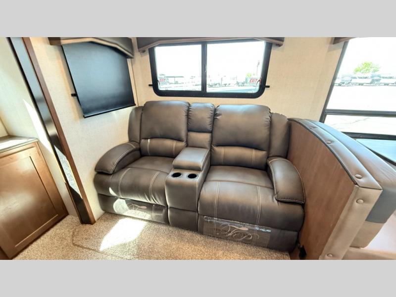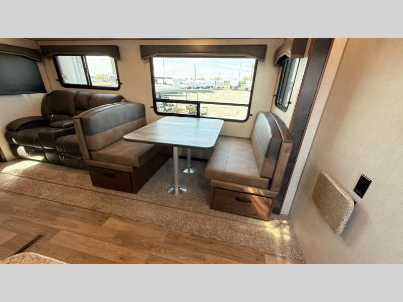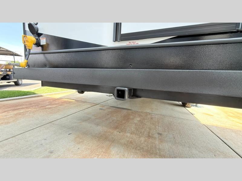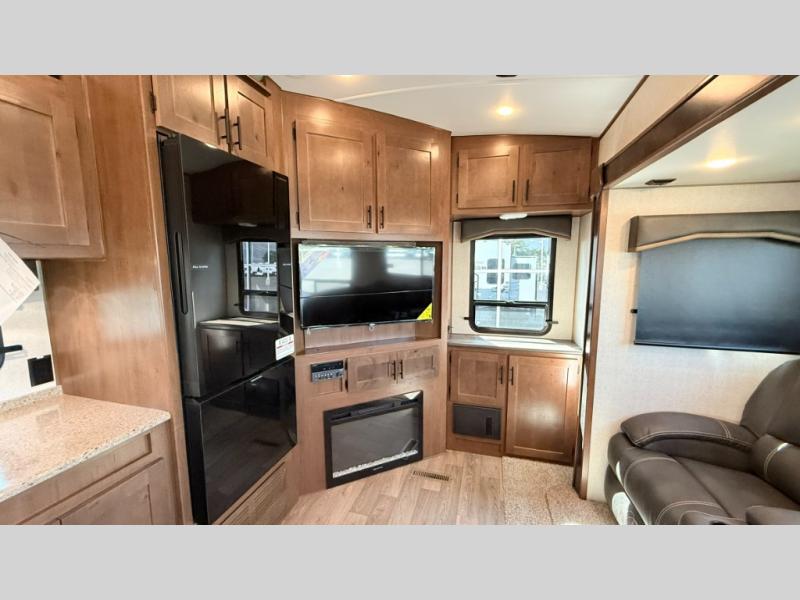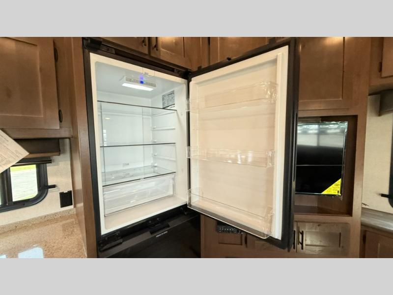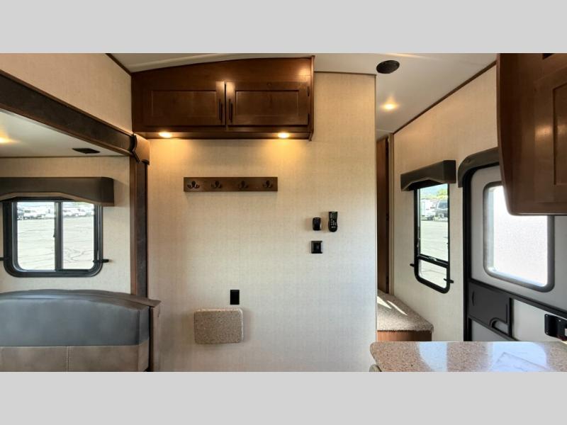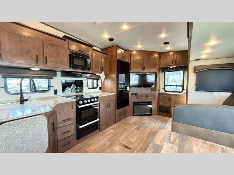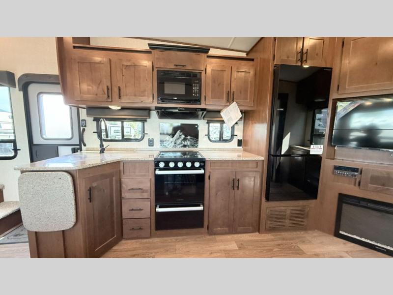 You can travel to the mountains, hilltops or the ocean with this fifth wheel hitched up to your vehicle! Once at your destination, you can easily setup the two slide outs, and the 20' power awning. Then you can relax inside while watching the swing-out 40" TV and sitting on the residential sofa with built-in recliners or the mountain dinette, both are within a large slide and both provide sleeping space for overnight guests. The kitchen is across the way and offers full amenities to make warm meals and store leftovers in the 12V refrigerator. You will find lots of storage inside as well as outside. When you are ready for bed, head to the front private bedroom after getting cleaned up in the double entry bathroom.