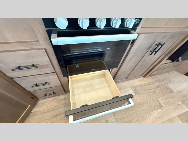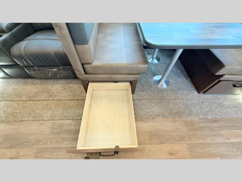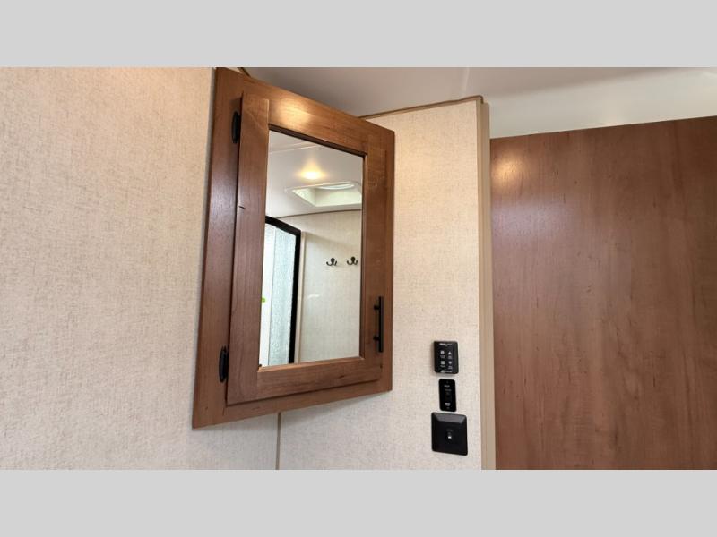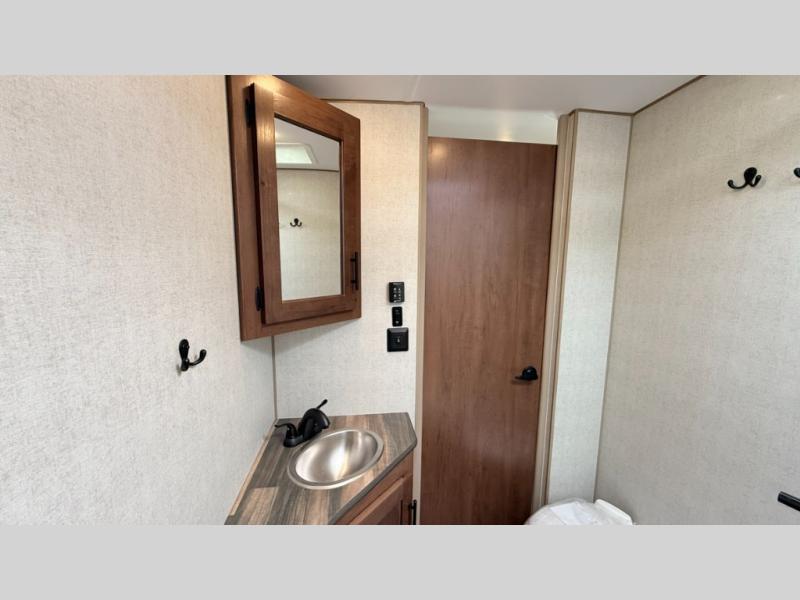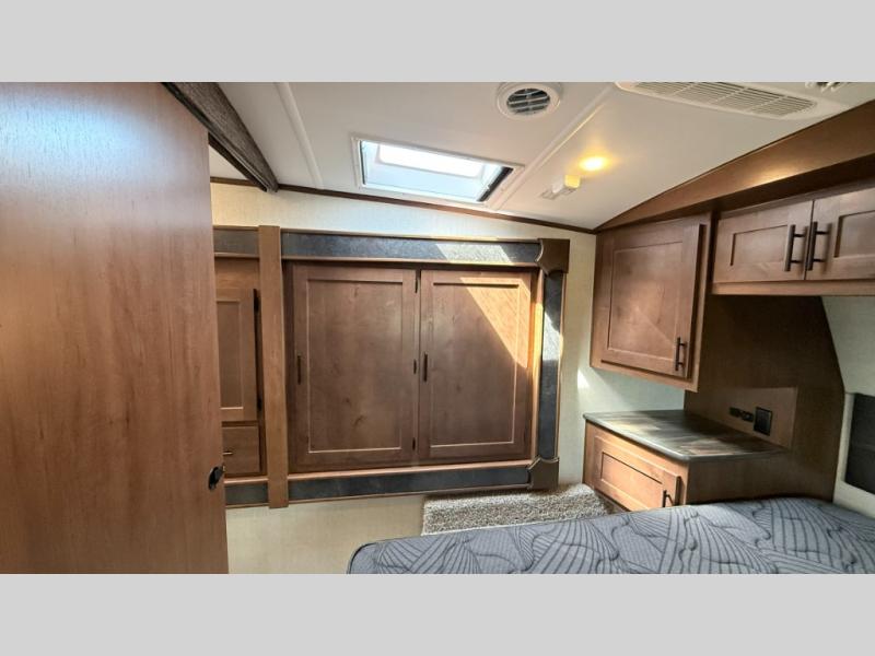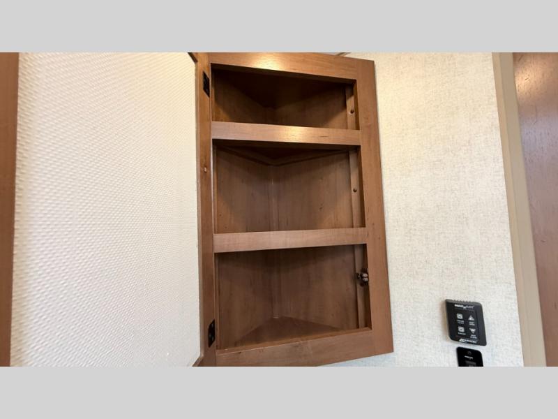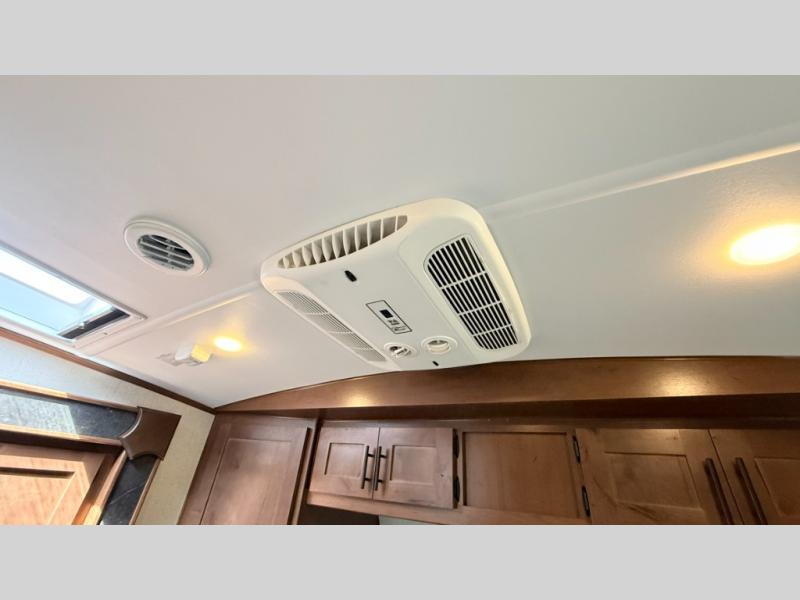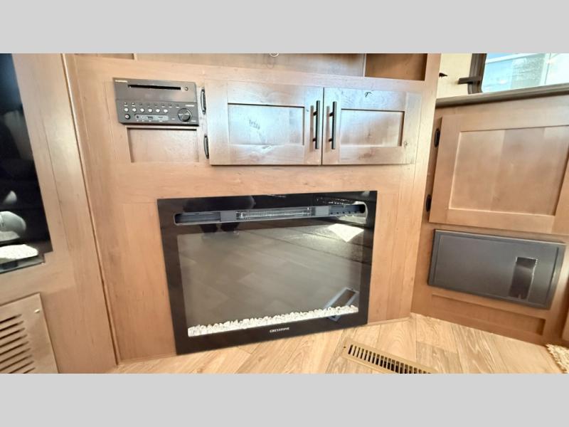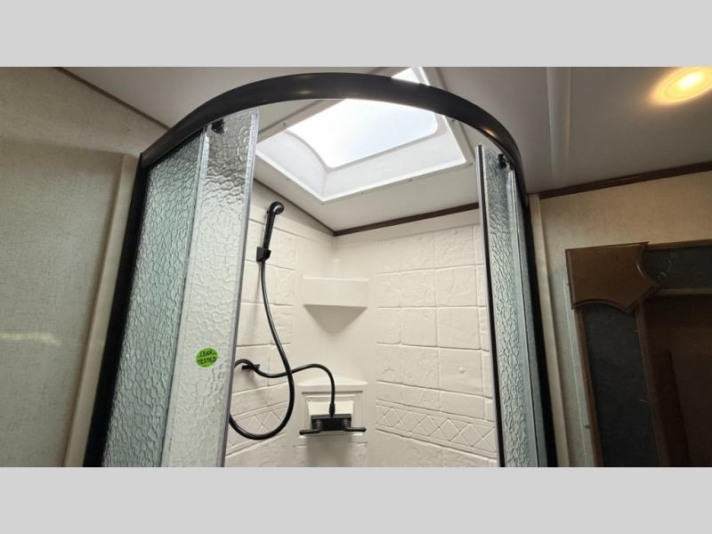 You can travel to the mountains, hilltops or the ocean with this fifth wheel hitched up to your vehicle! Once at your destination, you can easily setup the two slide outs, and the 20' power awning. Then you can relax inside while watching the swing-out 40" TV and sitting on the residential sofa with built-in recliners or the mountain dinette, both are within a large slide and both provide sleeping space for overnight guests. The kitchen is across the way and offers full amenities to make warm meals and store leftovers in the 12V refrigerator. You will find lots of storage inside as well as outside. When you are ready for bed, head to the front private bedroom after getting cleaned up in the double entry bathroom.
