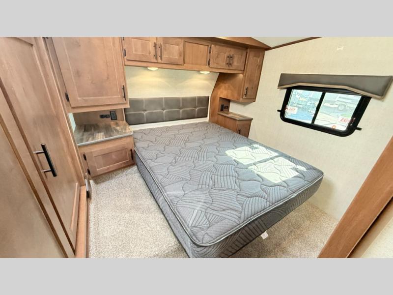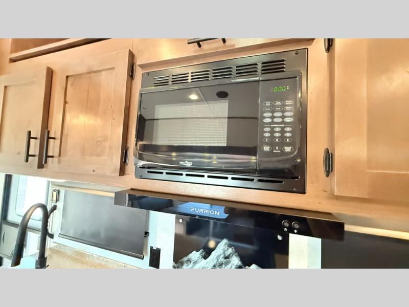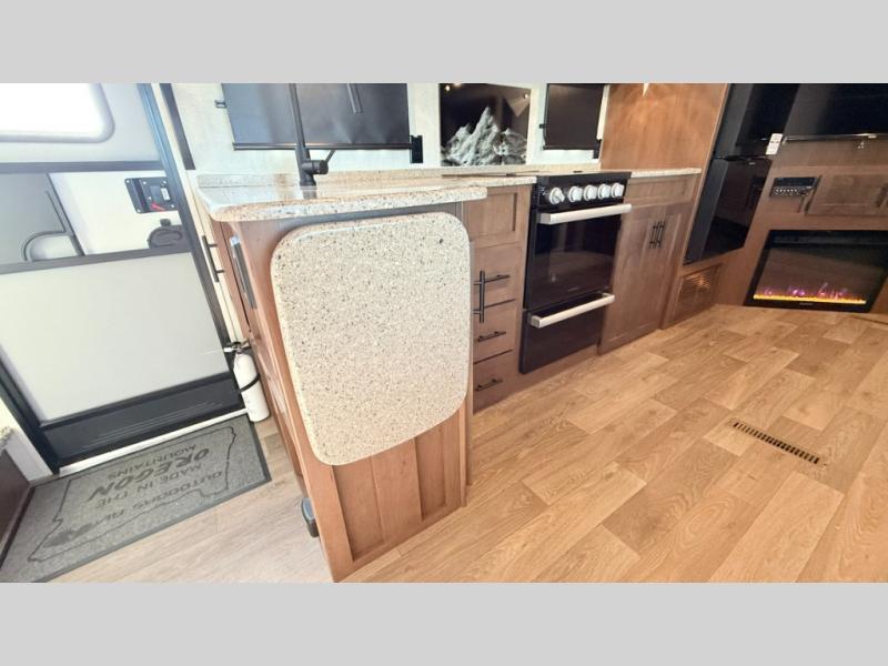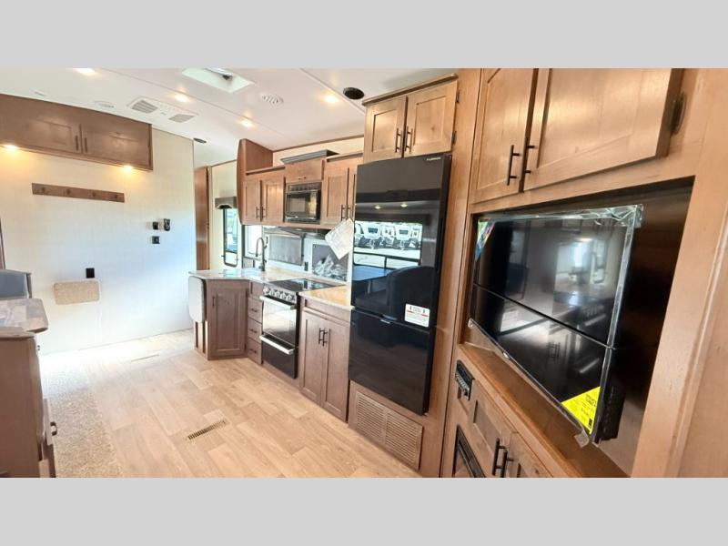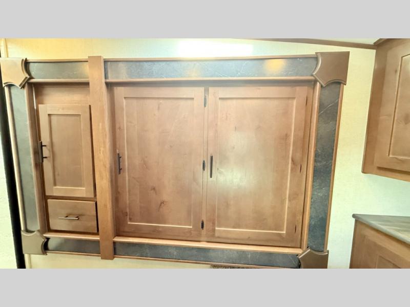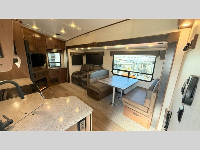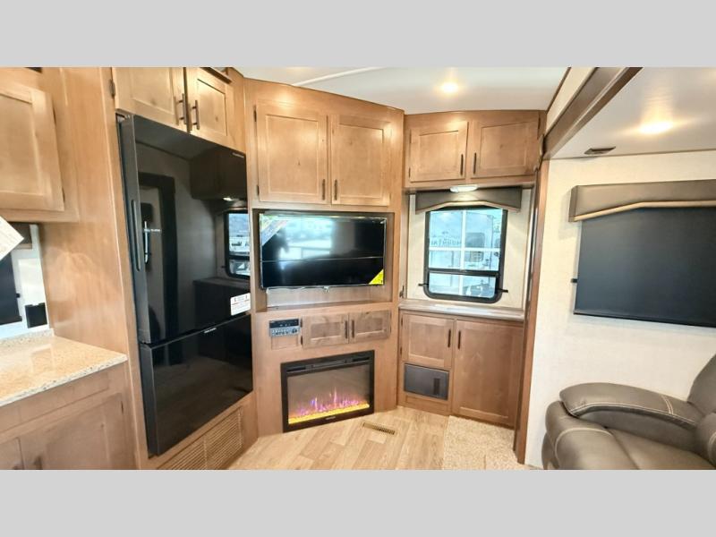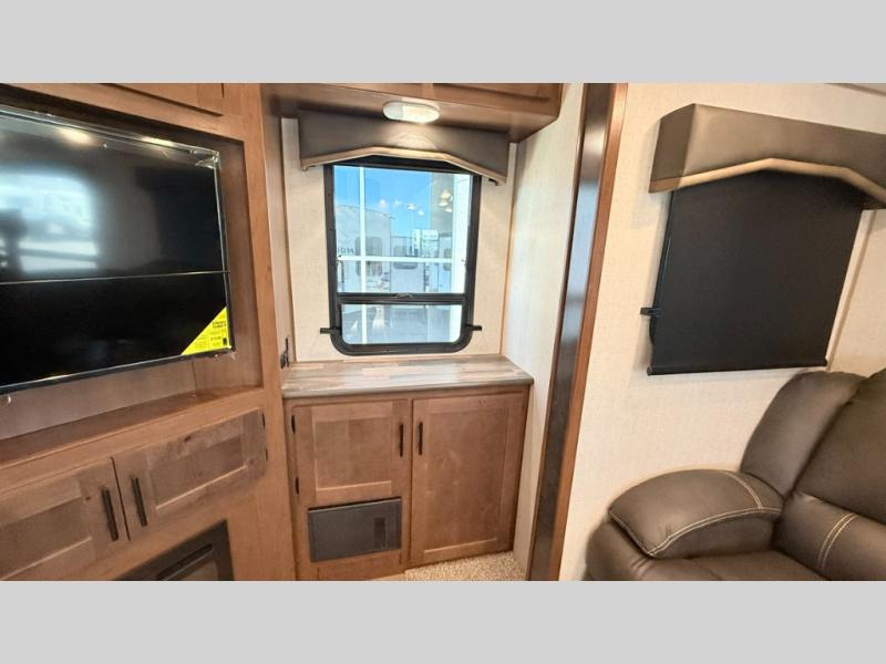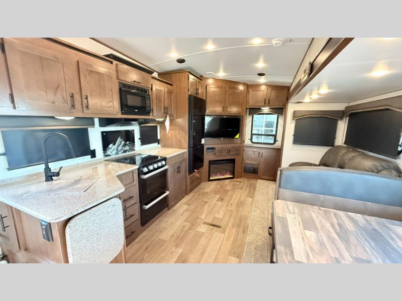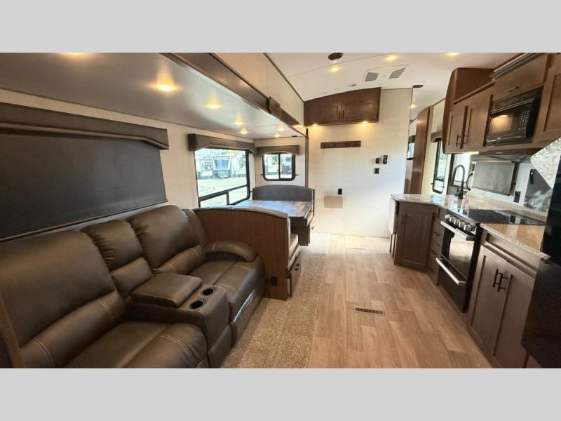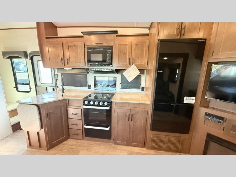 You can travel to the mountains, hilltops or the ocean with this fifth wheel hitched up to your vehicle! Once at your destination, you can easily setup the two slide outs, and the 20' power awning. Then you can relax inside while watching the swing-out 40" TV and sitting on the residential sofa with built-in recliners or the mountain dinette, both are within a large slide and both provide sleeping space for overnight guests. The kitchen is across the way and offers full amenities to make warm meals and store leftovers in the 12V refrigerator. You will find lots of storage inside as well as outside. When you are ready for bed, head to the front private bedroom after getting cleaned up in the double entry bathroom.