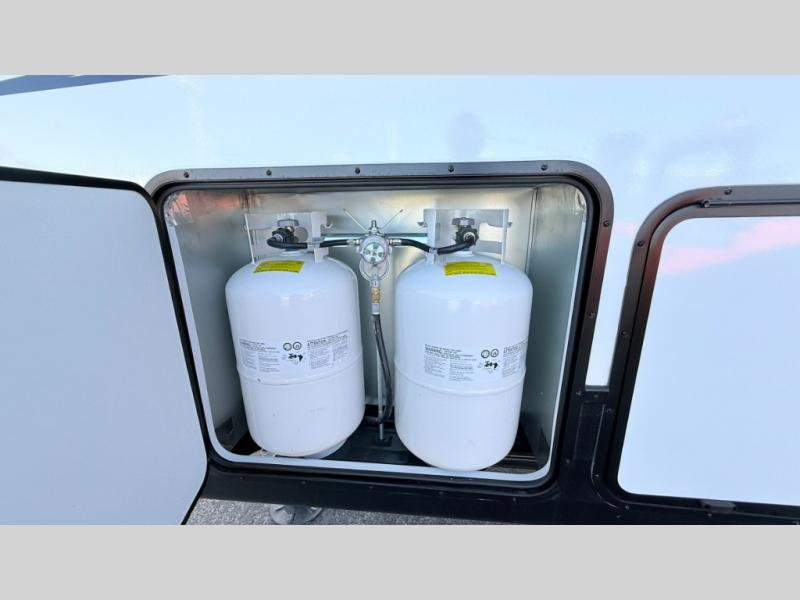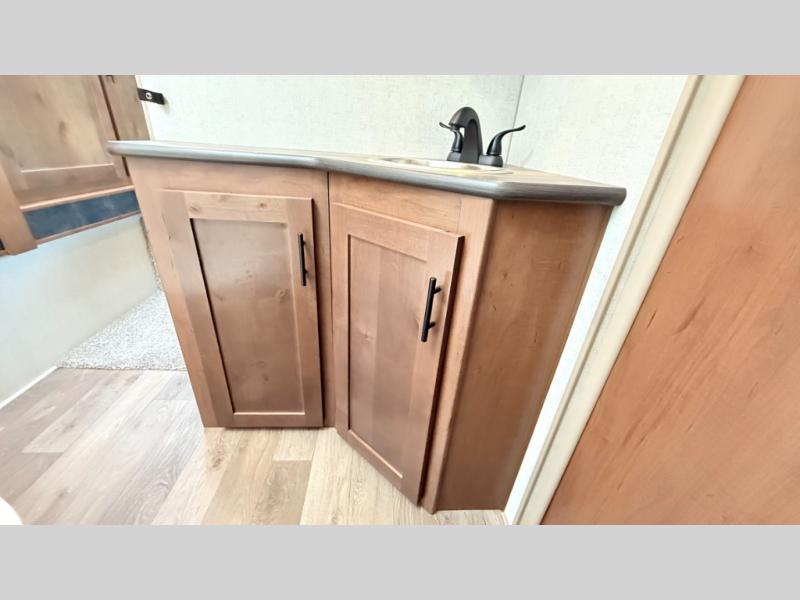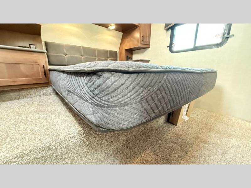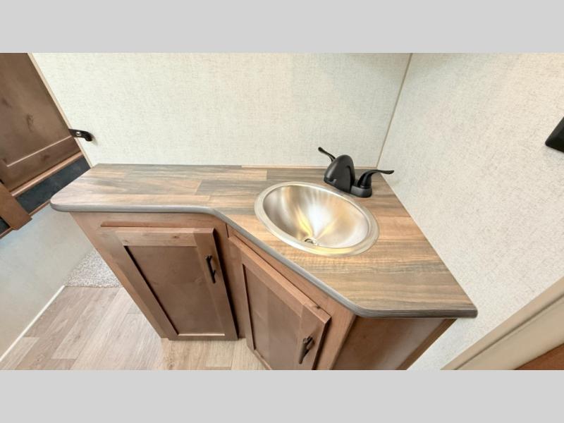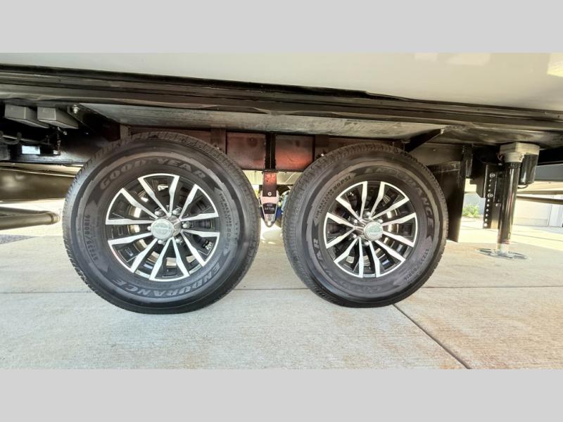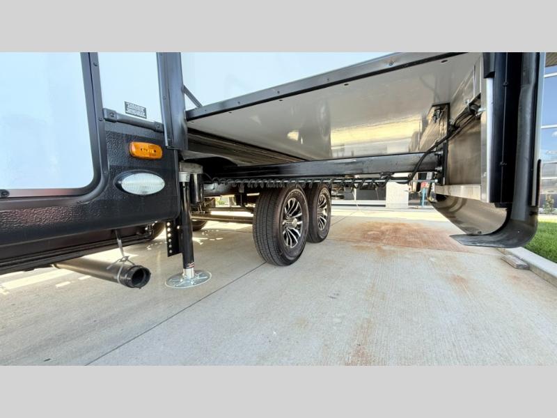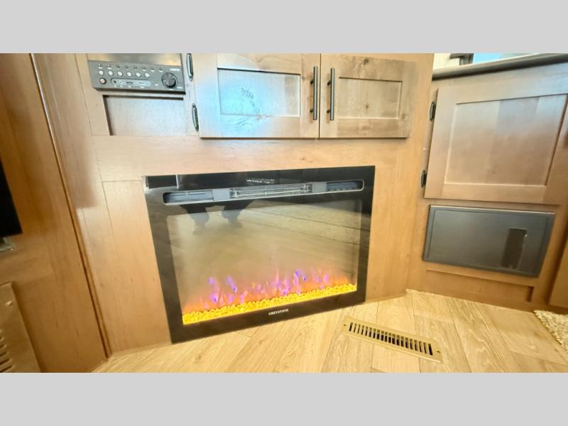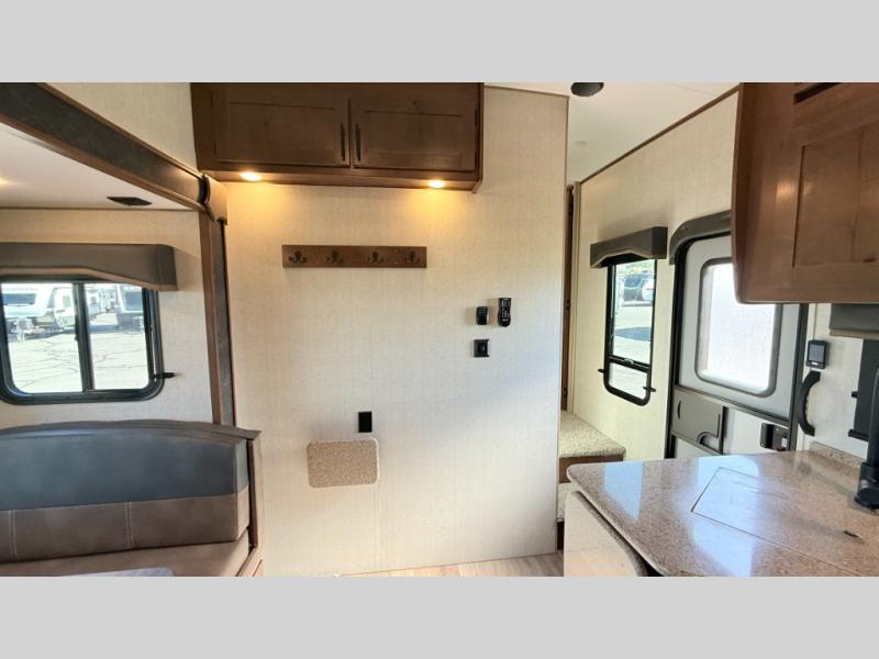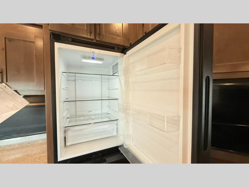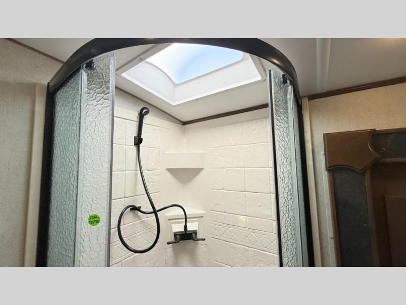 You can travel to the mountains, hilltops or the ocean with this fifth wheel hitched up to your vehicle! Once at your destination, you can easily setup the two slide outs, and the 20' power awning. Then you can relax inside while watching the swing-out 40" TV and sitting on the residential sofa with built-in recliners or the mountain dinette, both are within a large slide and both provide sleeping space for overnight guests. The kitchen is across the way and offers full amenities to make warm meals and store leftovers in the 12V refrigerator. You will find lots of storage inside as well as outside. When you are ready for bed, head to the front private bedroom after getting cleaned up in the double entry bathroom.
