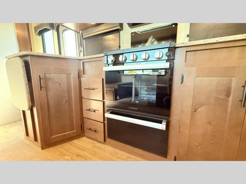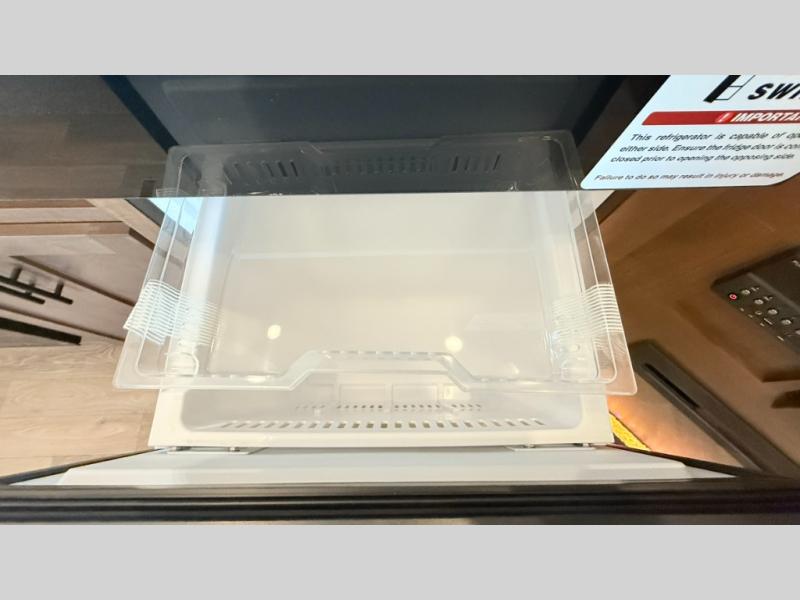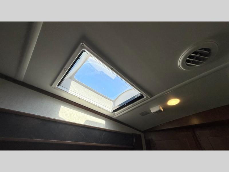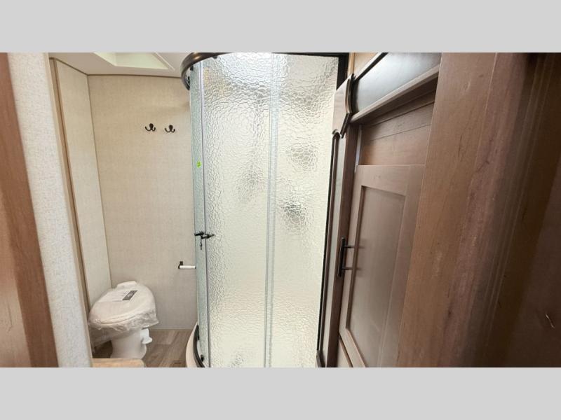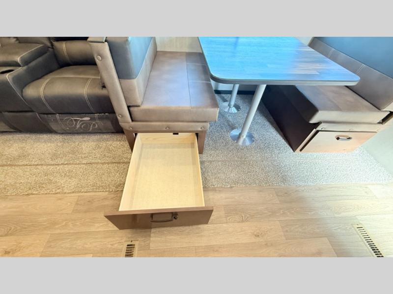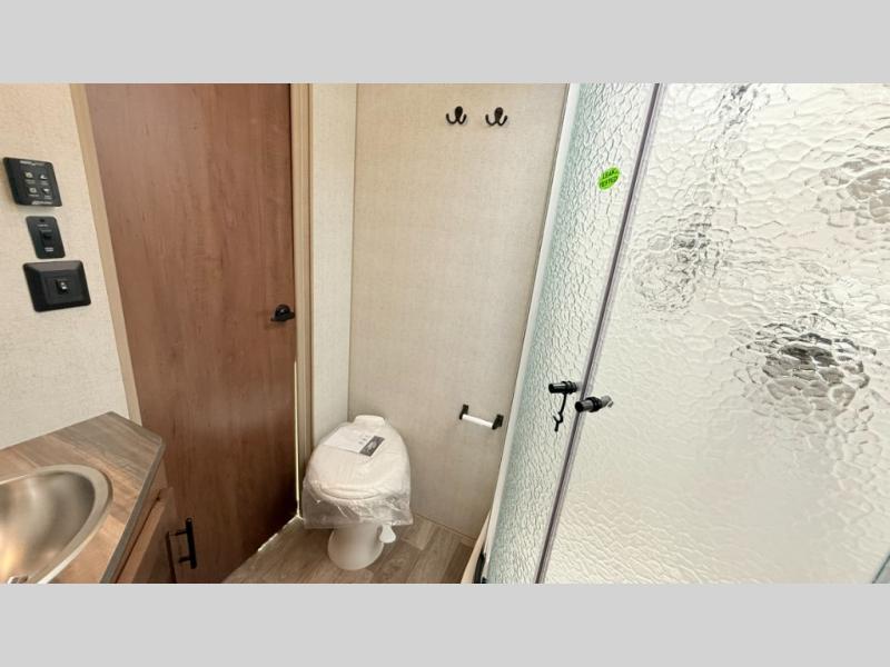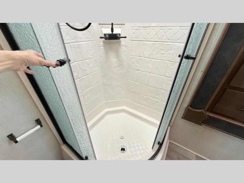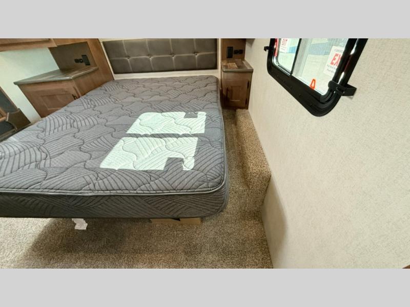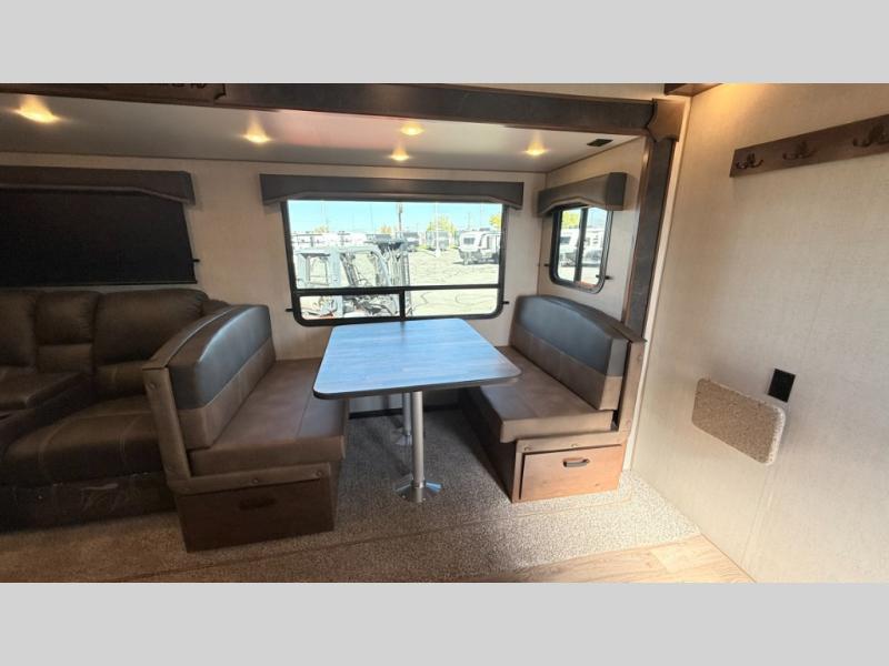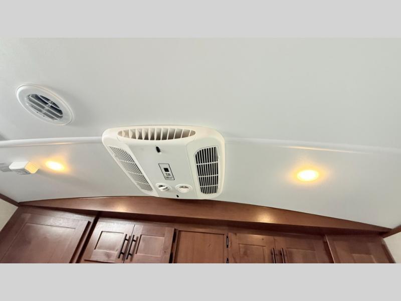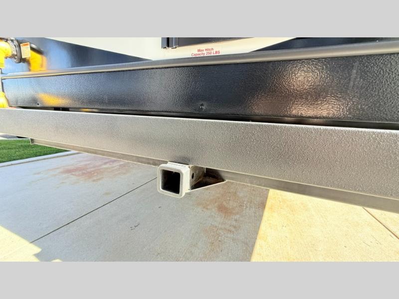 You can travel to the mountains, hilltops or the ocean with this fifth wheel hitched up to your vehicle! Once at your destination, you can easily setup the two slide outs, and the 20' power awning. Then you can relax inside while watching the swing-out 40" TV and sitting on the residential sofa with built-in recliners or the mountain dinette, both are within a large slide and both provide sleeping space for overnight guests. The kitchen is across the way and offers full amenities to make warm meals and store leftovers in the 12V refrigerator. You will find lots of storage inside as well as outside. When you are ready for bed, head to the front private bedroom after getting cleaned up in the double entry bathroom.