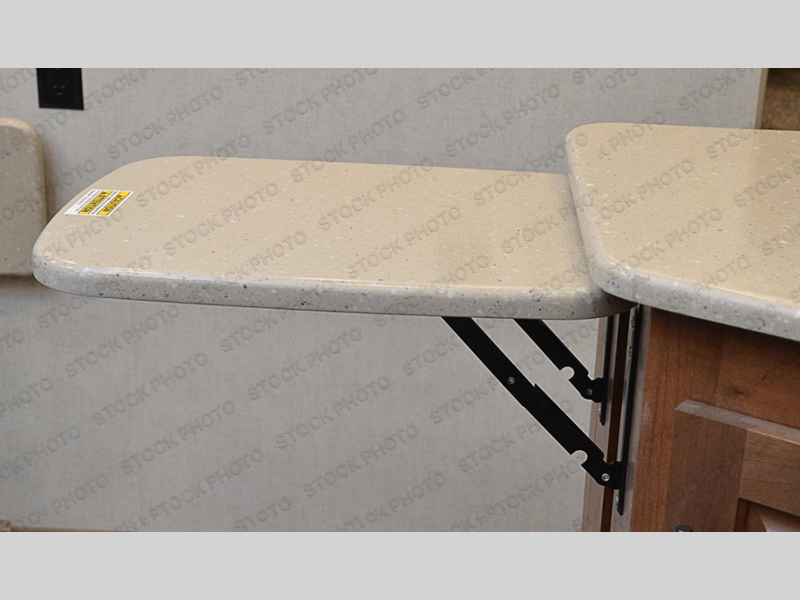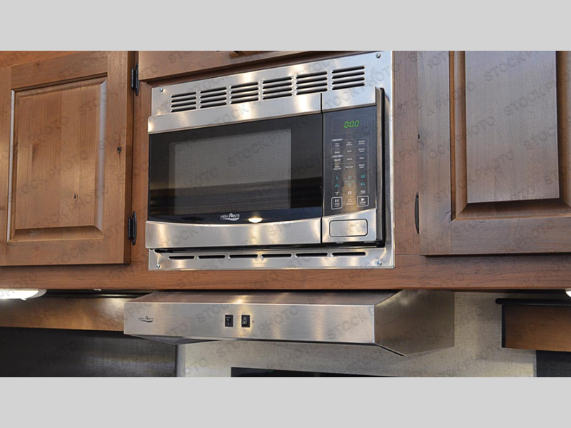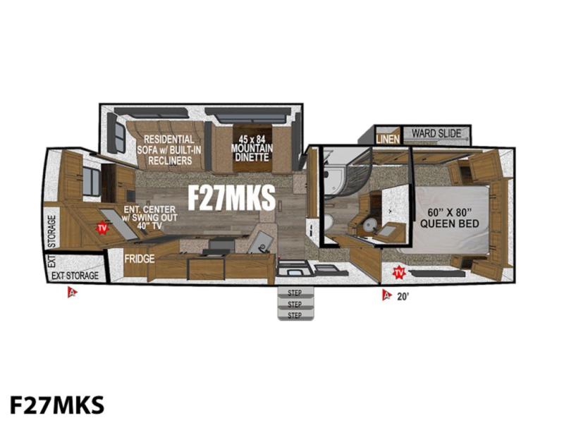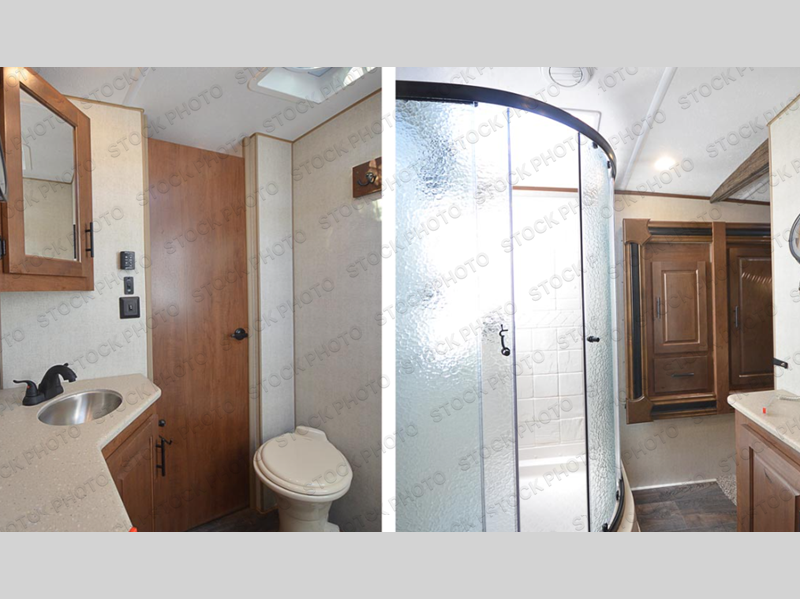 You can travel to the mountains, hilltops or the ocean with this fifth wheel hitched up to your vehicle! Once at your destination, you can easily set up the two slide outs, and the 20' power awning. Then you can relax inside while watching the swing-out 40" TV and sitting on the residential sofa with built-in recliners or the mountain dinette, both are within a large slide and both provide sleeping space for overnight guests. The kitchen is across the way and offers full amenities to make warm meals and store leftovers in the refrigerator. You will find lots of storage inside as well as outside. When you are ready for bed, head to the front private bedroom after getting cleaned up in the double entry bathroom.