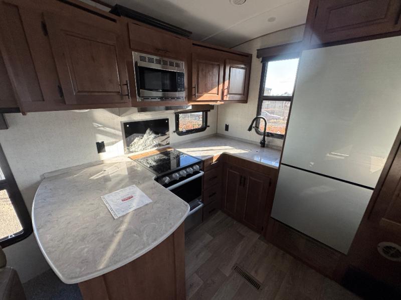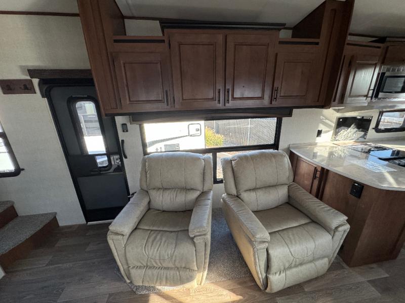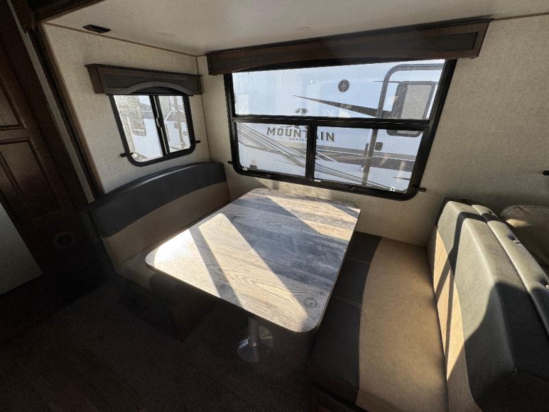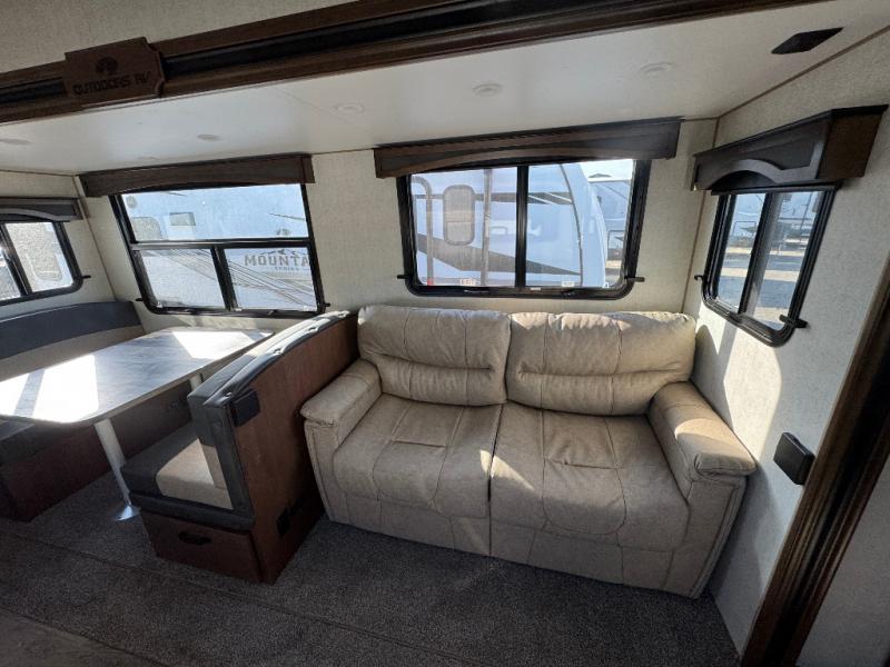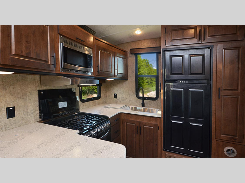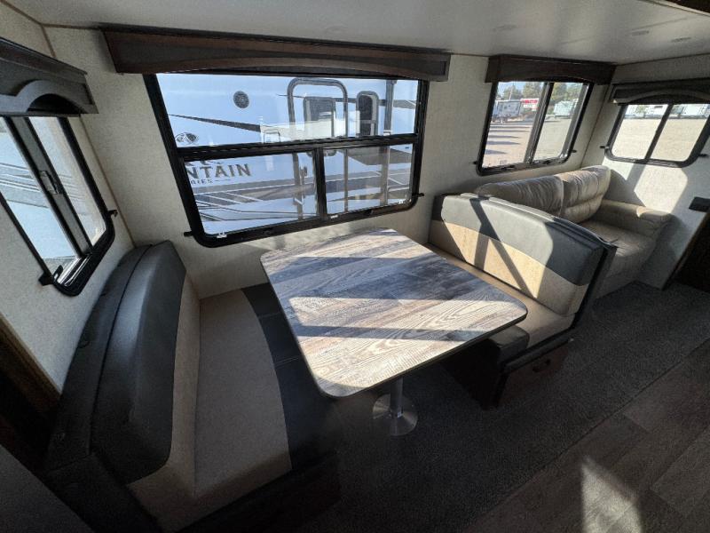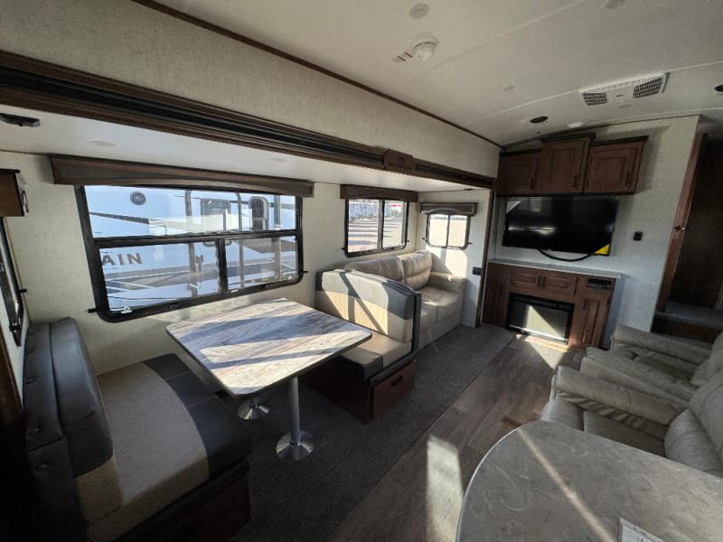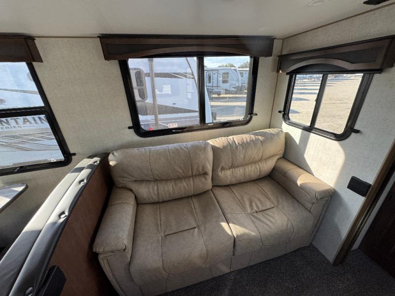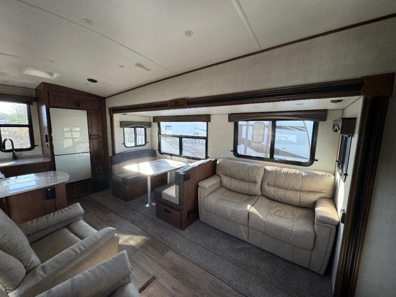 With a 31 foot floor length and two slide outs, you will be able to enjoy a lot of interior space when you are inside this fifth wheel! The front bedroom offers a queen bed, and a wardrobe/linen slide that stretches into the bathroom giving both rooms more floor space and storage. The main living area offers a large slide out with a mountain dinette to dine at, and a sleeper sofa for family and friends. You will also be able to watch the big game on the 50" swing-out TV and there are lounge recliners as well. The rear kitchen offers a U-shaped counter for the cook to be able to prepare and serve meals from, plus there is a pantry beside the refrigerator and a rear window for natural lighting and views of your campsite.