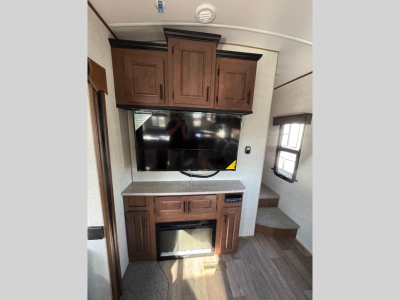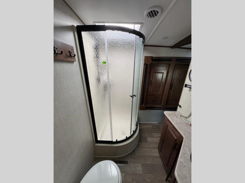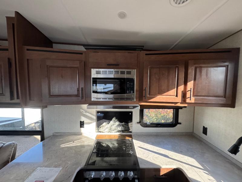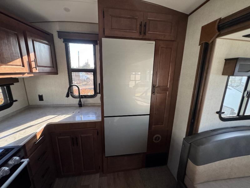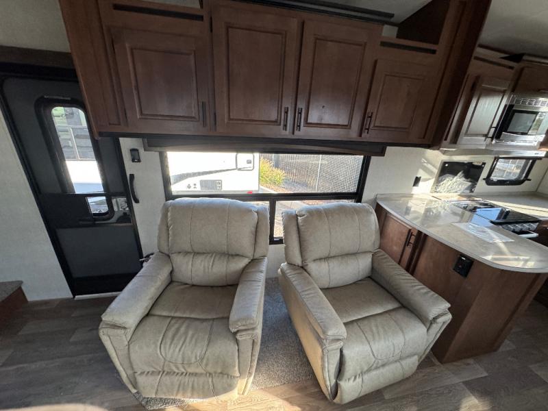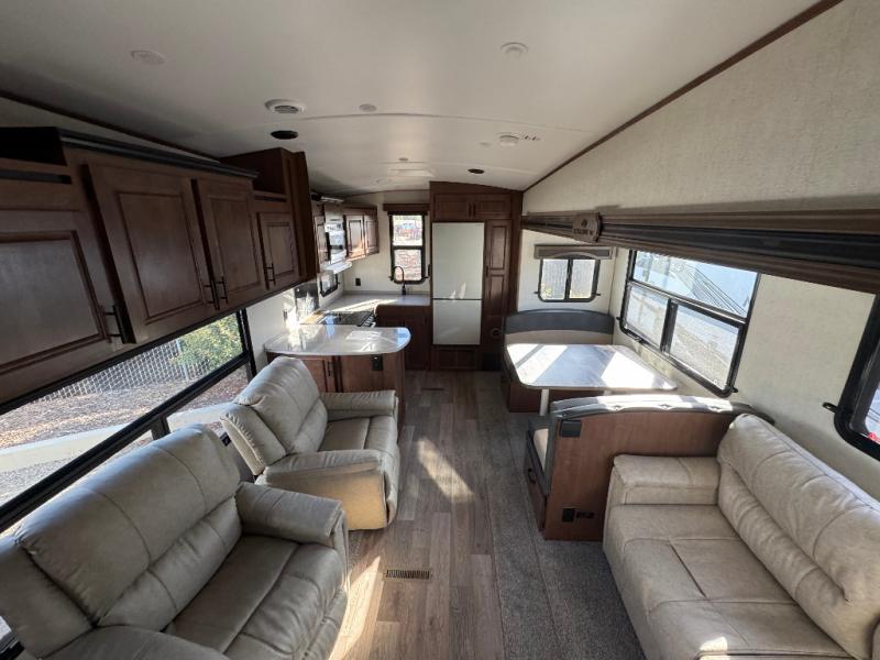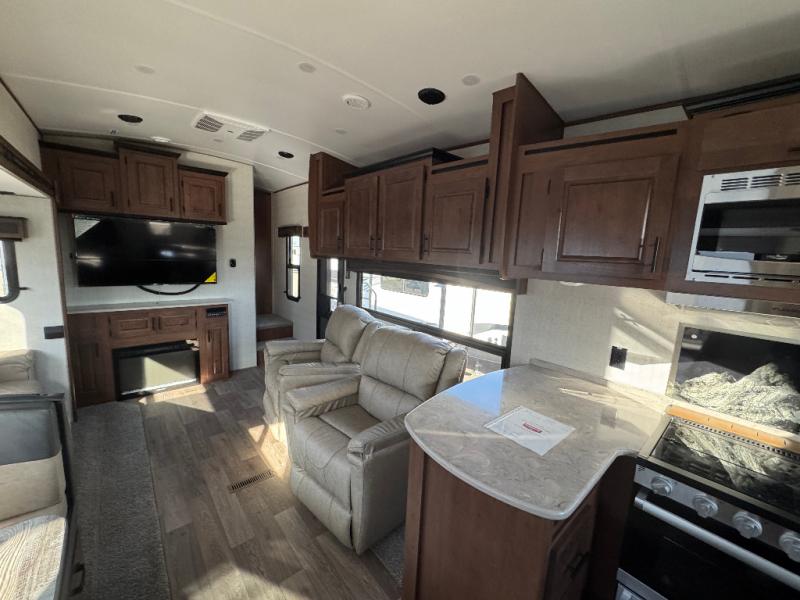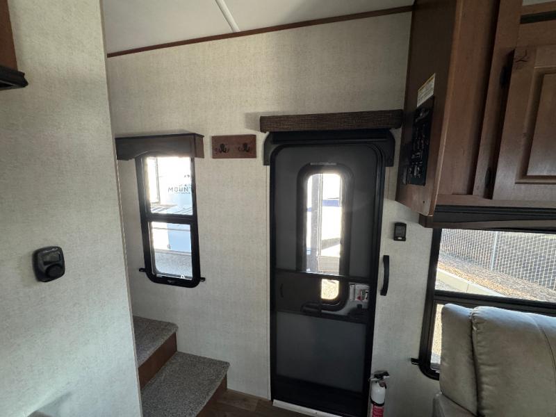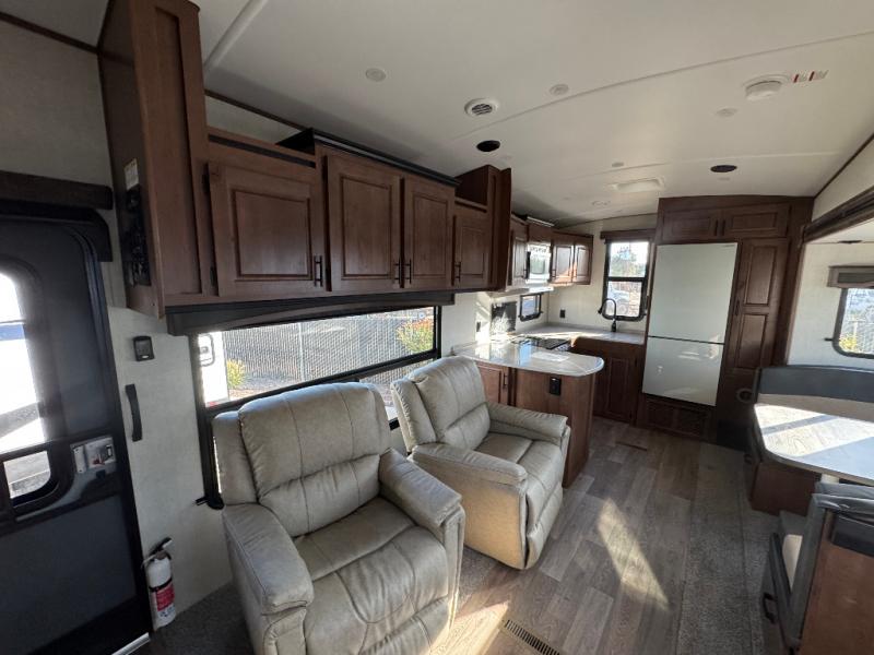With a 31 foot floor length and two slide outs, you will be able to enjoy a lot of interior space when you are inside this fifth wheel! The front bedroom offers a queen bed, and a wardrobe/linen slide that stretches into the bathroom giving both rooms more floor space and storage. The main living area offers a large slide out with a mountain dinette to dine at, and a sleeper sofa for family and friends. You will also be able to watch the big game on the 50" swing-out TV and there are lounge recliners as well. The rear kitchen offers a U-shaped counter for the cook to be able to prepare and serve meals from, plus there is a pantry beside the refrigerator and a rear window for natural lighting and views of your campsite.