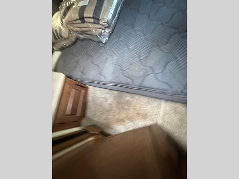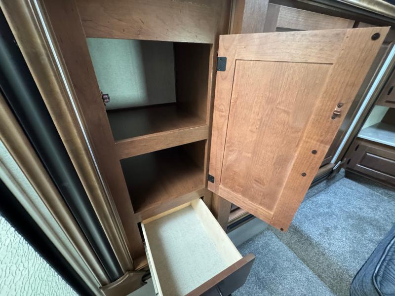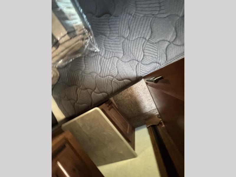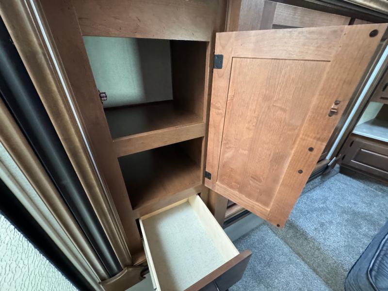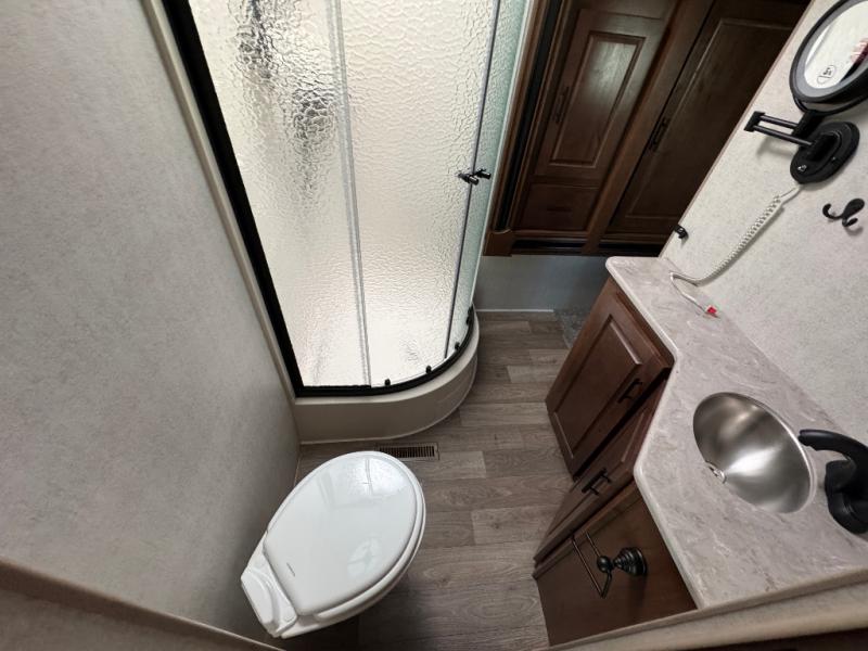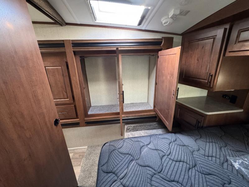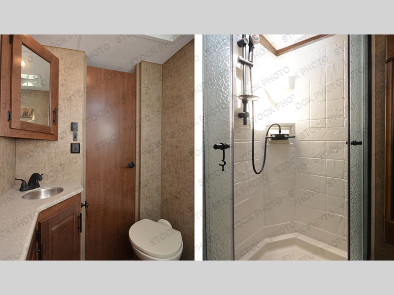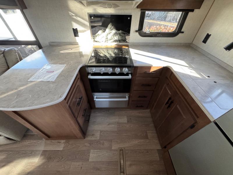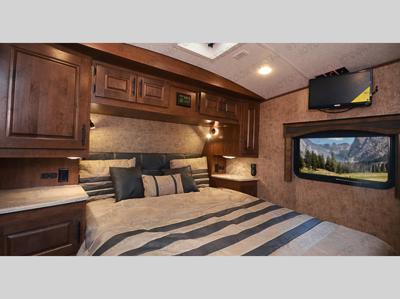 With a 31 foot floor length and two slide outs, you will be able to enjoy a lot of interior space when you are inside this fifth wheel! The front bedroom offers a queen bed, and a wardrobe/linen slide that stretches into the bathroom giving both rooms more floor space and storage. The main living area offers a large slide out with a mountain dinette to dine at, and a sleeper sofa for family and friends. You will also be able to watch the big game on the 50" swing-out TV and there are lounge recliners as well. The rear kitchen offers a U-shaped counter for the cook to be able to prepare and serve meals from, plus there is a pantry beside the refrigerator and a rear window for natural lighting and views of your campsite.