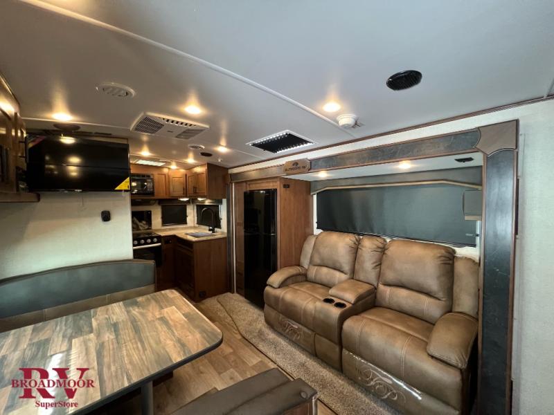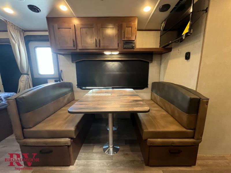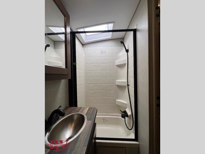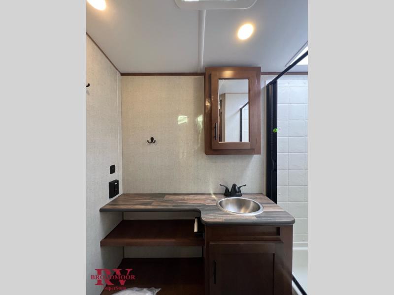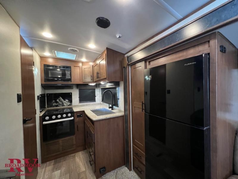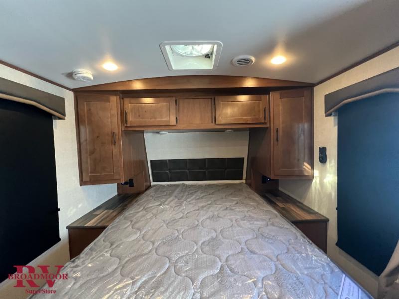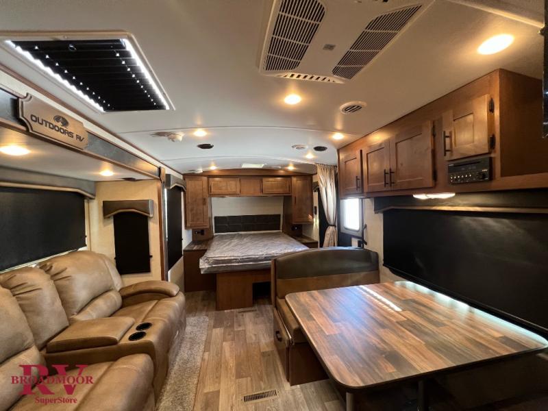 This is the perfect trailer for camping trips to the lake or your favorite campground. You will find a rear corner kitchen with plenty of counter space, and a mountain dinette to dine at. There is also a residential sofa with built-in recliners within the large slide out, along with the 12V refrigerator and pantry for food storage. Up front, the 60" x 80" queen bed is sure to provide a great night's rest, and you'll find storage space on either side of the bed for your clothes, shoes and more!