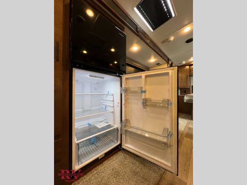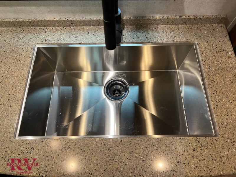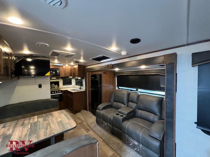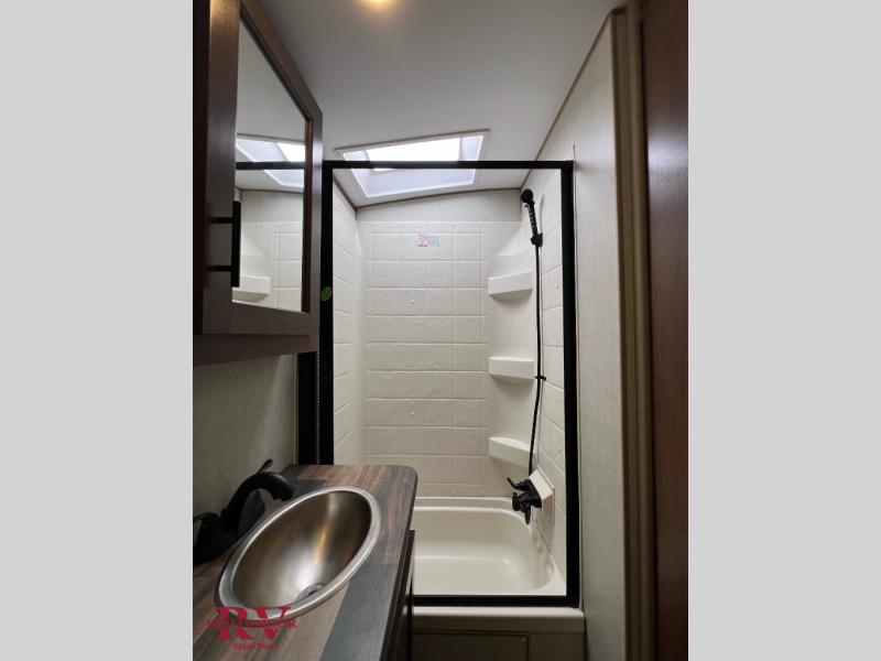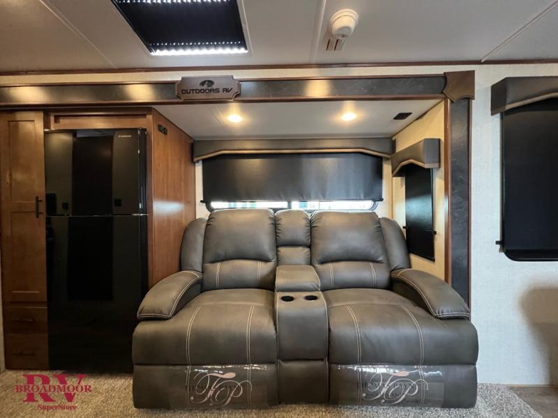 This is the perfect trailer for camping trips to the lake or your favorite campground. You will find a rear corner kitchen with plenty of counter space, and a mountain dinette to dine at. There is also a residential sofa with built-in recliners within the large slide out, along with the 12V refrigerator and pantry for food storage. Up front, the 60" x 80" queen bed is sure to provide a great night's rest, and you'll find storage space on either side of the bed for your clothes, shoes and more!