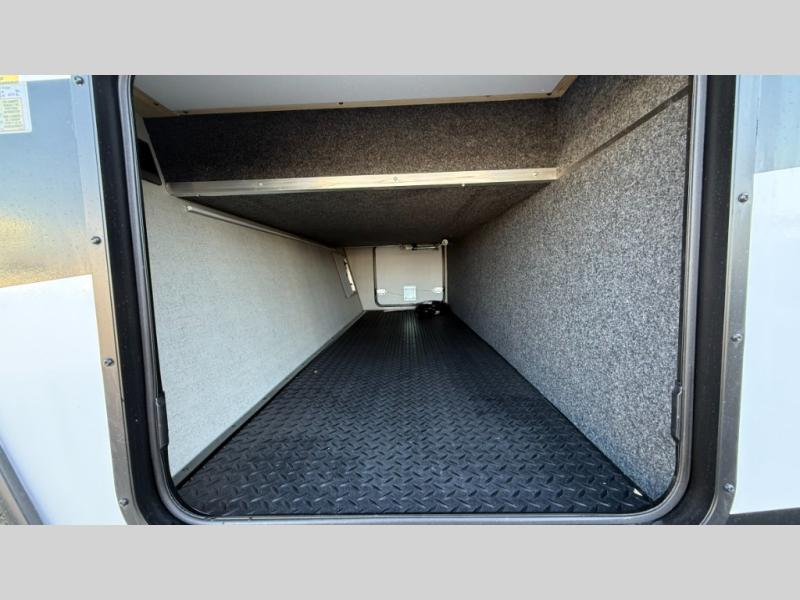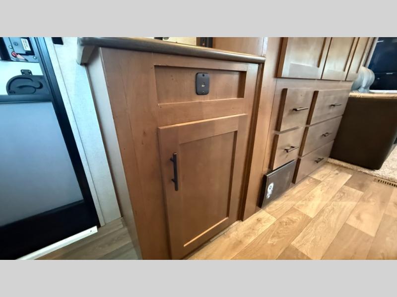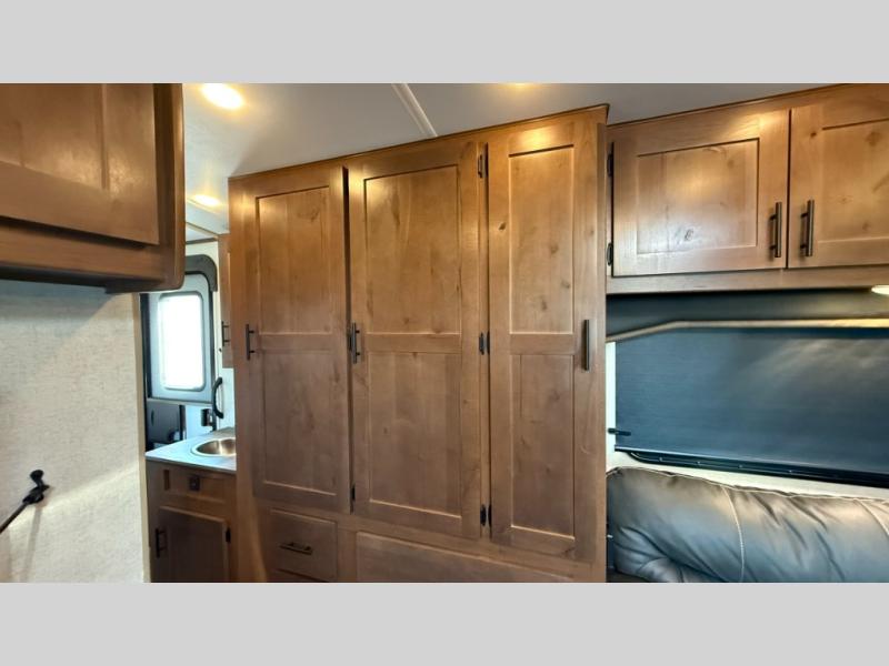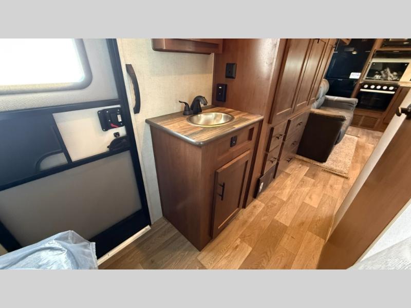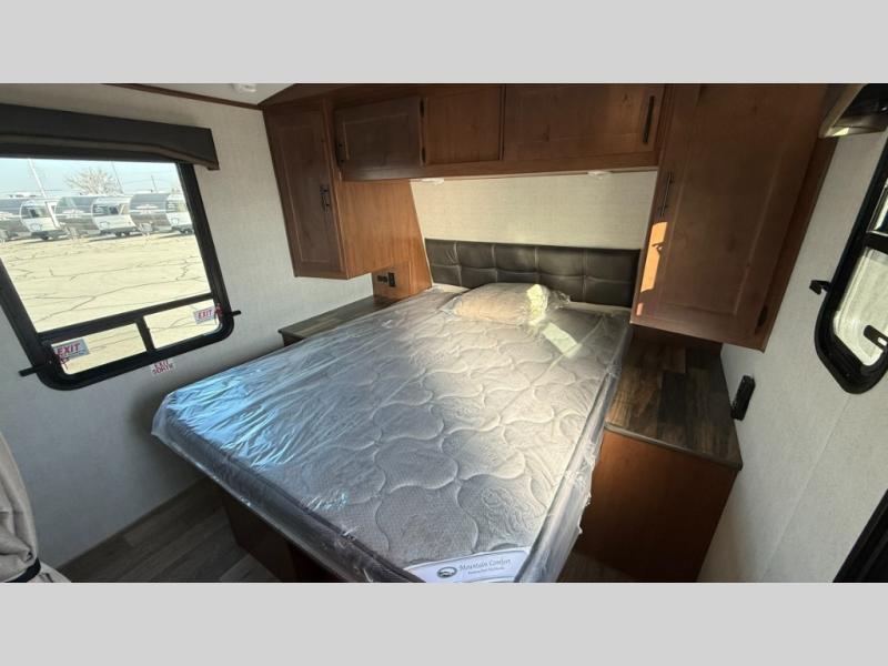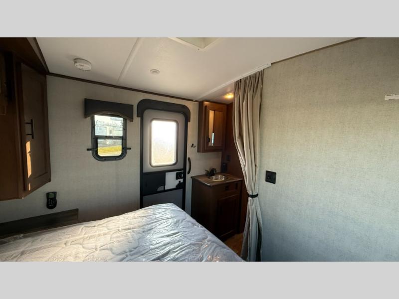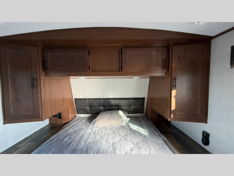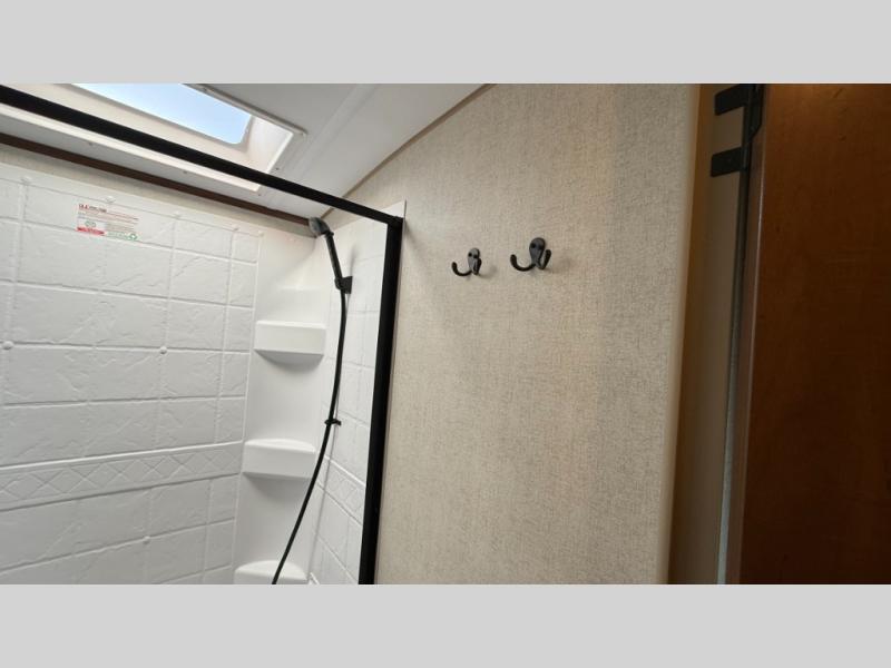 Dual entry doors in this travel trailer will allow you to enter in through the rear kitchen, or in the front bedroom for convenience. You will love having a queen bed to sleep on and dual bedroom wardrobes to keep your clothes wrinkle-free. Get cleaned up in the full bath that includes a shower skylight, then head to the rear kitchen to prepare breakfast on the three burner cooktop. Your crew can sit at the mountain dinette slide or relax on the sleeper sofa before heading out for the day. This model also includes a large wardrobe with drawers and a pantry for tons of storage space.