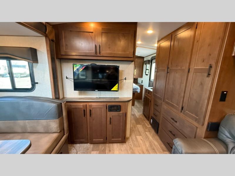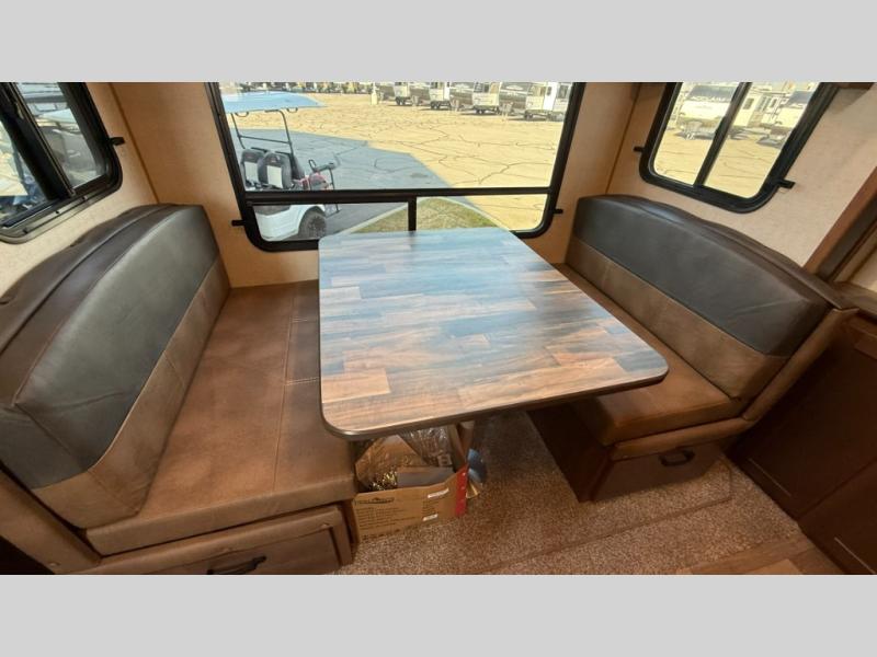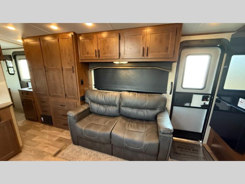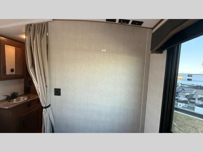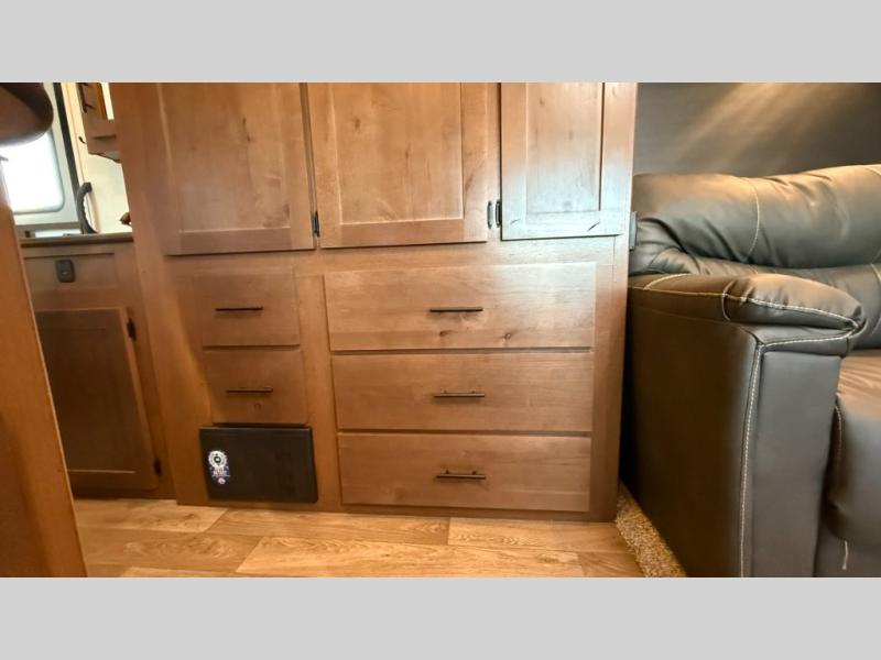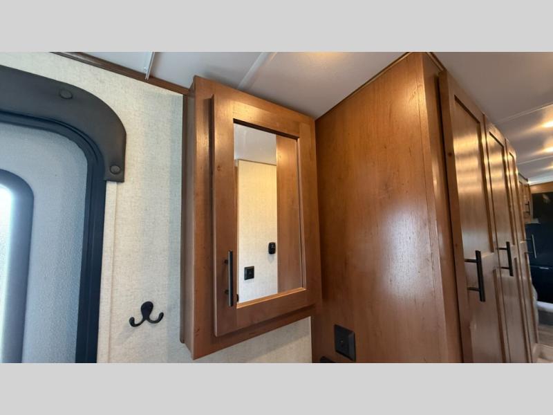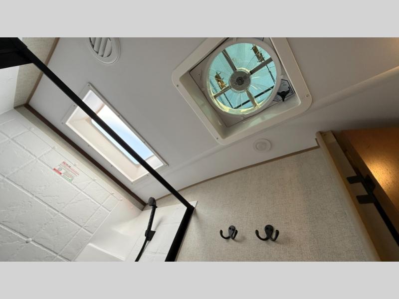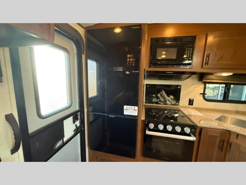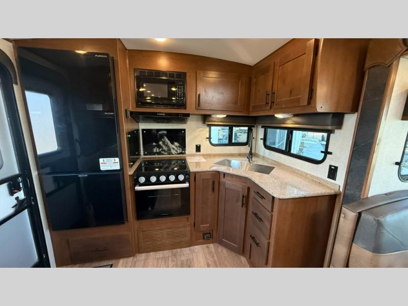 Dual entry doors in this travel trailer will allow you to enter in through the rear kitchen, or in the front bedroom for convenience. You will love having a queen bed to sleep on and dual bedroom wardrobes to keep your clothes wrinkle-free. Get cleaned up in the full bath that includes a shower skylight, then head to the rear kitchen to prepare breakfast on the three burner cooktop. Your crew can sit at the mountain dinette slide or relax on the sleeper sofa before heading out for the day. This model also includes a large wardrobe with drawers and a pantry for tons of storage space.