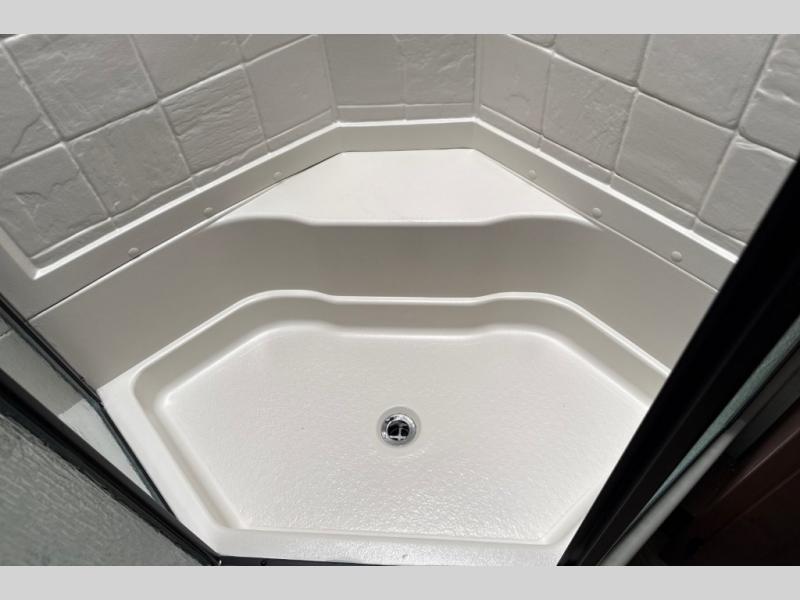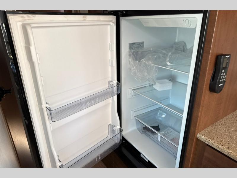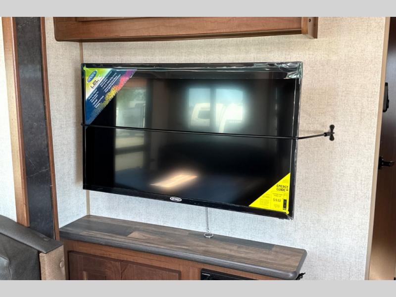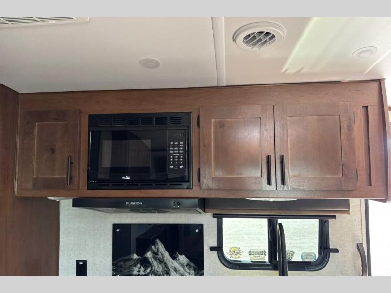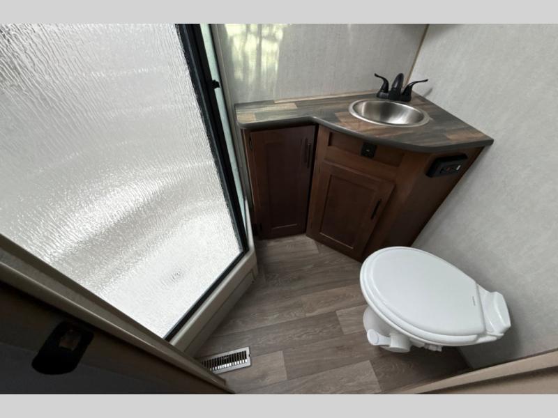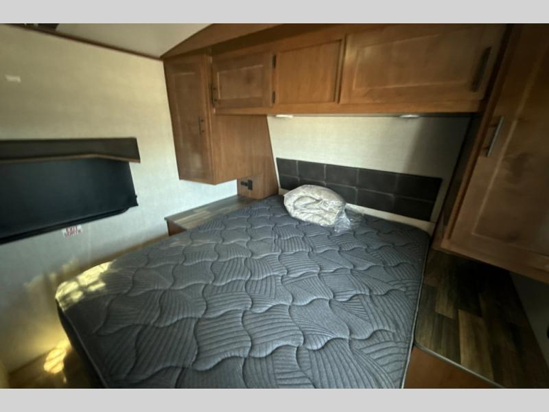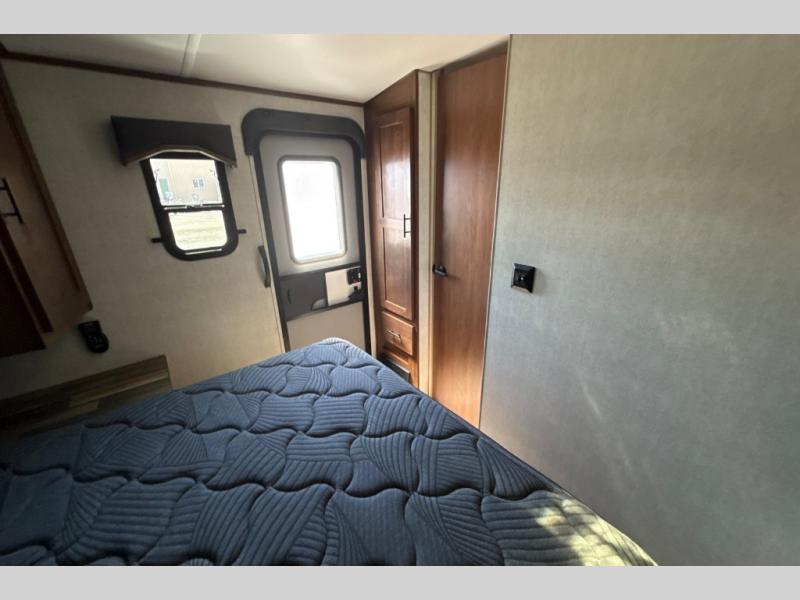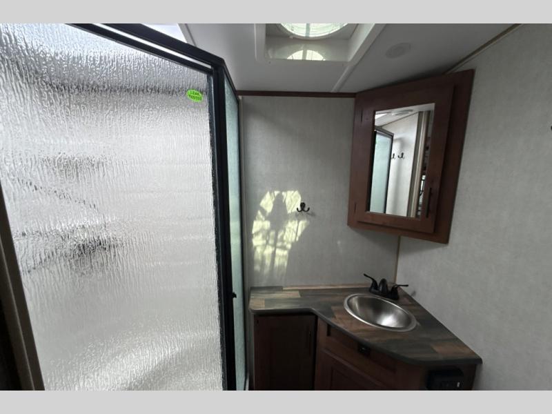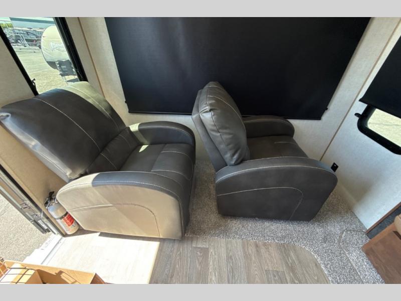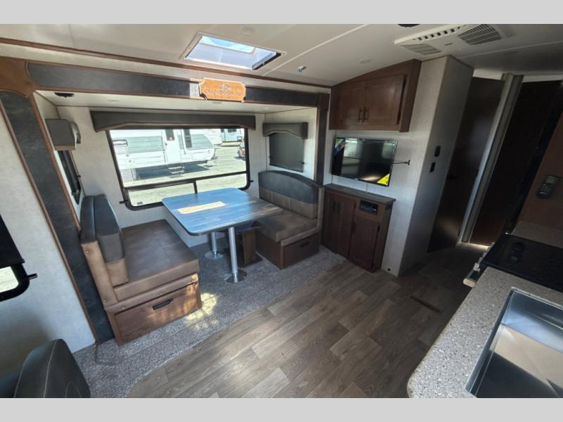 Head out to your favorite campsite in this roomy couple's trailer. There are dual entry doors, allowing you to enter in through the rear living area, or the front private bedroom. You can relax on the dual recliners after you've unpacked and maybe watch a show on the swing-out 32" TV. Once lunch is prepared on the three burner cooktop, you can dine at the mountain dinette with a skylight, or head outdoors to sit under the 21' awning. The queen bed is sure to bring comfort in the front bedroom, and if you have an overnight guest, they can sleep on the dinette!