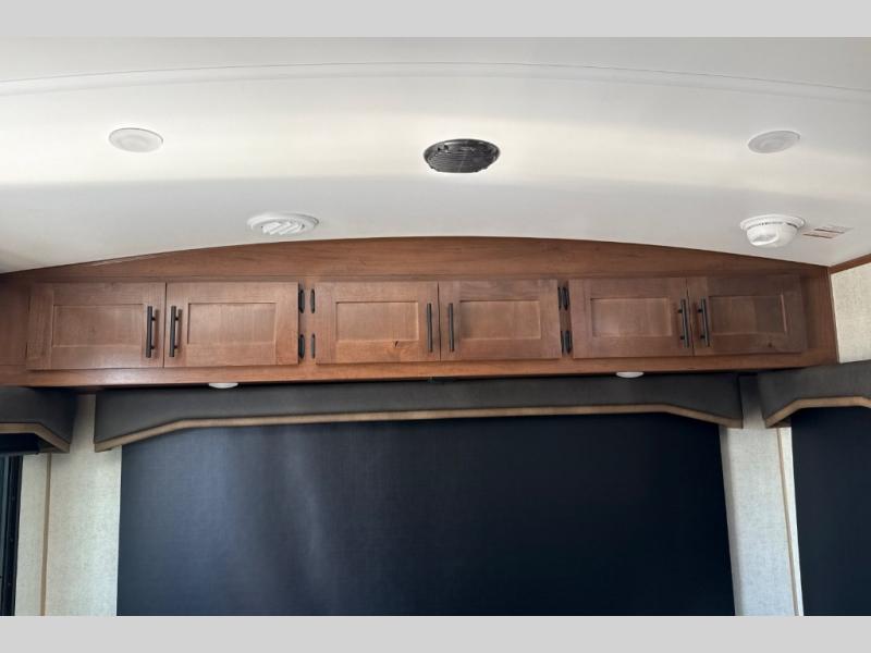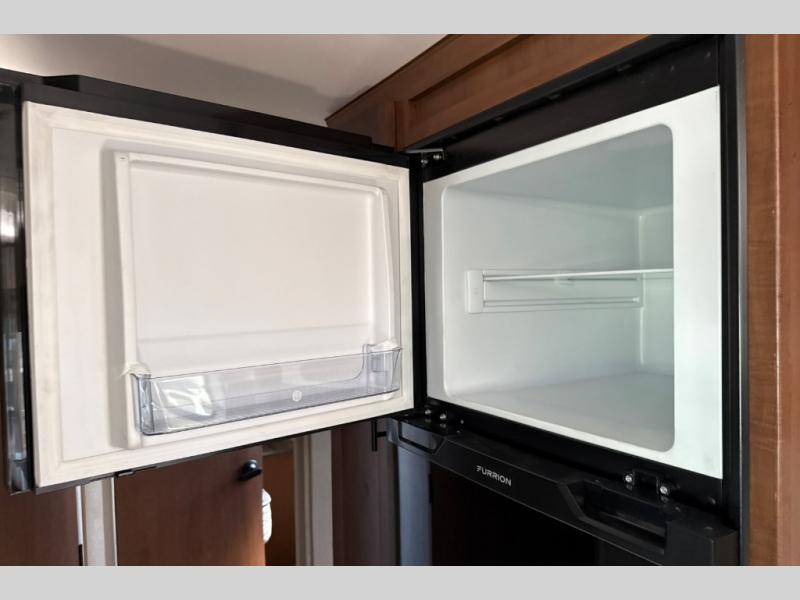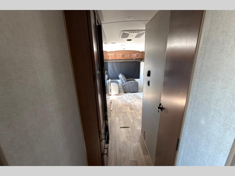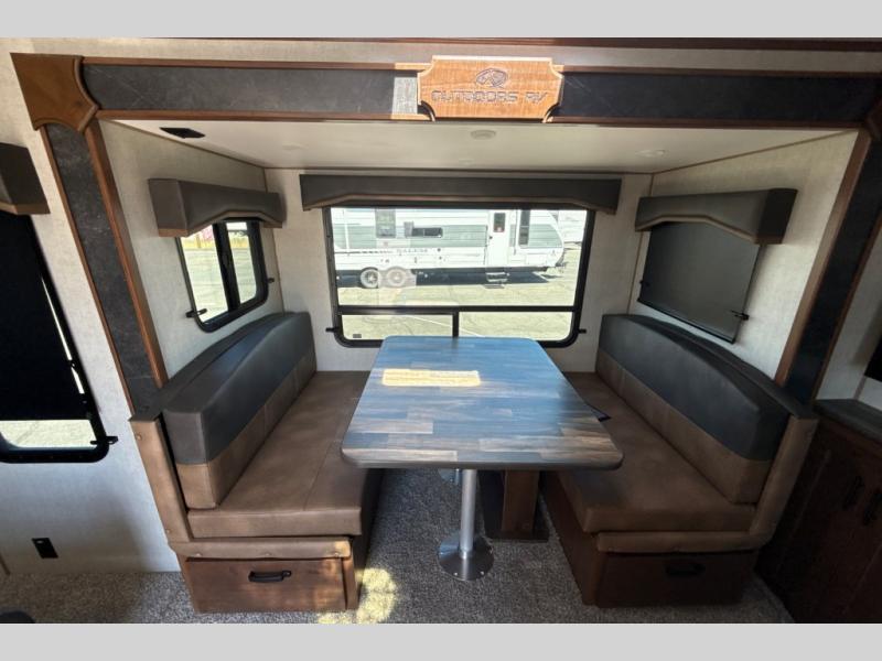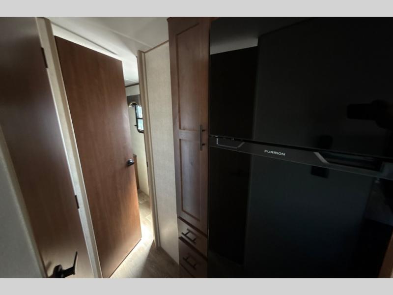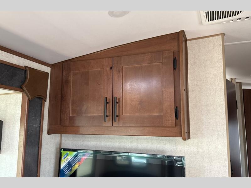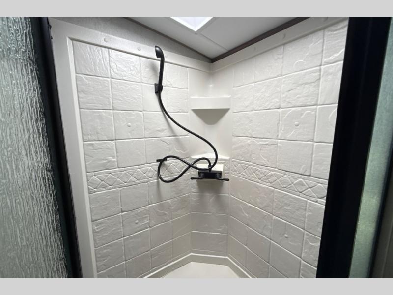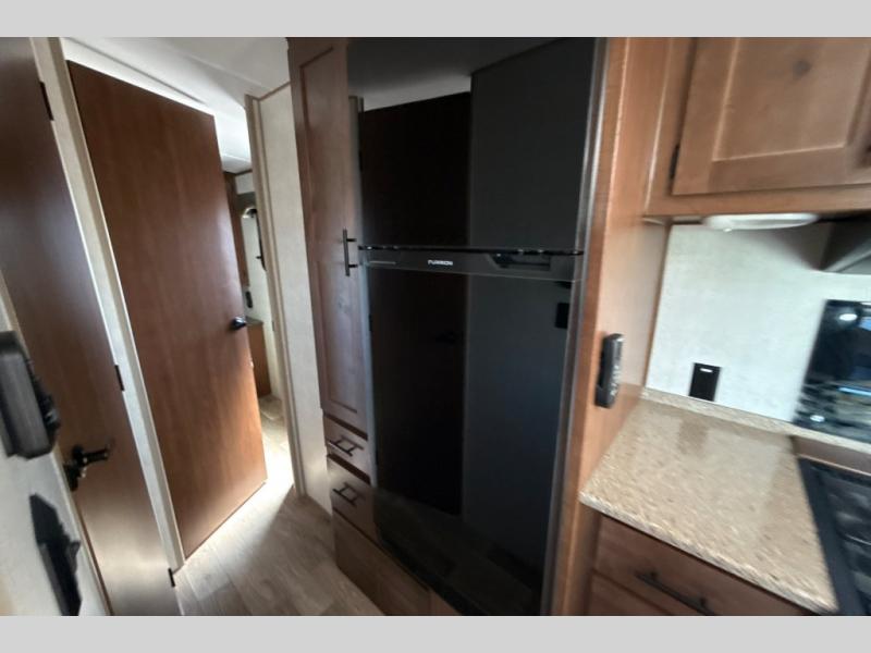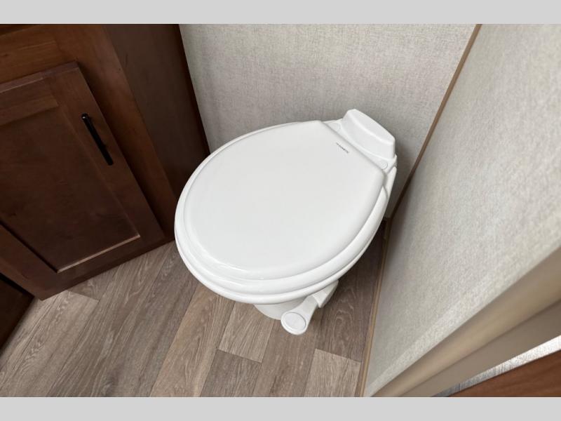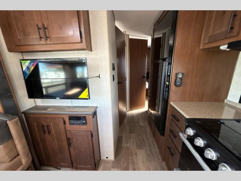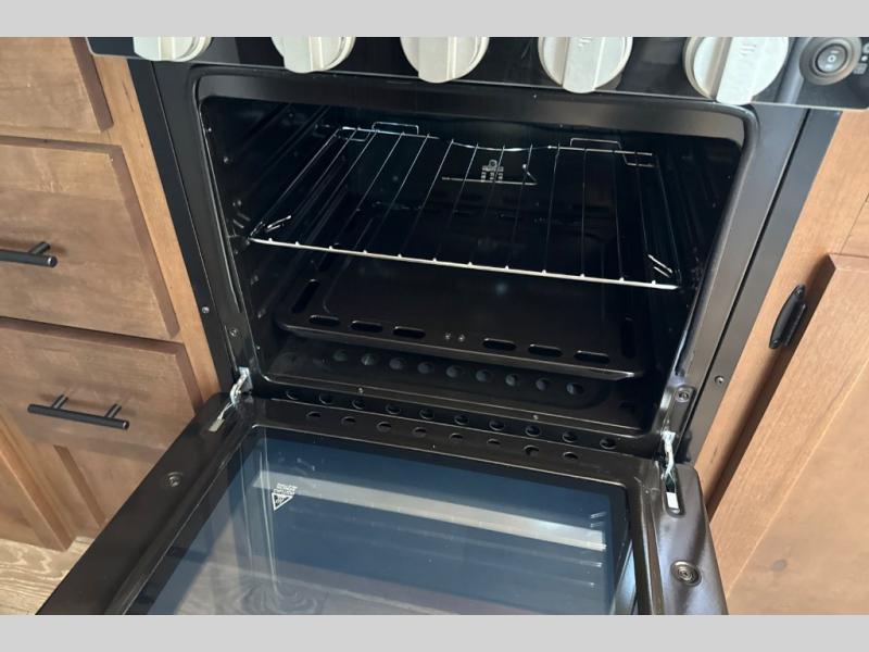 Head out to your favorite campsite in this roomy couple's trailer. There are dual entry doors, allowing you to enter in through the rear living area, or the front private bedroom. You can relax on the dual recliners after you've unpacked and maybe watch a show on the swing-out 32" TV. Once lunch is prepared on the three burner cooktop, you can dine at the mountain dinette with a skylight, or head outdoors to sit under the 21' awning. The queen bed is sure to bring comfort in the front bedroom, and if you have an overnight guest, they can sleep on the dinette!