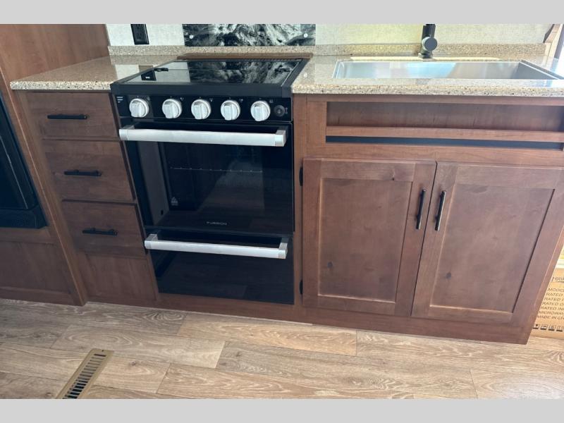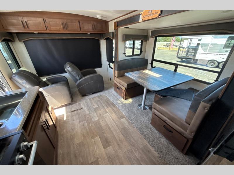 With any Timber Ridge Mountain Series travel trailer by Outdoors RV you will enjoy climate designed four seasons camping thanks to the thermal pane windows and the fully enclosed, heated, and insulated underbelly. The custom built chassis and rugged integrated A-frame are built for strength and durability, along with the rugged 2" bonded aluminum frame walls. Each model includes LG solid surface countertops, granite designed backsplash, vaulted radius ceilings, and a mountain comfort premium mattress for all-around comfort. You will also love the XL panoramic slide out windows and the dual pane living room skylight with a shade to let natural light in!