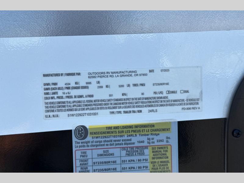 New 2026 Outdoors RV Timber Ridge Mountain Series 24RLS Travel Trailer