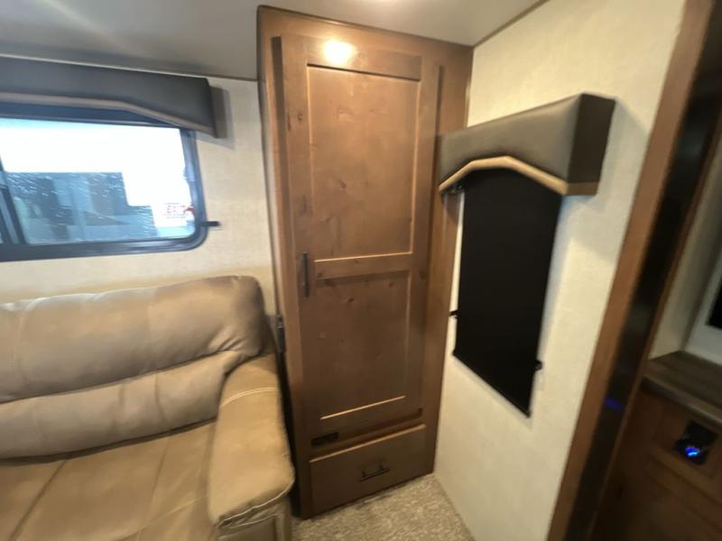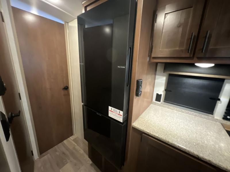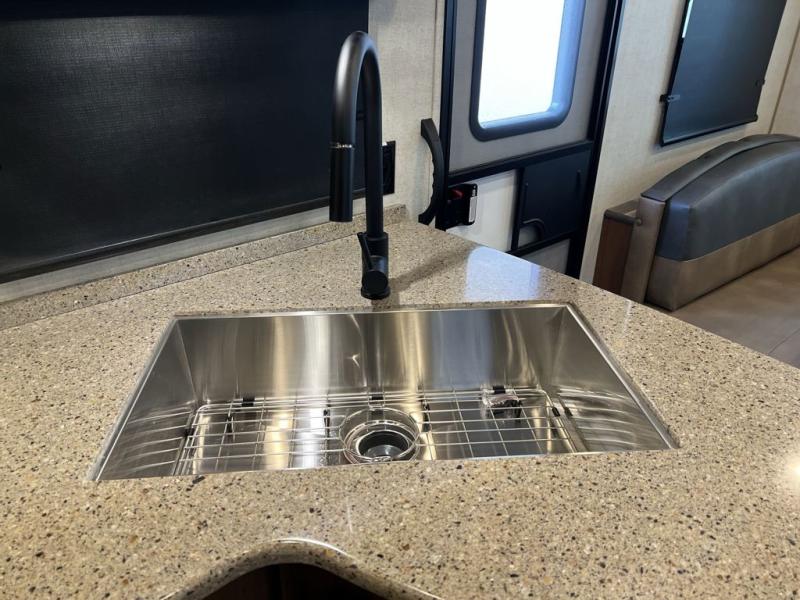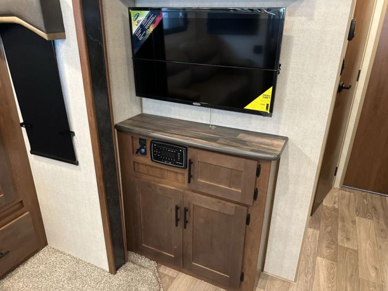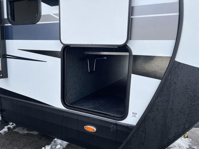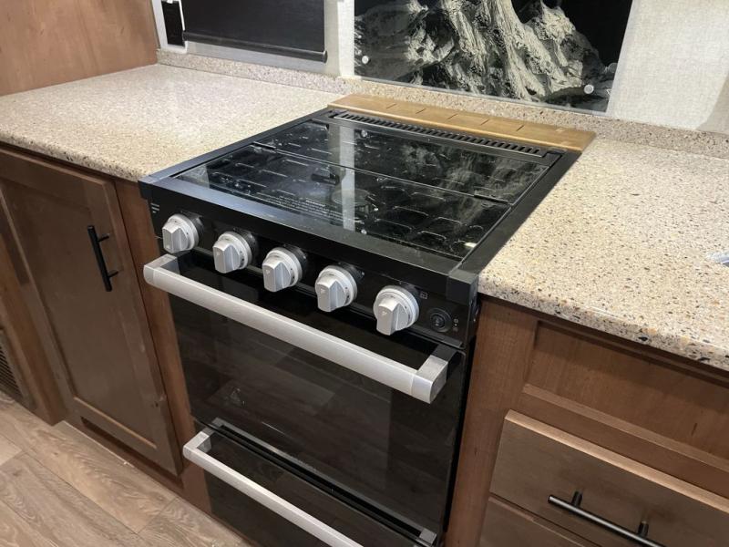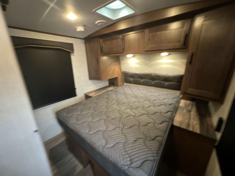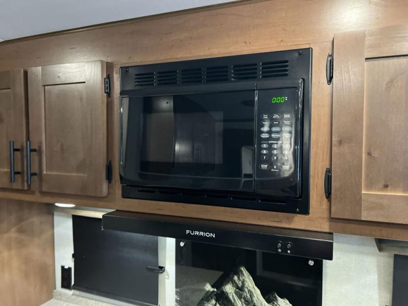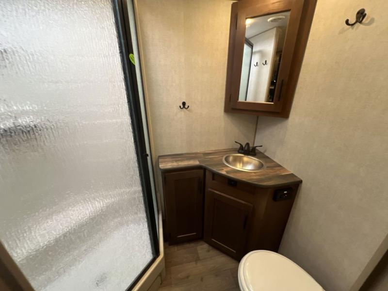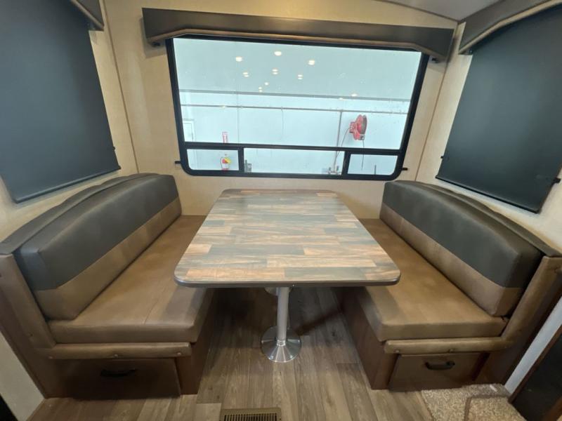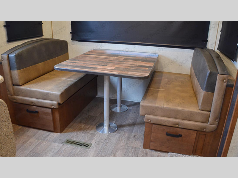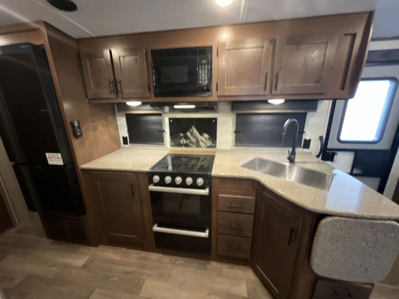 From the rear mountain dinette to the front private bedroom, you will love everything about this travel trailer. Use the flip-up counter in the kitchen for more prep space as you cook lunch, and the refrigerator will come in handy for your perishables. A sleeper sofa slide out will provide comfortable seating and sleeping space, or you may want to choose the optional residential sofa with built-in recliners. A full bath with a skylight ensures you won't have to use the camp's facilities, and a queen bed in the bedroom will provide a great night's rest!