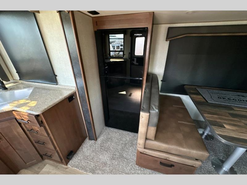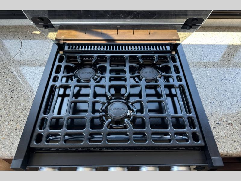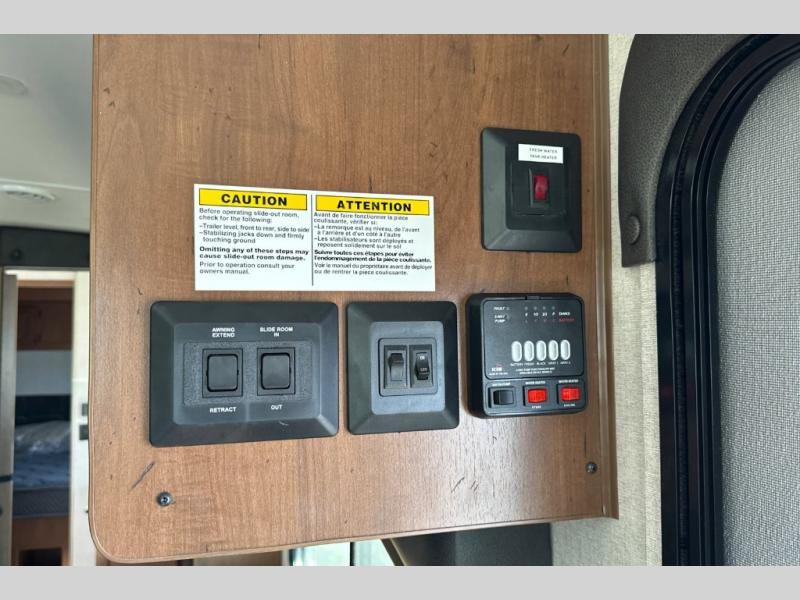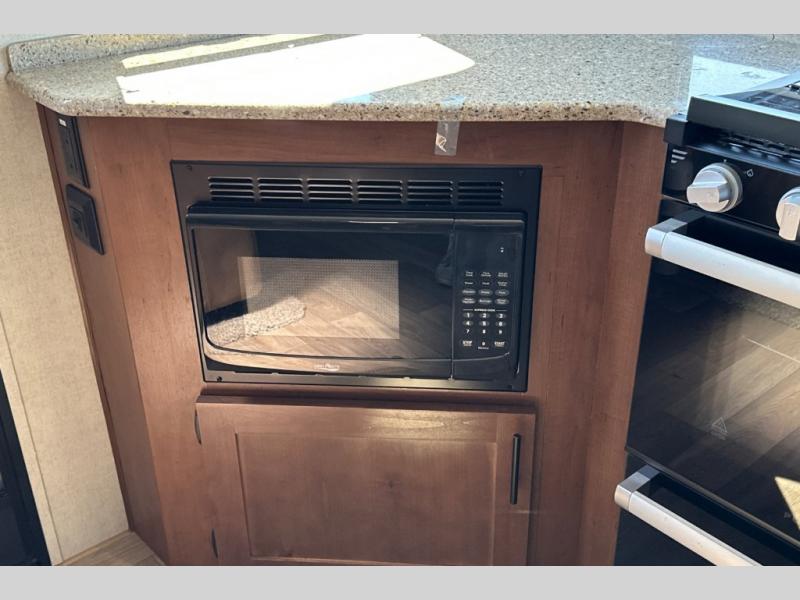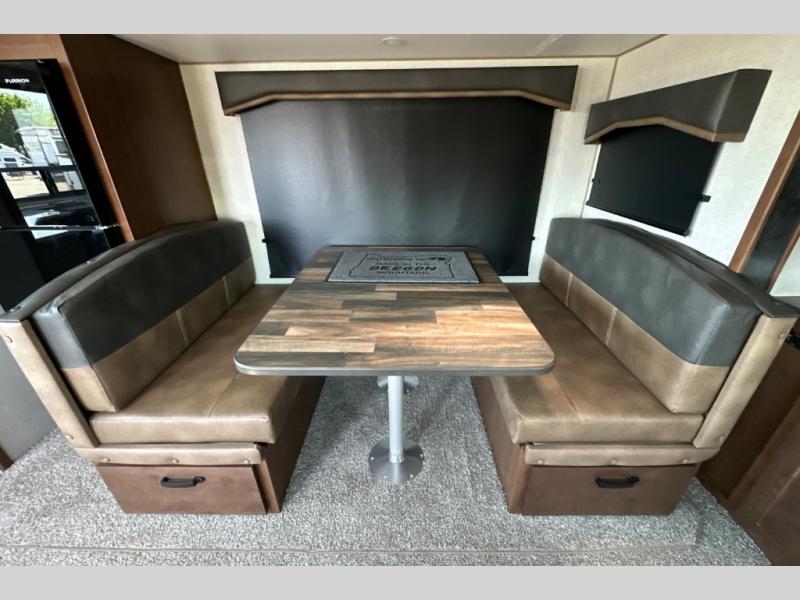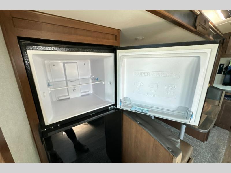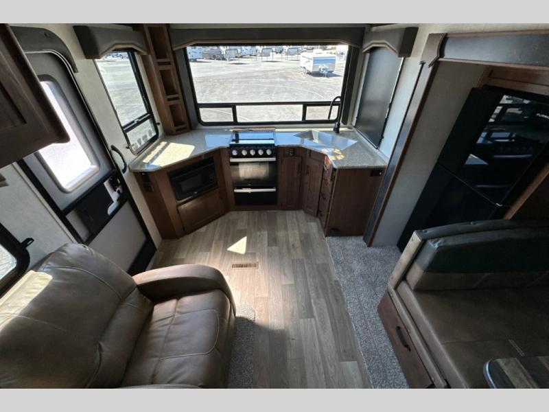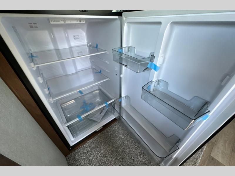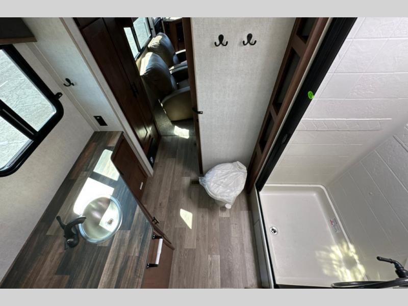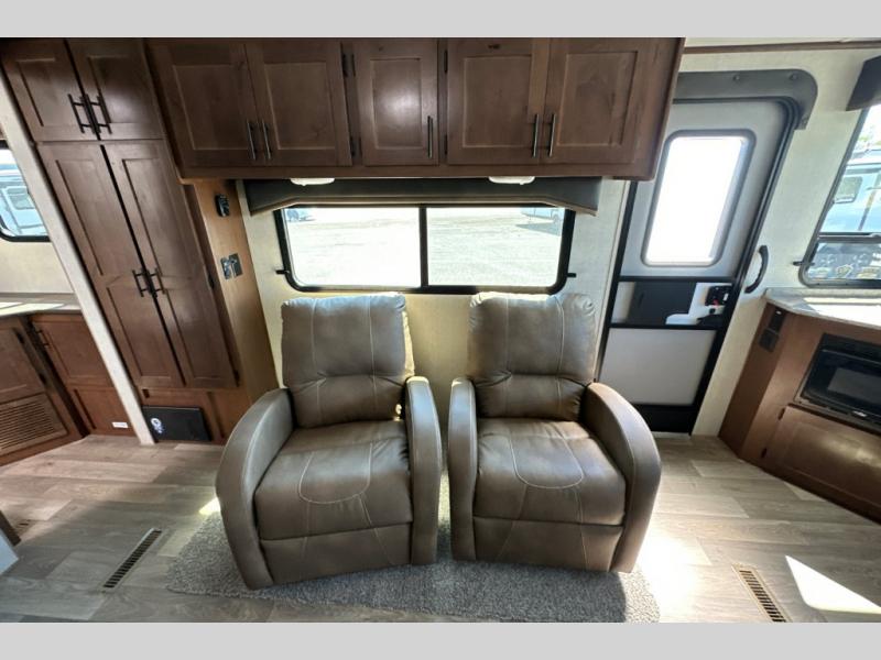 Pack your bags and escape the city life for weekend camping trips in this dual entry travel trailer. When you arrive at the campsite, take a hike to stretch your legs, then come back to prepare lunch on the three burner cooktop. You'll find plenty of counter space in the kitchen, plus a refrigerator for cold drinks and perishables. The dual lounge chairs will have you feeling right at home, or you can choose the optional sofa with built-in recliners, or the optional sleeper sofa if you need more sleeping space. This model includes a walk-through bath that is both spacious and convenient since it leads to to the front master bedroom. You can't beat a queen bed, dual bedroom wardrobes, and your own exterior entry door!