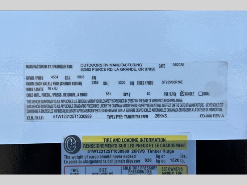 New 2026 Outdoors RV Timber Ridge Mountain Series 26KVS Travel Trailer