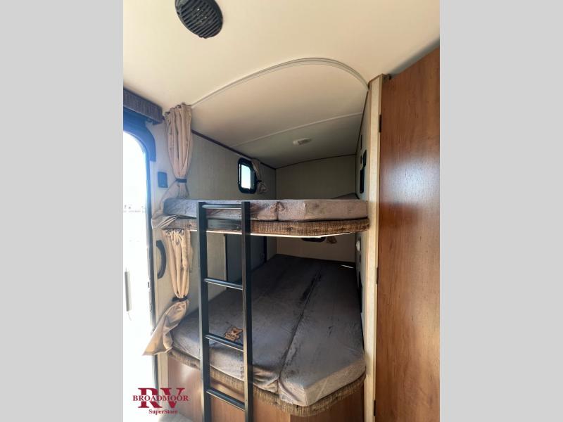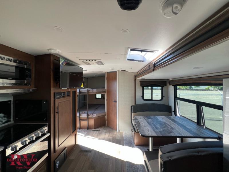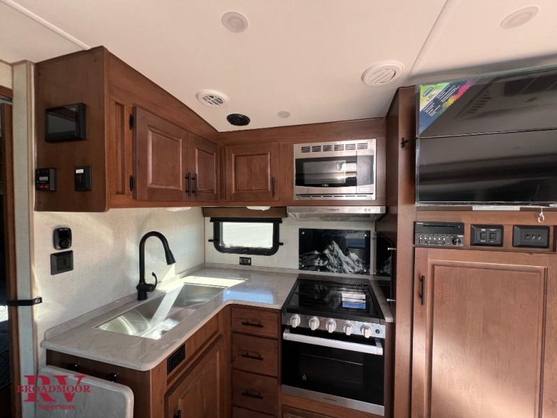 How does double-size bunks sound for your next camping trip? The kids or your guests are sure to love them, while you enjoy the queen bed in the front bedroom. There is a garage storage door that will be perfect for luggage, lawn chairs, and coolers, plus there is plenty of storage inside as well. The chef of your group will love cooking in the kitchen with its flip-up counter, three burner cooktop, and skylight for natural light. The mountain dinette slide in the main living area will provide space to let the dog rest on the floor, and there is a 40" TV for movie night!
