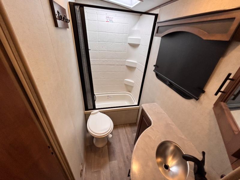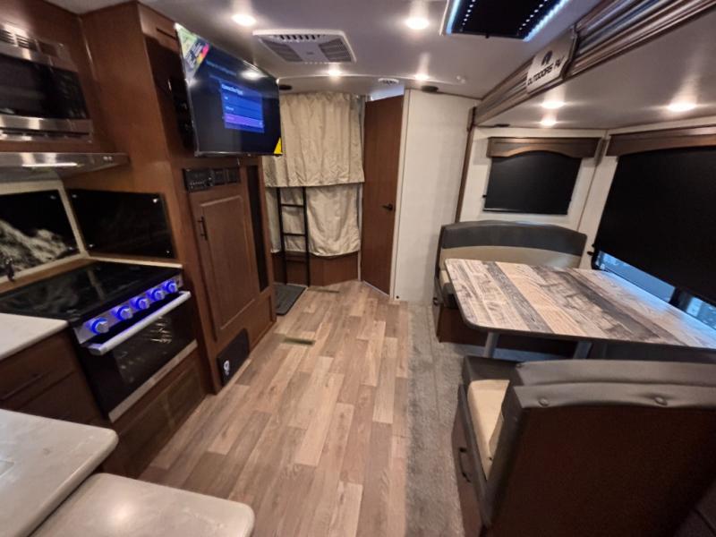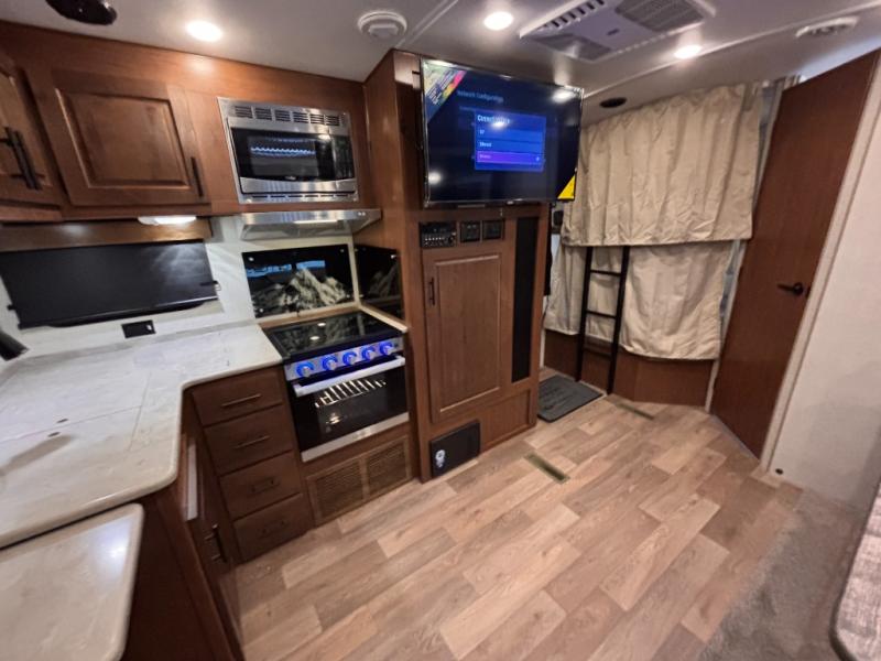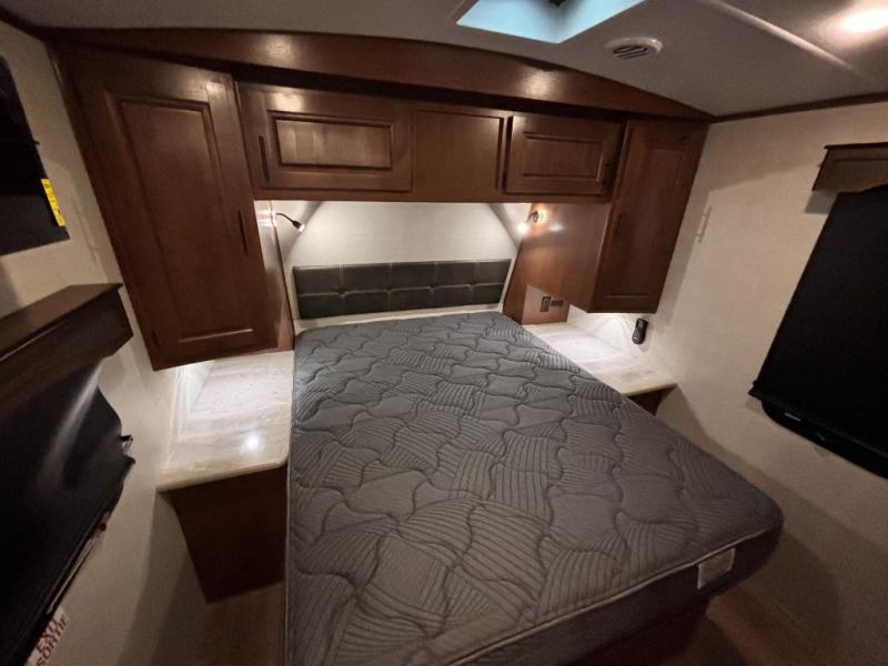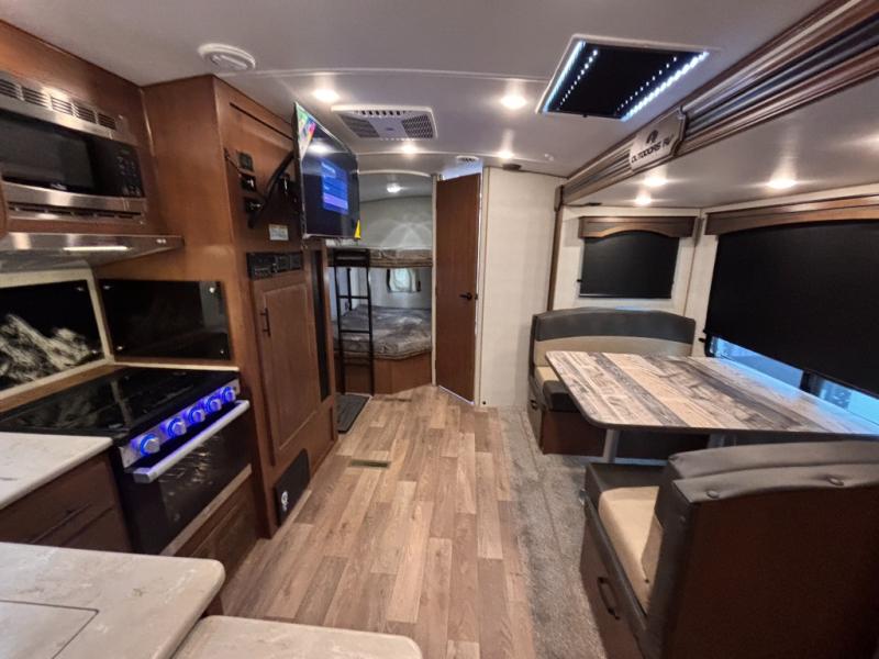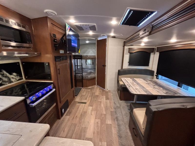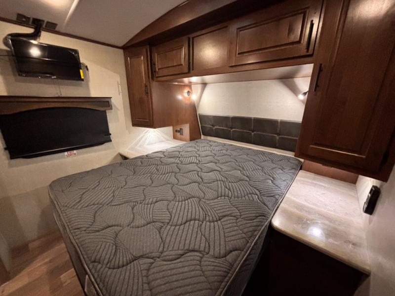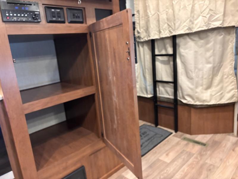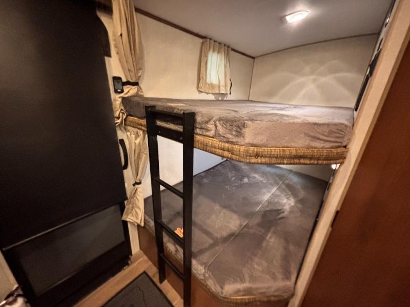 How does double-size bunks sound for your next camping trip? The kids or your guests are sure to love them, while you enjoy the queen bed in the front bedroom. There is a garage storage door that will be perfect for luggage, lawn chairs, and coolers, plus there is plenty of storage inside as well. The chef of your group will love cooking in the kitchen with its flip-up counter, three burner cooktop, and skylight for natural light. The mountain dinette slide in the main living area will provide space to let the dog rest on the floor, and there is a 40" TV for movie night!
