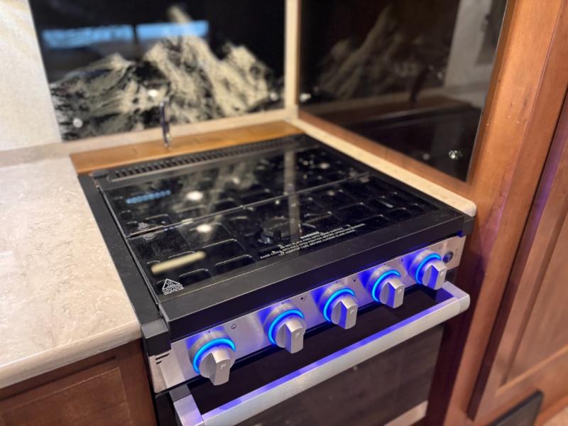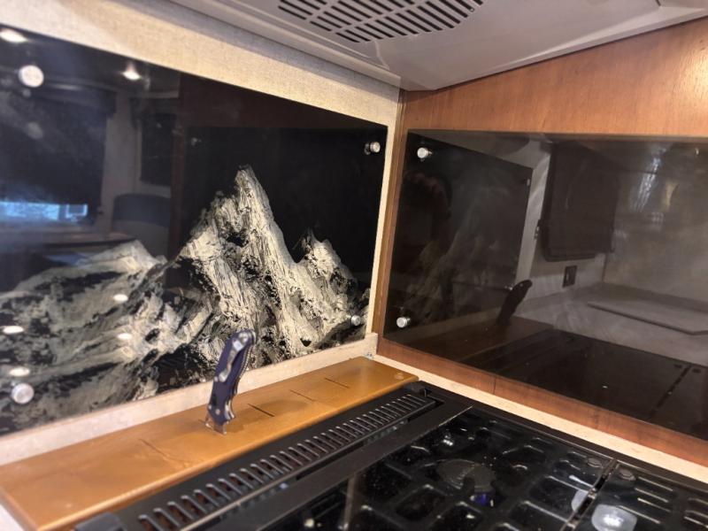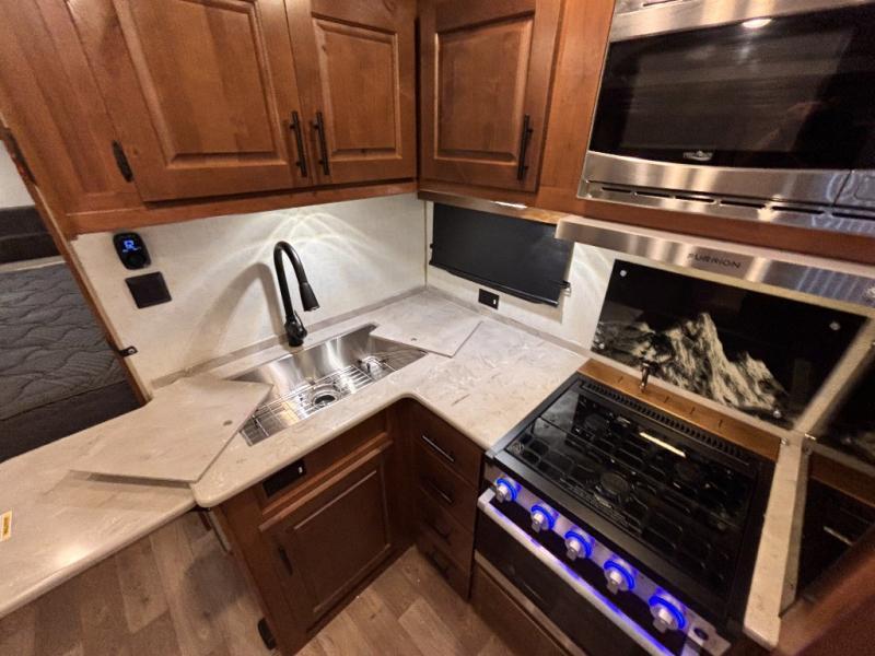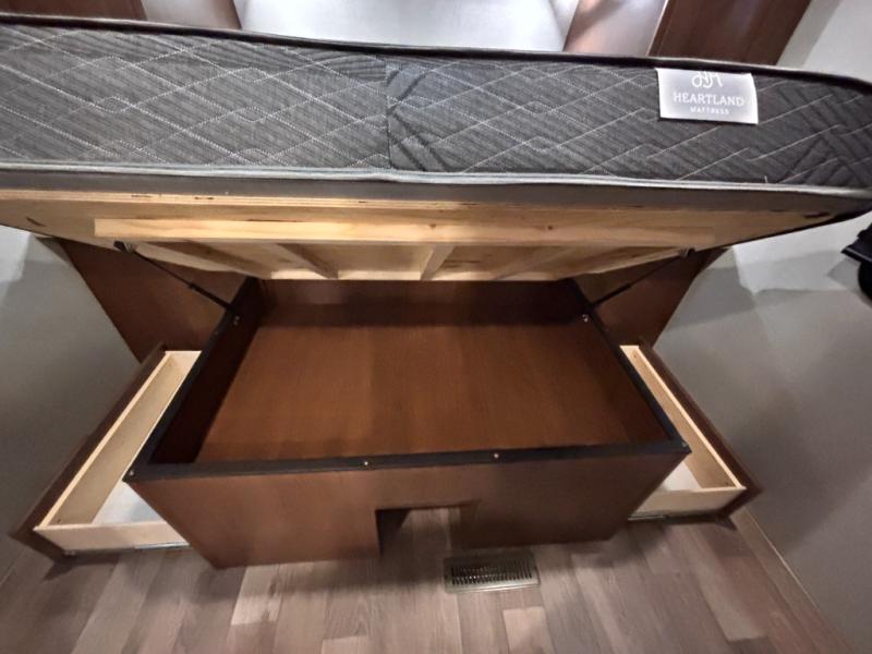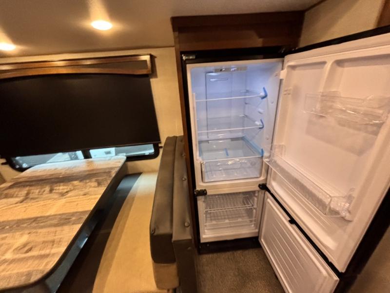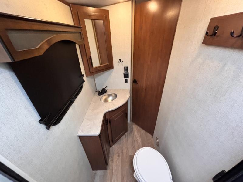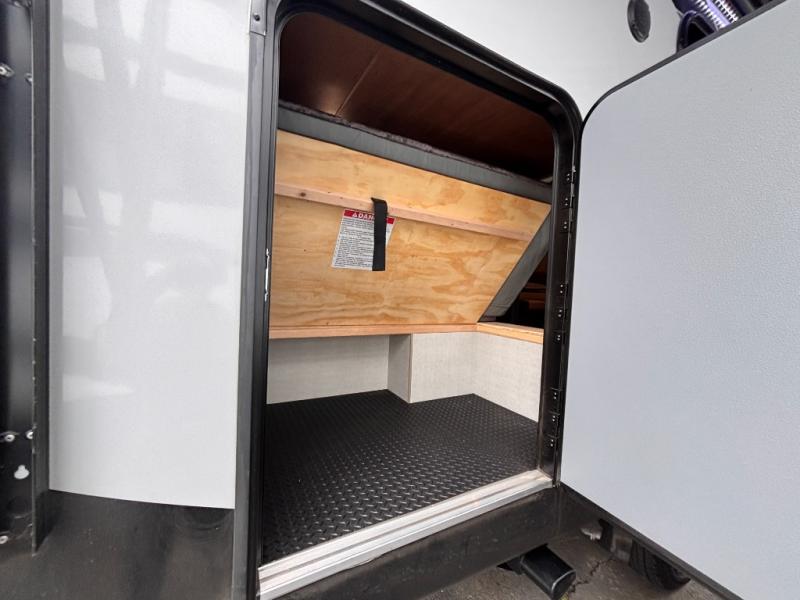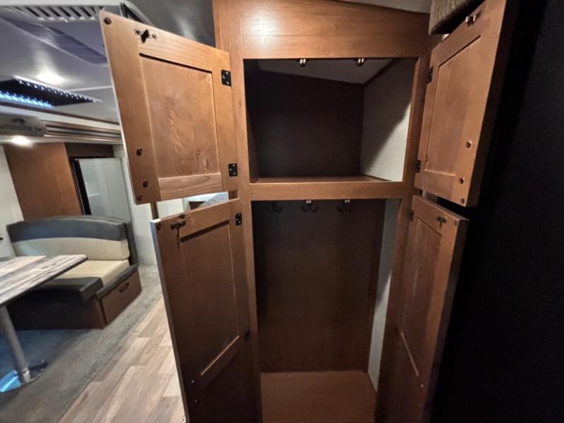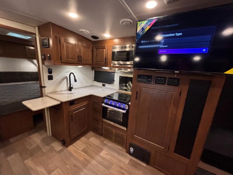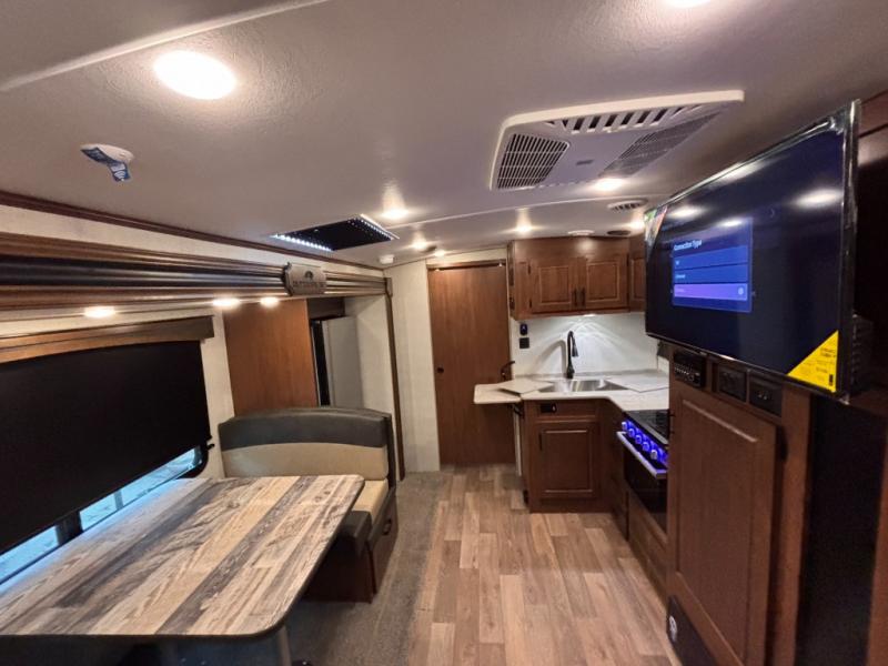 How does double-size bunks sound for your next camping trip? The kids or your guests are sure to love them, while you enjoy the queen bed in the front bedroom. There is a garage storage door that will be perfect for luggage, lawn chairs, and coolers, plus there is plenty of storage inside as well. The chef of your group will love cooking in the kitchen with its flip-up counter, three burner cooktop, and skylight for natural light. The mountain dinette slide in the main living area will provide space to let the dog rest on the floor, and there is a 40" TV for movie night!