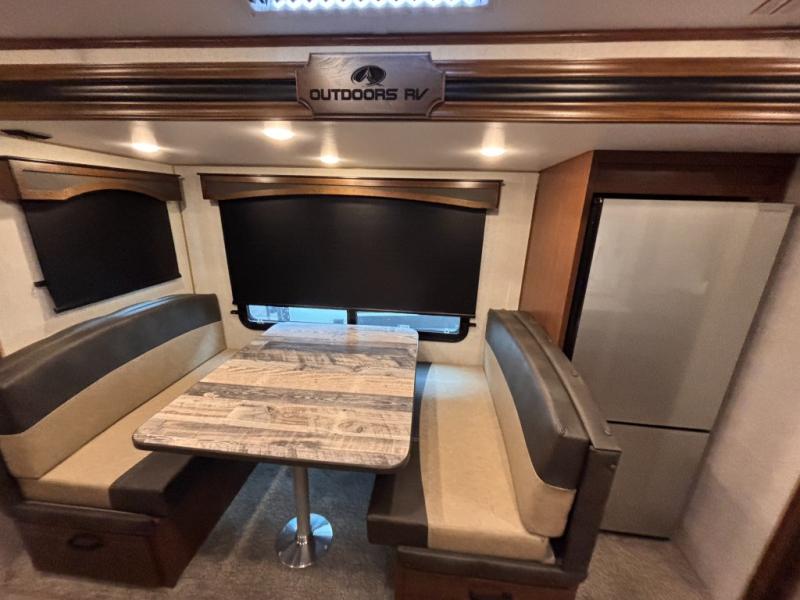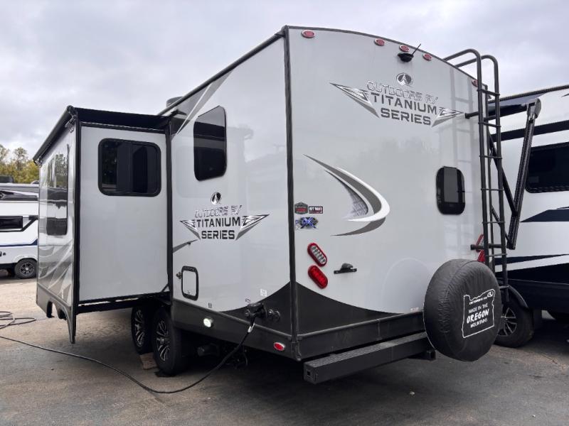 With any Timber Ridge Titanium Series travel trailer by Outdoors RV you will enjoy the sleek design frameless thermal pane windows, along with the silver fiberglass front cap and Titanium Series graphics package. The rugged 8' chassis with 5,100 lb. axles and XL ground clearance will make maneuvering tougher terrain easier than ever, and there is a wireless rear, side(s) turn camera system for hassle-free parking. Each model includes LG solid surface countertops, mountain lodge interiors, hardwood slide out fascia(s), and many more comforts!