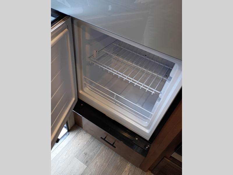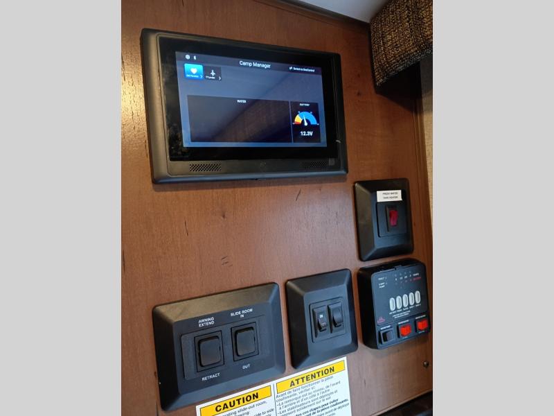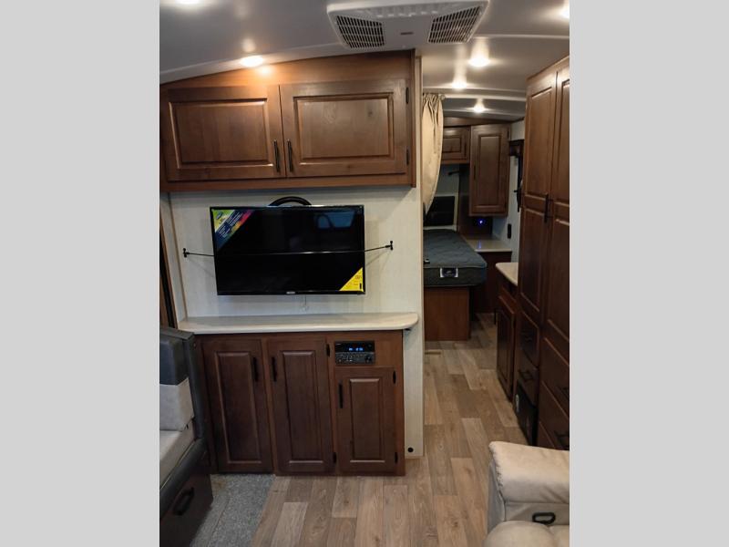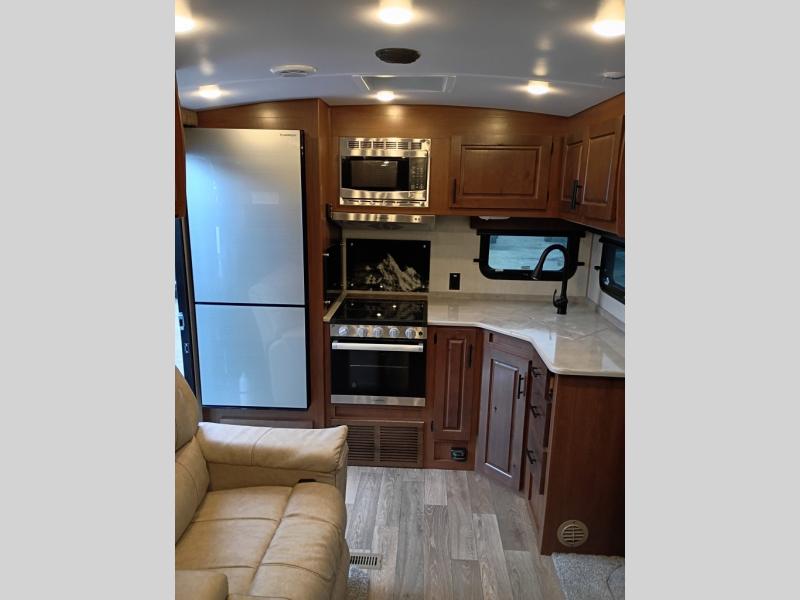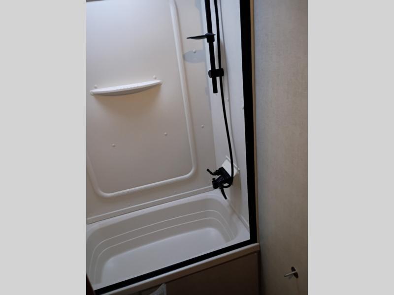 Dual entry doors in this travel trailer will allow you to enter in through the rear kitchen, or in the front bedroom for convenience. You will love having a queen bed to sleep on and dual bedroom wardrobes to keep your clothes wrinkle-free. Get cleaned up in the full bath that includes a shower skylight, then head to the rear kitchen to prepare breakfast on the three burner cooktop. Your crew can sit at the mountain dinette slide or relax on the sleeper sofa before heading out for the day. This model also includes a large wardrobe with drawers and a pantry for tons of storage space.