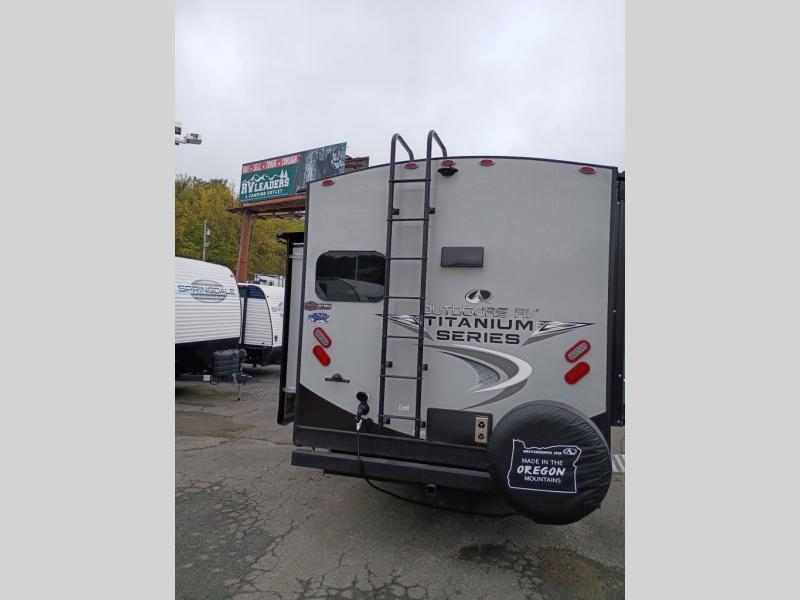 With any Timber Ridge Titanium Series travel trailer by Outdoors RV you will enjoy the sleek design frameless thermal pane windows, along with the silver fiberglass front cap and Titanium Series graphics package. The rugged 8' chassis with 5,100 lb. axles and XL ground clearance will make maneuvering tougher terrain easier than ever, and there is a wireless rear, side(s) turn camera system for hassle-free parking. Each model includes LG solid surface countertops, mountain lodge interiors, hardwood slide out fascia(s), and many more comforts!