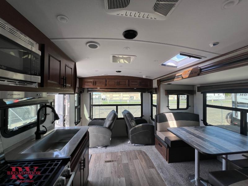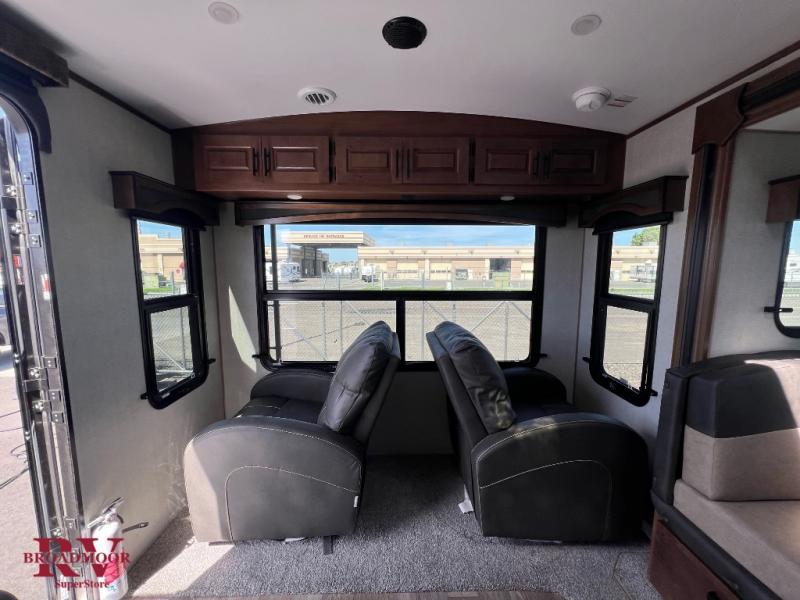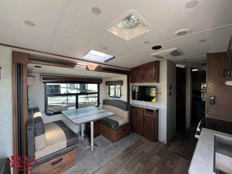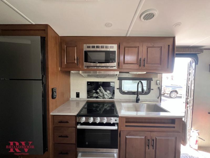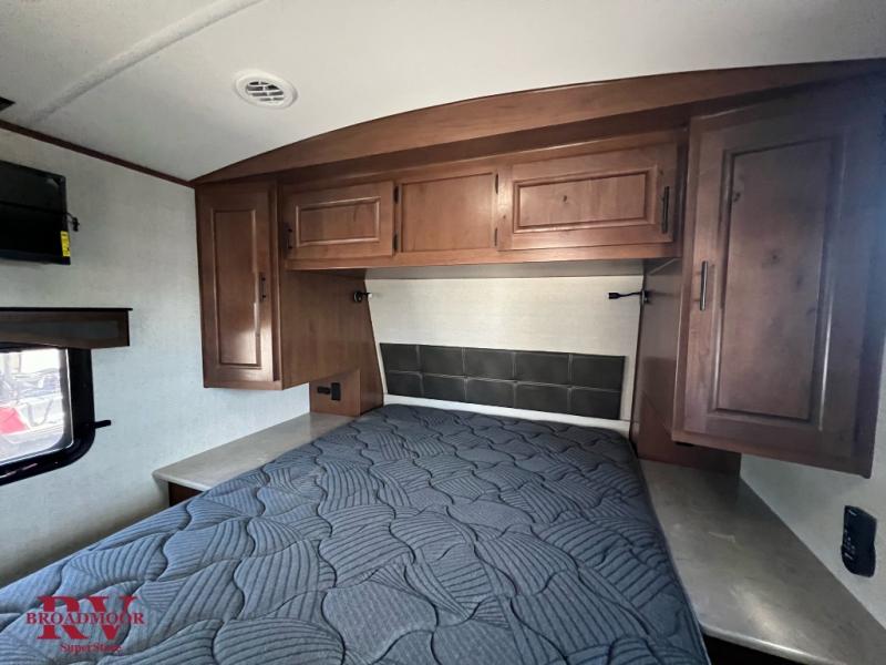 Head out to your favorite campsite in this roomy couple's trailer. There are dual entry doors, allowing you to enter in through the rear living area, or the front private bedroom. You can relax on the dual recliners after you've unpacked and maybe watch a show on the swing-out 32" TV. Once lunch is prepared on the three burner cooktop, you can dine at the mountain dinette or head outdoors to sit under the 21' awning. The queen bed is sure to bring comfort in the front bedroom, and if you have an overnight guest, they can sleep on the dinette!