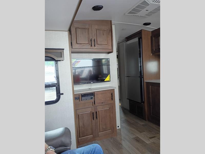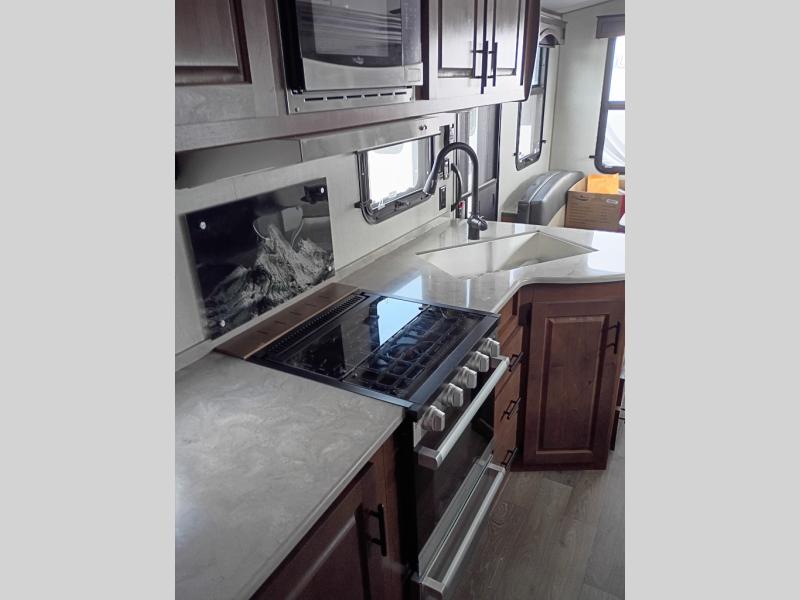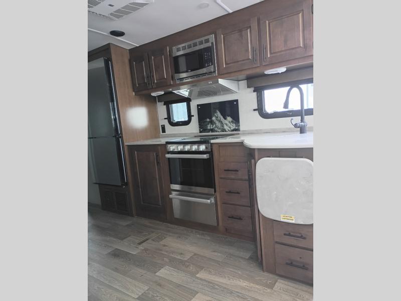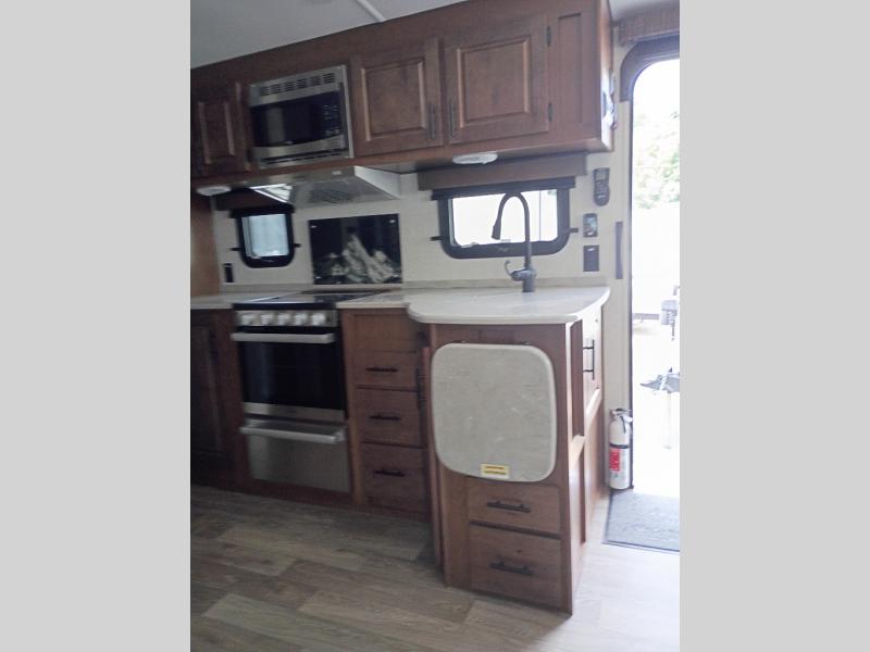 From the rear mountain dinette to the front private bedroom, you will love everything about this travel trailer. Use the flip-up counter in the kitchen for more prep space as you cook lunch, and the 10 cu. ft. refrigerator will come in handy for your perishables. A sleeper sofa slide out will provide comfortable seating and sleeping space, or you may want to choose the optional residential sofa with built-in recliners. A full bath ensures you won't have to use the camp's facilities, and a queen bed in the bedroom will provide a great night's rest!