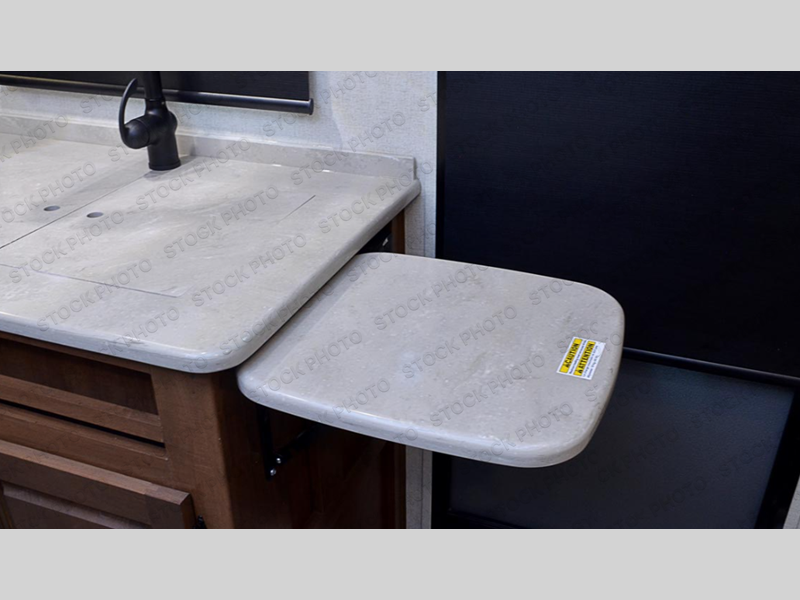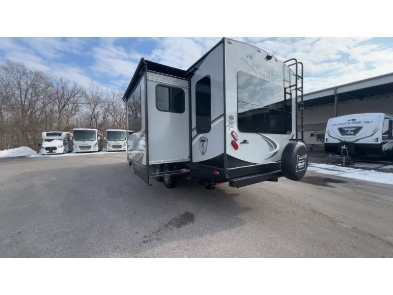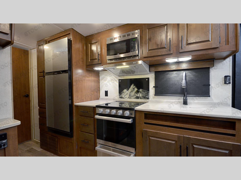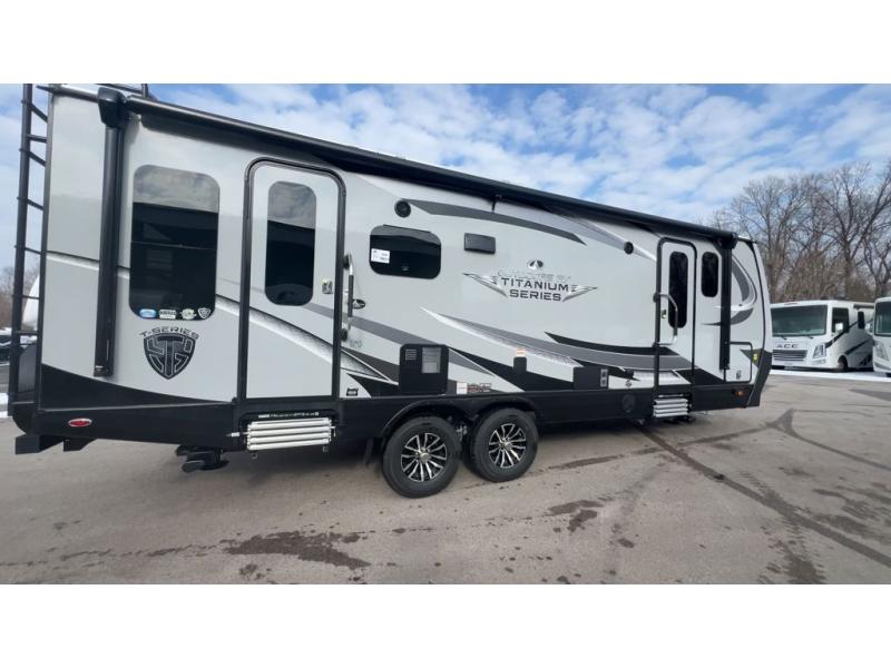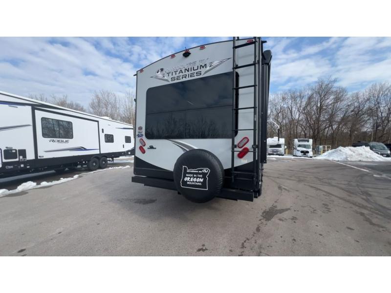 With any Timber Ridge Titanium Series travel trailer by Outdoors RV you will enjoy the sleek design frameless thermal pane windows, along with the silver fiberglass front cap and Titanium Series graphics package. The rugged 8' chassis with 5,100 lb. axles and XL ground clearance will make maneuvering tougher terrain easier than ever, and there is a wireless rear, side(s) turn camera system for hassle-free parking. Each model includes LG solid surface countertops, mountain lodge interiors, hardwood slide out fascia(s), and many more comforts!