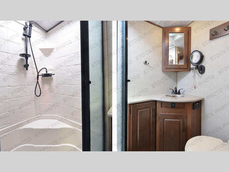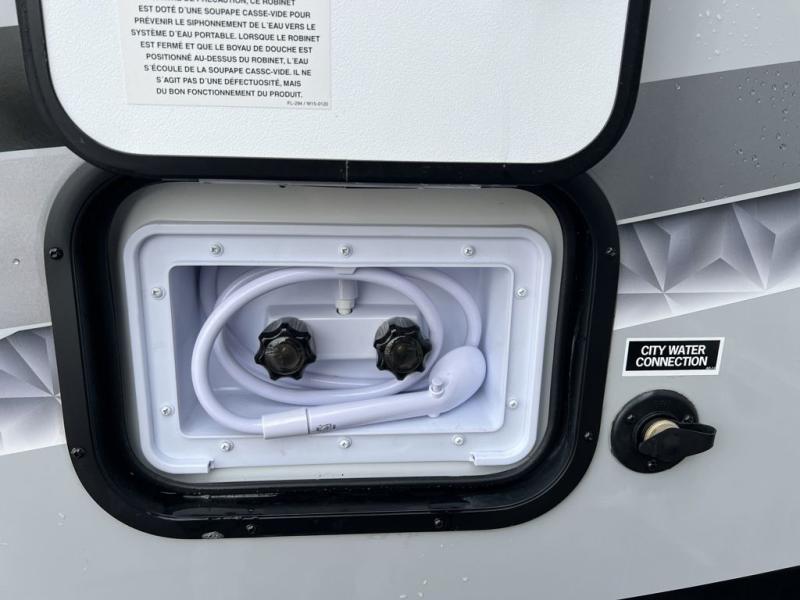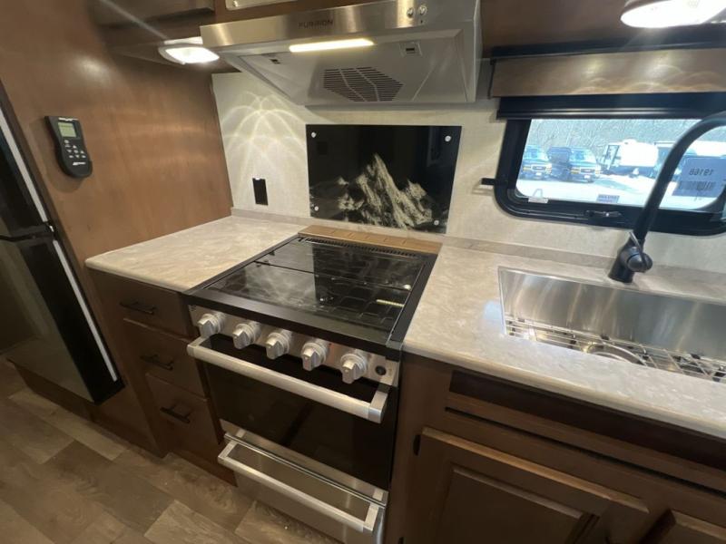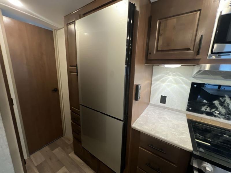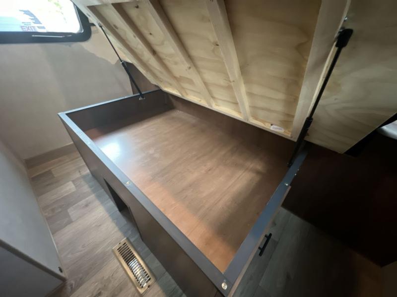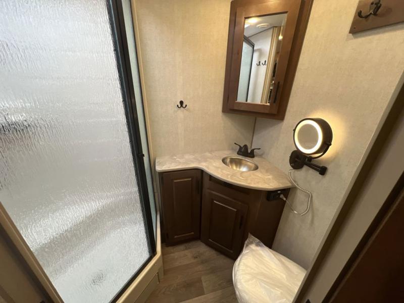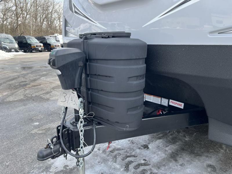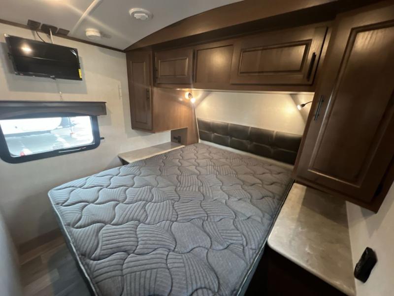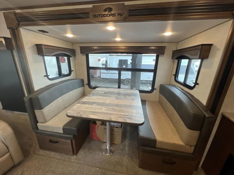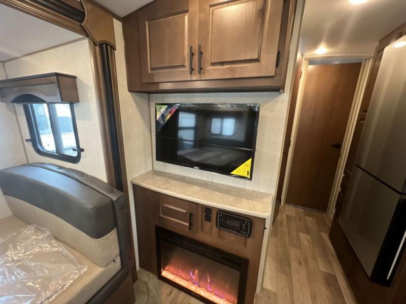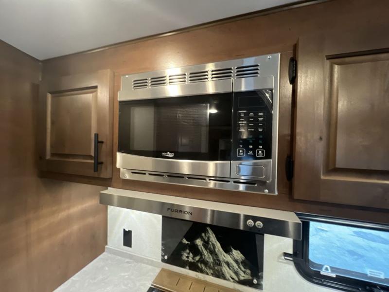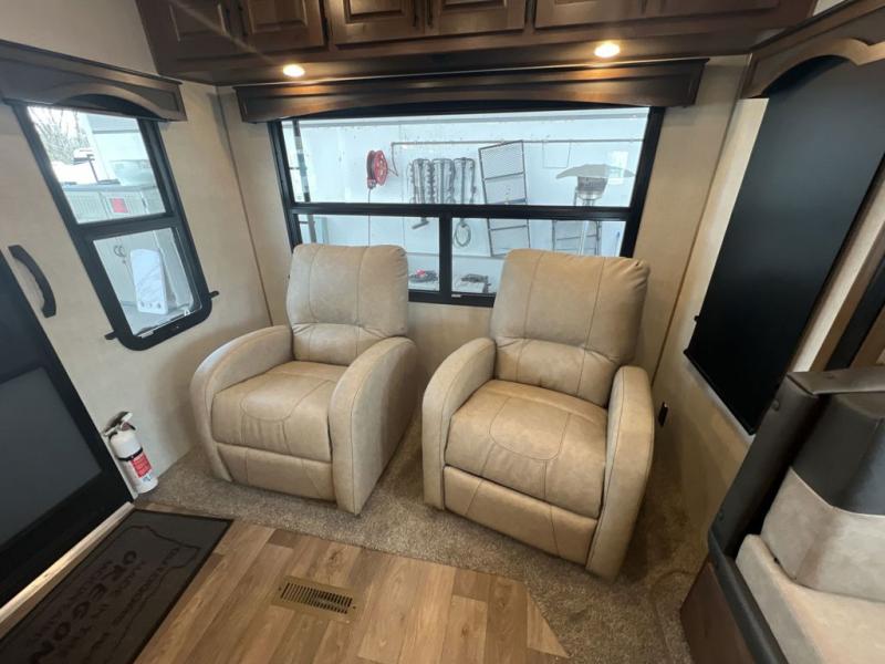 Head out to your favorite campsite in this roomy couple's trailer. There are dual entry doors, allowing you to enter in through the rear living area, or the front private bedroom. You can relax on the free-standing recliners after you've unpacked and maybe watch a show on the swing-out 32" TV. And an optional residential sofa with built-in recliners in place of the recliners is available here if you'd prefer that seating set up! Once lunch is prepared on the three burner cooktop, you can dine at the mountain dinette with a skylight, or head outdoors to sit under the 21' awning. The queen bed is sure to bring comfort in the front bedroom, and if you have an overnight guest, they can sleep on the dinette!
