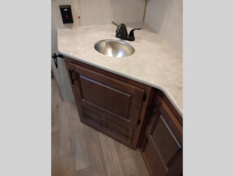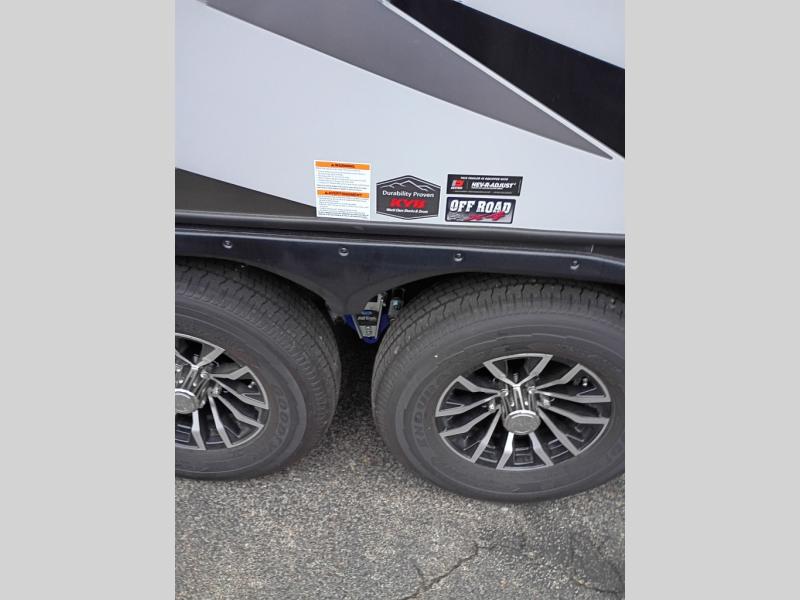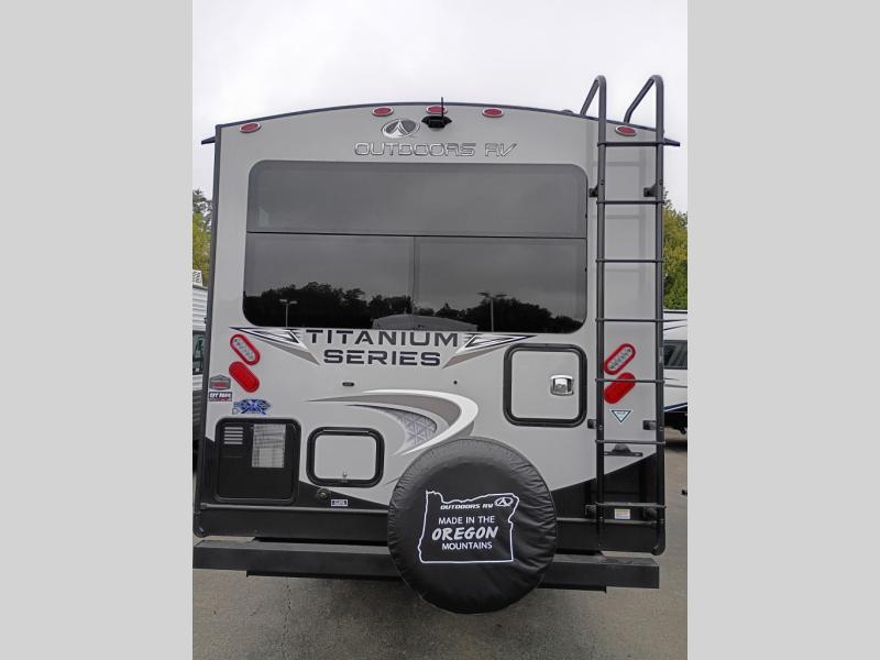 With any Timber Ridge Titanium Series travel trailer by Outdoors RV you will enjoy the sleek design frameless thermal pane windows, along with the silver fiberglass front cap and Titanium Series graphics package. The rugged 8' chassis with 5,100 lb. axles and XL ground clearance will make maneuvering tougher terrain easier than ever, and there is a wireless rear, side(s) turn camera system for hassle-free parking. Each model includes LG solid surface countertops, mountain lodge interiors, hardwood slide out fascia(s), and many more comforts!
